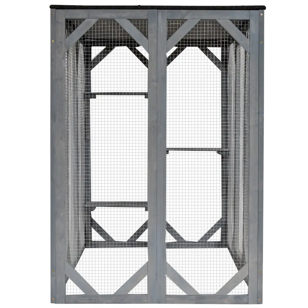 Roomfitters Outdoor Cat House offers a safe and spacious environment for your cats to enjoy nature. Featuring a durable roof, large walk-in door, 2 bridges, 2 sleeping houses, 7 cat walks, and sliding doors for added versatility. Perfect for rain or shine, it provides comfort, entertainment, and easy access for feeding and cleaning.