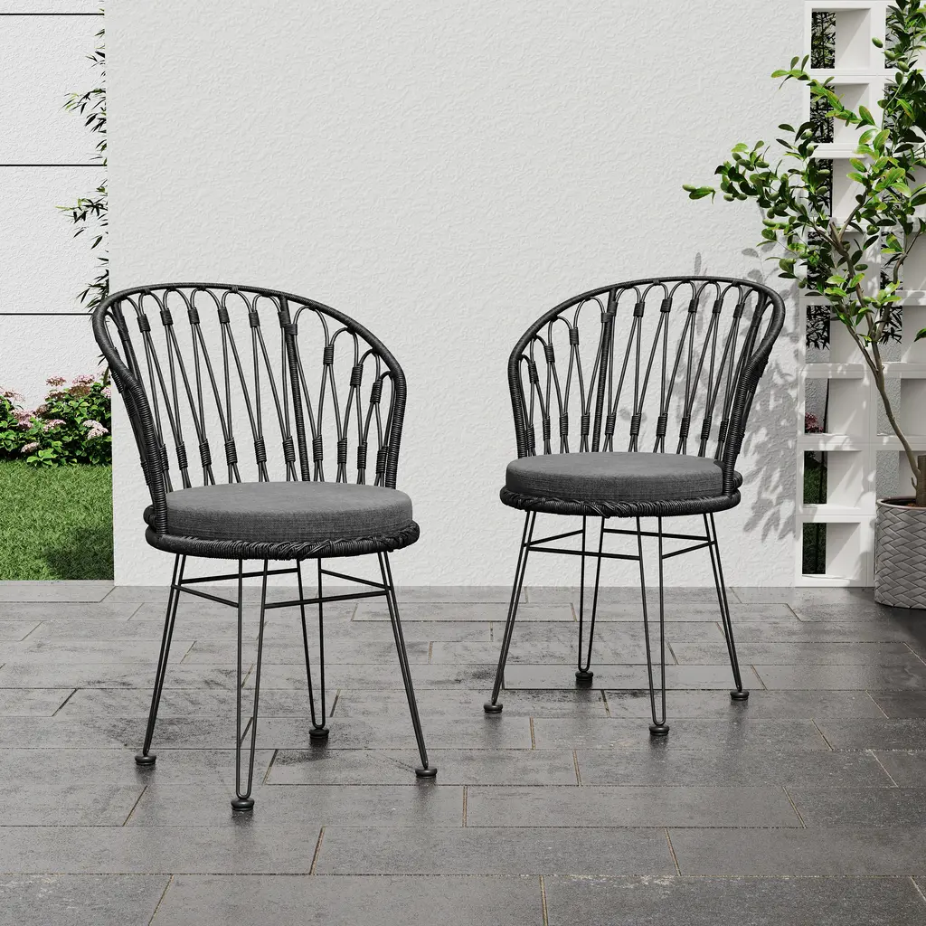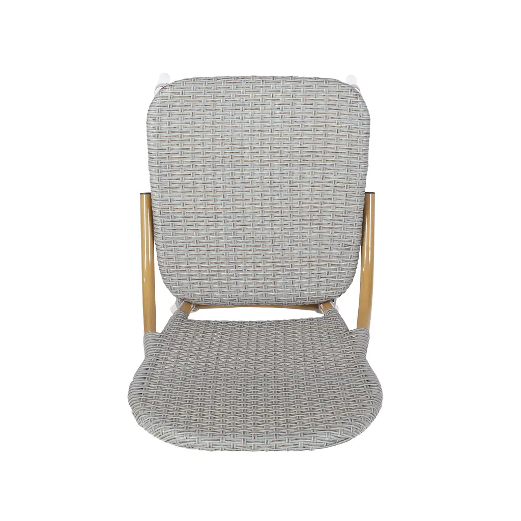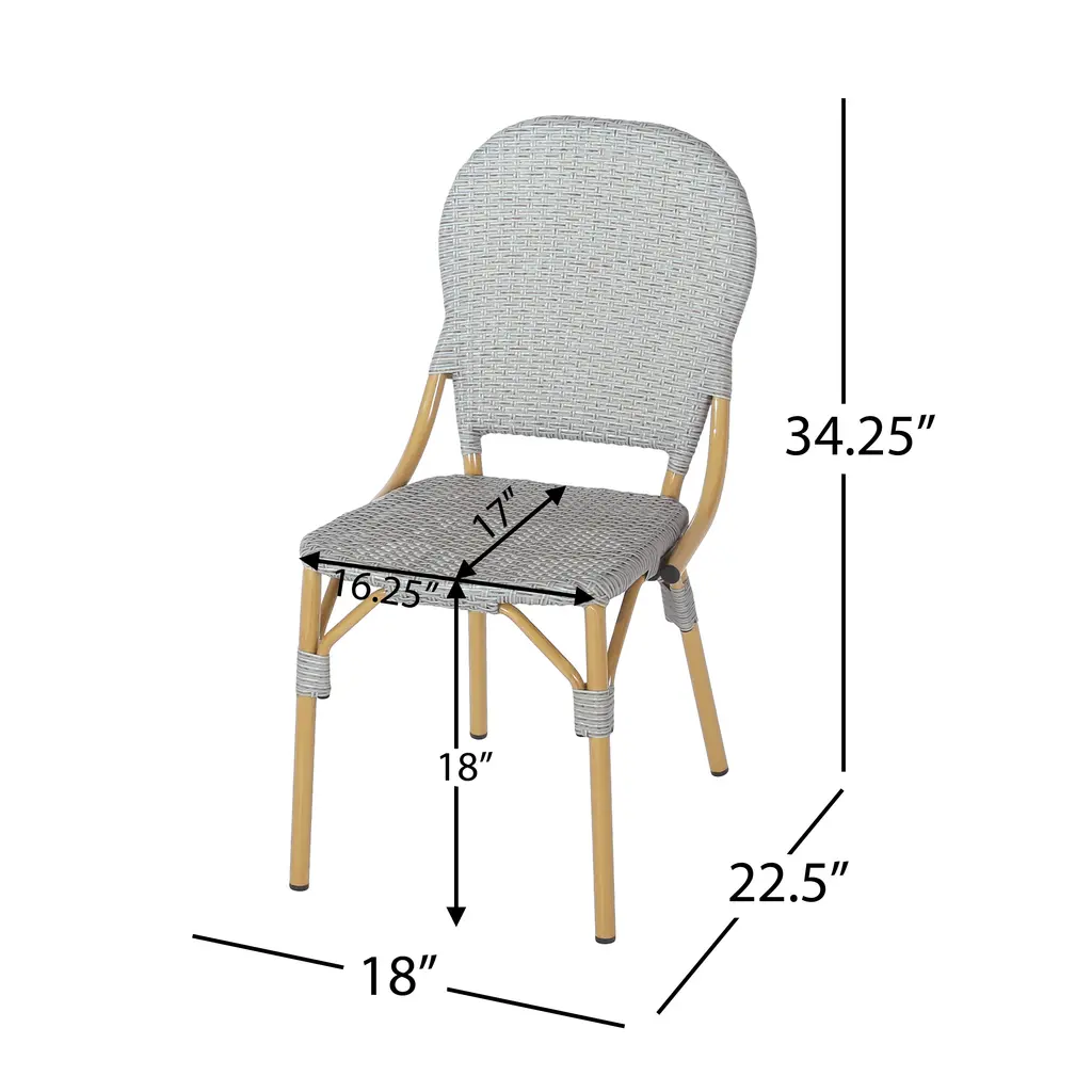 1. Product Dimension: L 18" x W 22.5" x H 34.25". Weight: 7.28 lbs.2. Easy to clean and assemble with all the parts, tools and instructions included.3. Bring a touch of French bistro charm to your patio with bamboo-finish chairs and a chic gray woven design, perfect for creating a relaxed outdoor atmosphere.4. Constructed with a durable aluminum frame, these lightweight, rust-resistant chairs offer long-lasting comfort and a timeless, natural bamboo finish.5. Weather-resistant PE rattan with a stylish gray weave ensures both beauty and durability, making these chairs the ideal choice for year-round outdoor use.