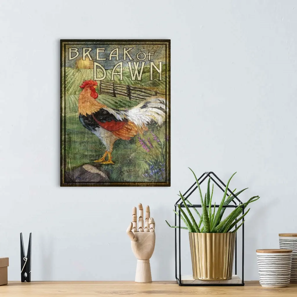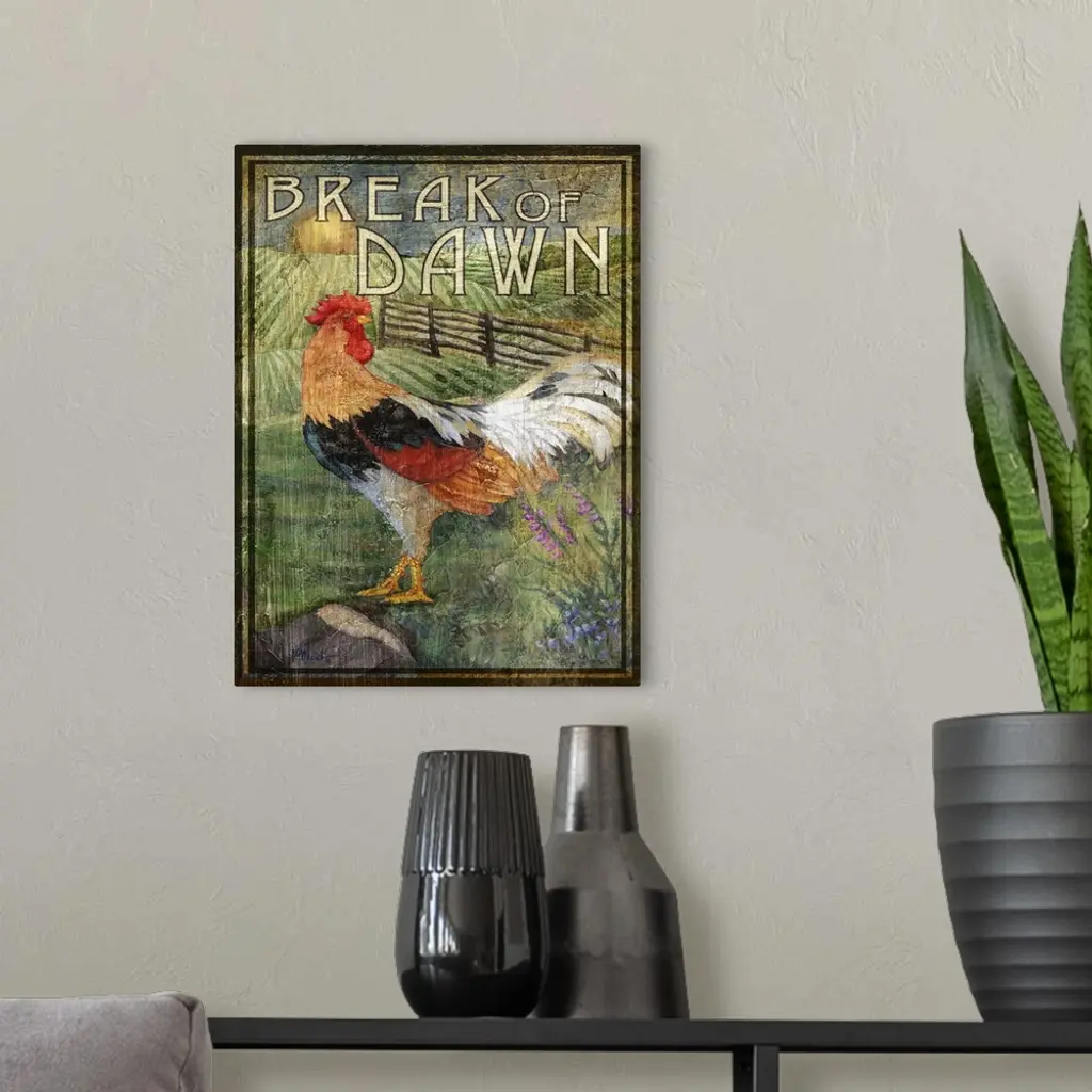Rustic-style sign for a farm with a strutting rooster and the words Break of Dawn.