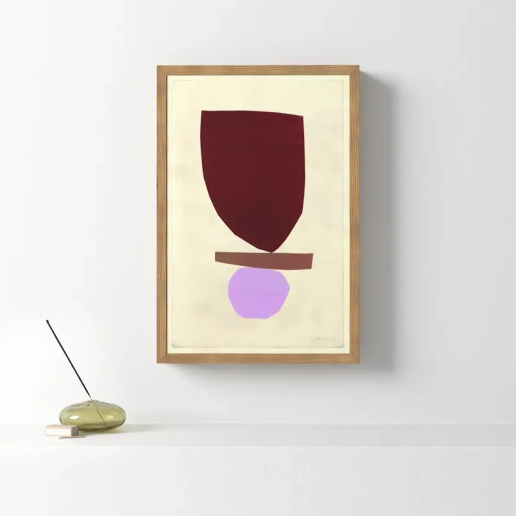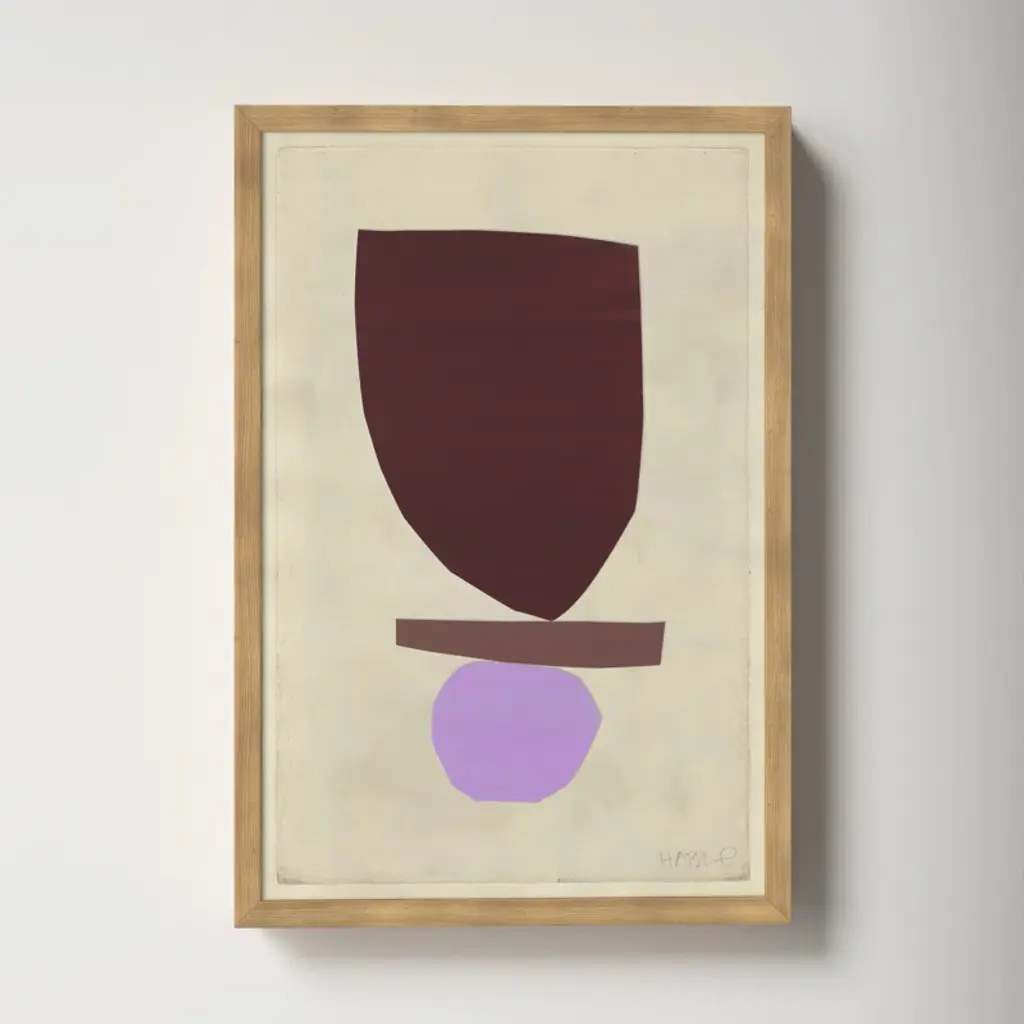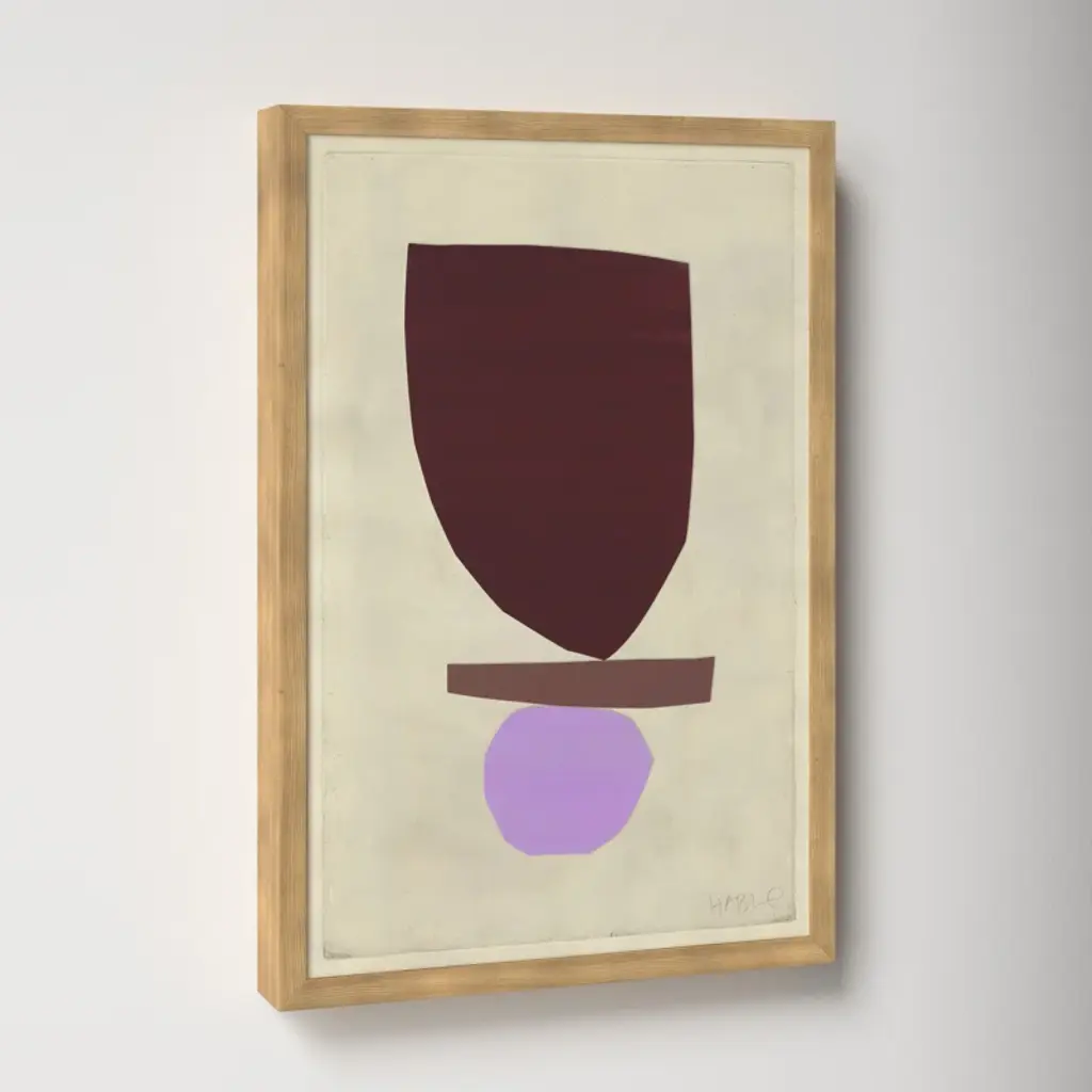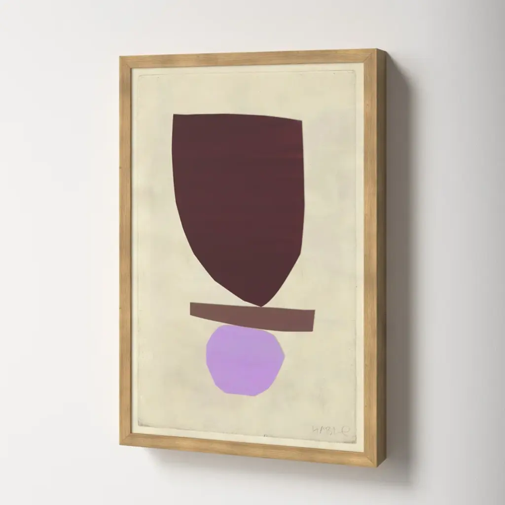 Roots. Defined by its rich, hand-mixed color and balanced forms, this print is a reproduction of painted + cut paper collage work by artist Susan Hable. It was originally conceived as an abstract bird, but evokes a mood more than a creature. Printed on archival paper + arrives in a wooden frame.