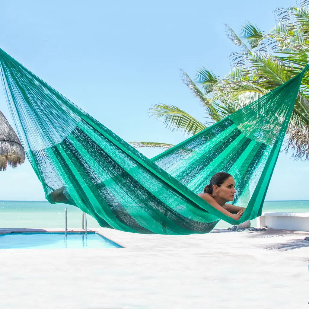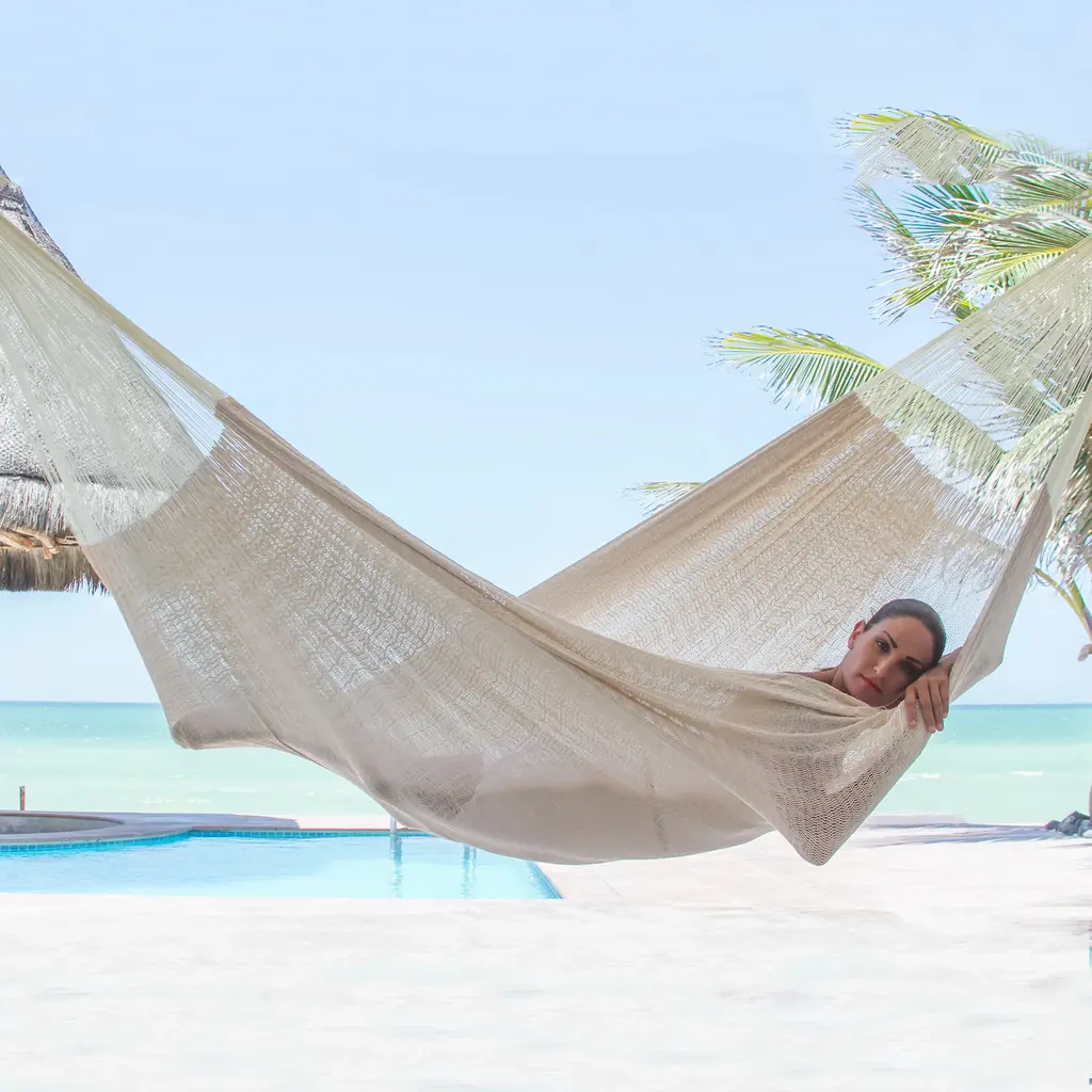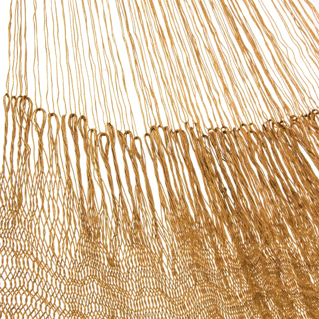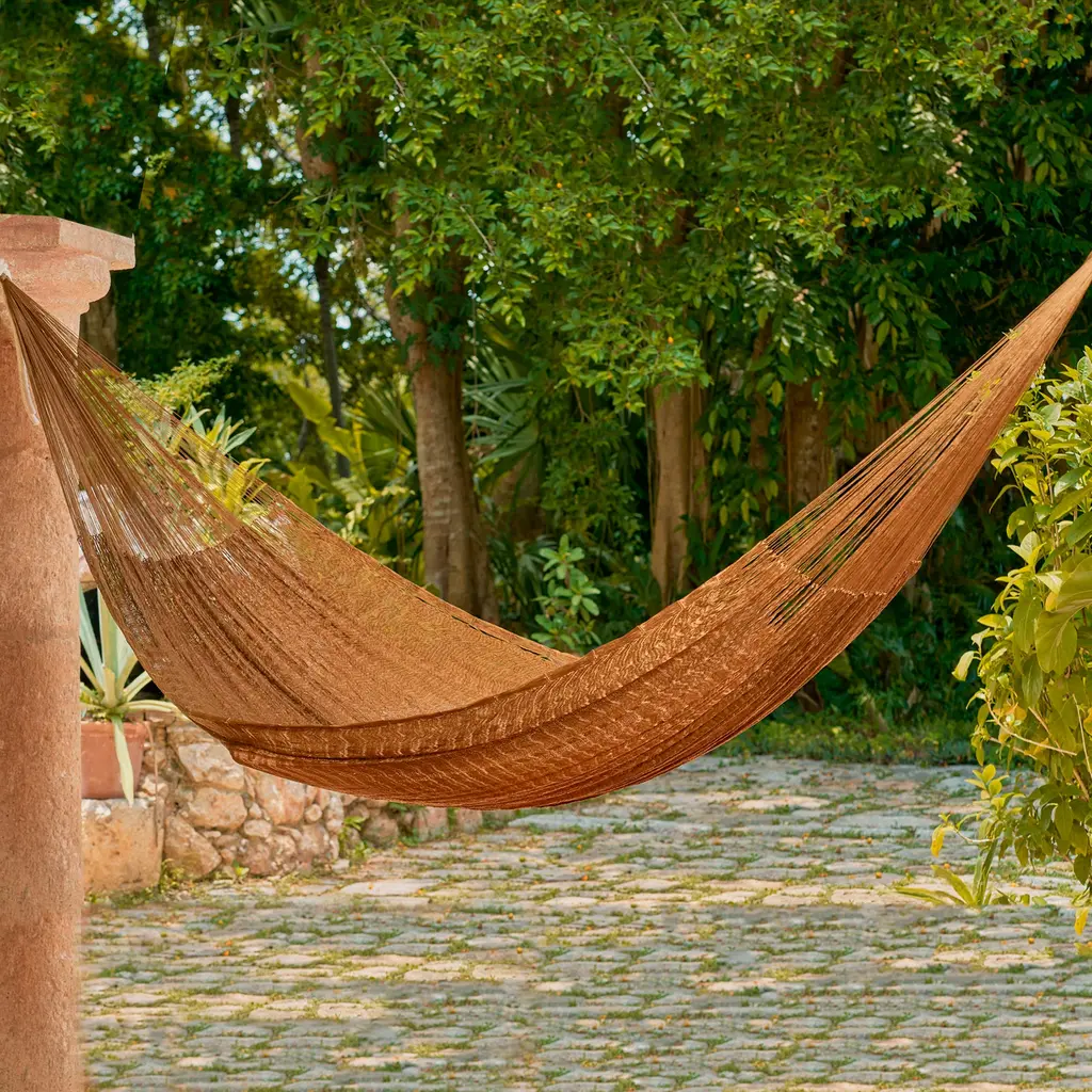 Maya Artists of the Yucatan hand-weave glistening copper hues into a handsome hammock. Long before the Spanish arrived upon the coasts of the Yucatan Peninsula, the Maya preferred to sleep and rest in hammocks. They considered the hammock to be like the loving embrace of a mother, due to the comfortable manner in which the body is held and swung within its cradle. Maya Artists of the Yucatan seek to preserve time-honored customs while also offering stylized versions of the original Maya hammock. For them, the hammock is a work of art. Their hammocks are incredibly comfortable, easy to maintain, and may be stored just about anywhere. Please note: The accompanying extension ropes may vary in color from those shown in the images. It easily packs for travel to the beach or lake. Extender ropes (measuring 1 meter), hammock hooks ("S" hooks), and step-by-step instructions included for easy installation.NOTE: Because each is woven individually by hand, measurements may vary by as much as ten centimeters. There may be slight color variations from hammock to hammock.