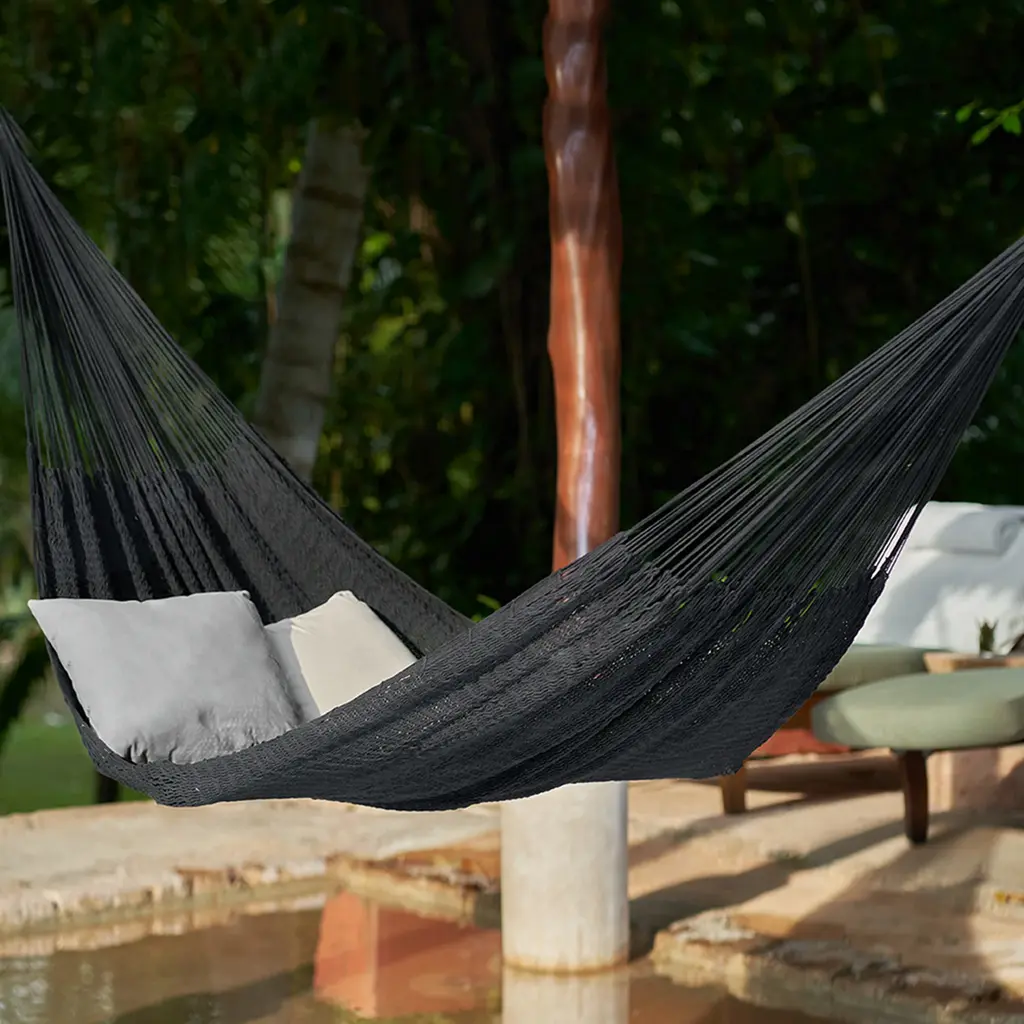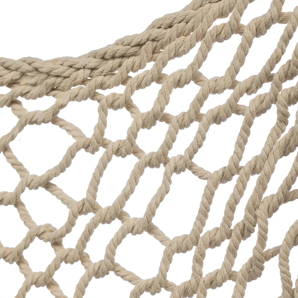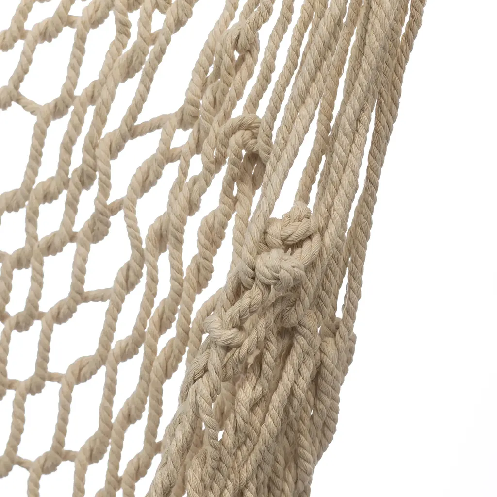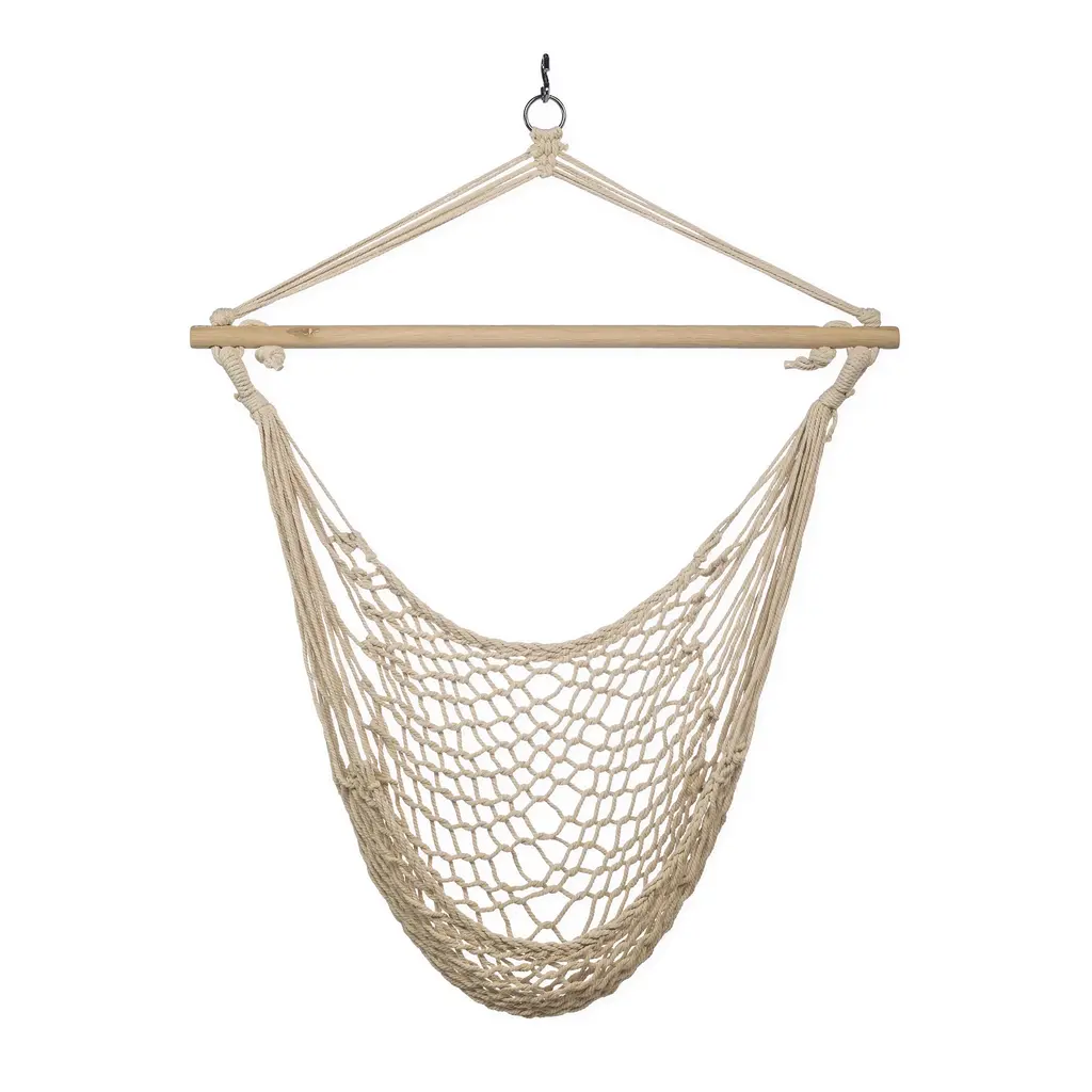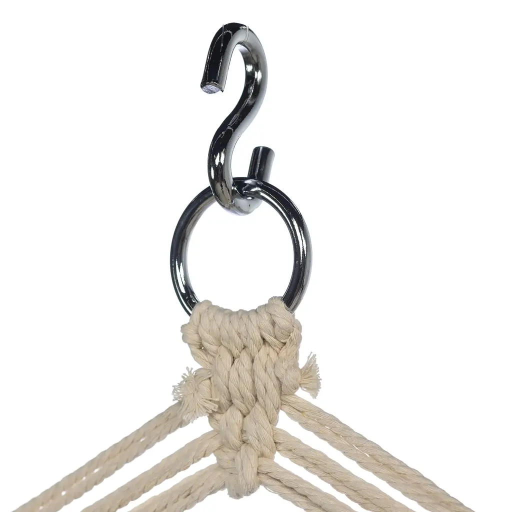 A larger seat height and stationary attachments make our Rope Hammock Swing even more comfy.The white wooden crossbar is 37"W with stationary rope attachment points that won't slide in.The cotton/polyester string body is beautifully woven for long-lasting strength and durability. It’s strong enough to hold up to 350 lbs.Swing comes with an S-hook for hanging; other hanging hardware is not included as that is dependent upon where/how you hang it. Cushions not included, sold separately. Imported.