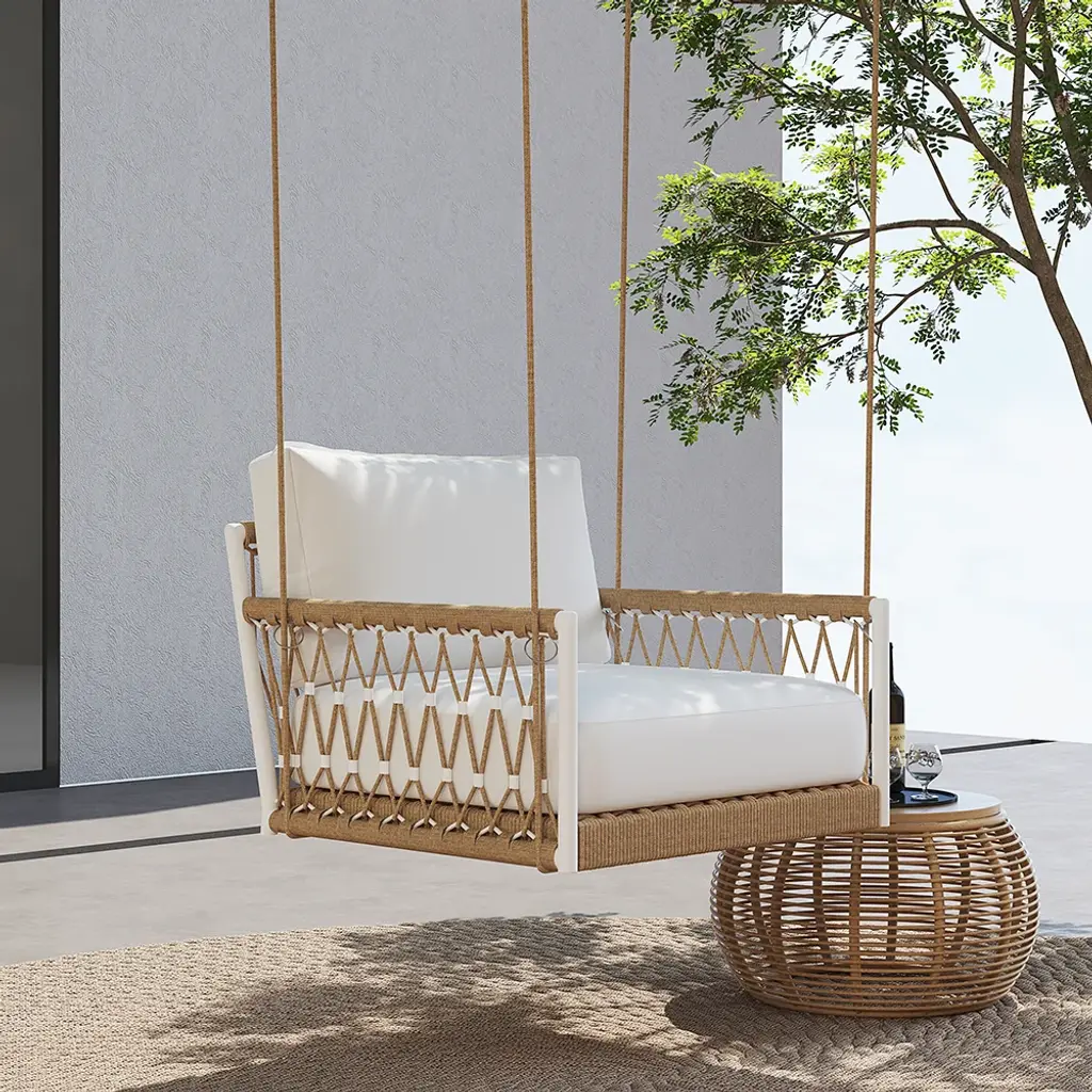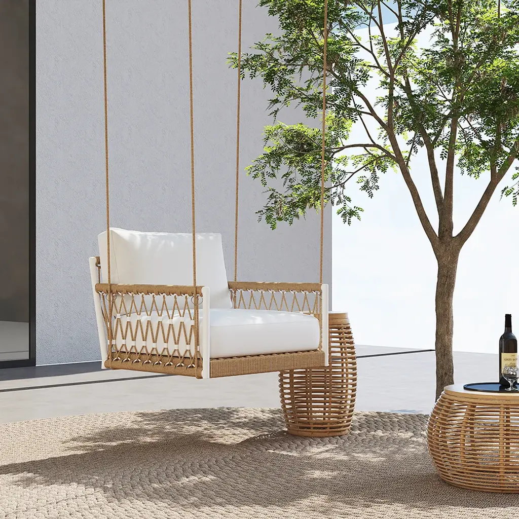 This Boho-inspired 2-seater woven rattan outdoor patio swing sofa offers both style and comfort for your outdoor space. Featuring a khaki rattan frame, plush white cushions, and a smooth swinging motion, it’s perfect for relaxing with a loved one on patios, balconies, or gardens. Crafted with durable, weather-resistant materials, this swing sofa is ideal for year-round use.