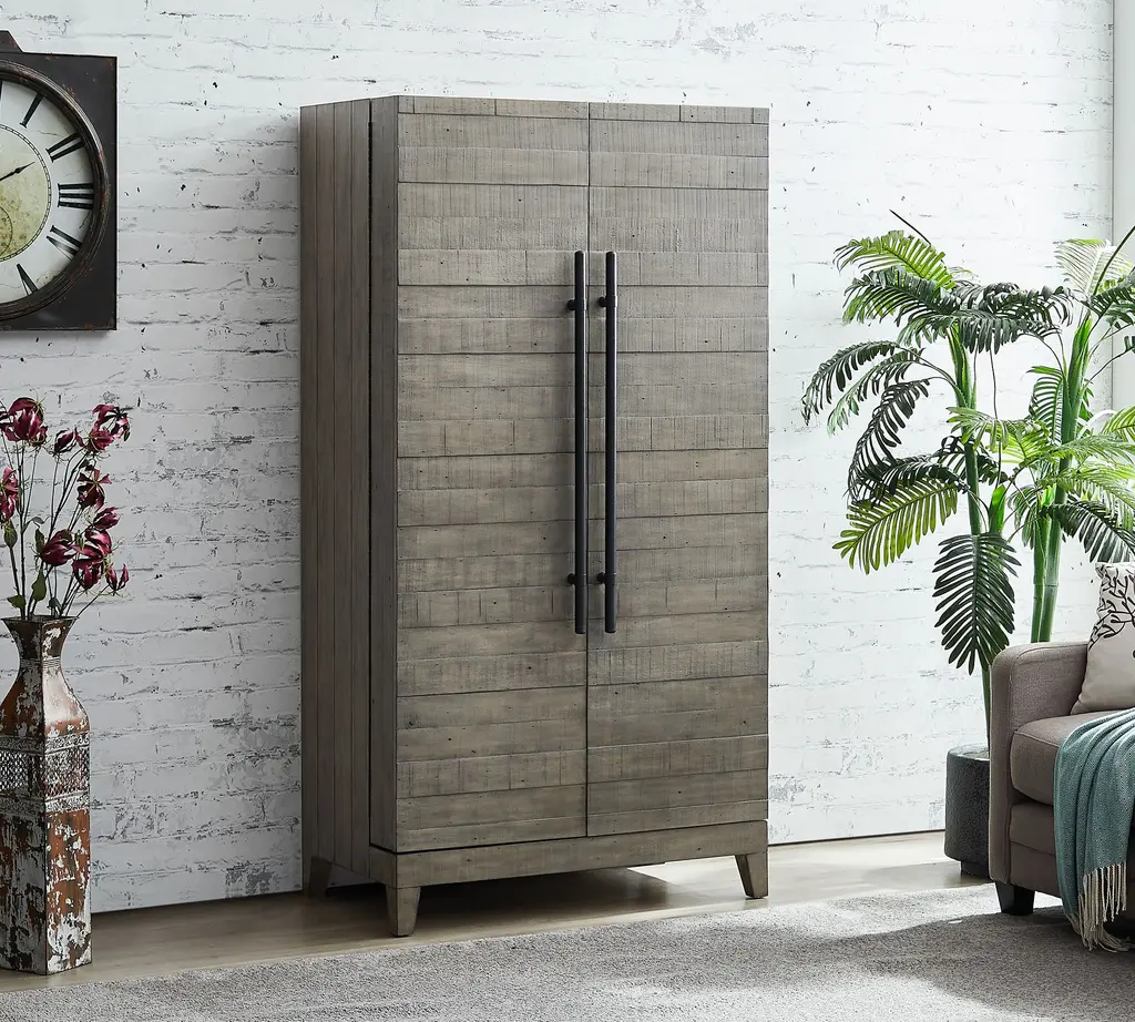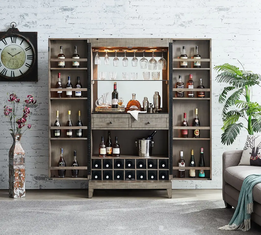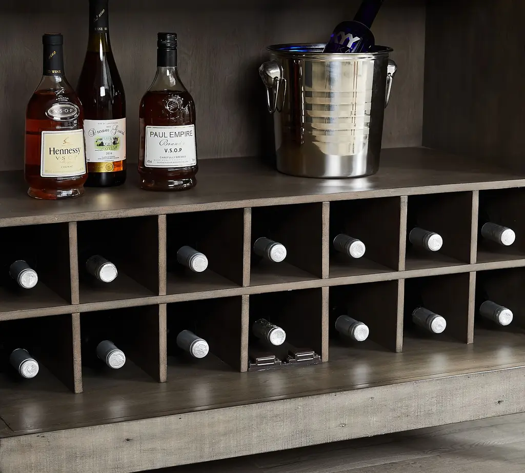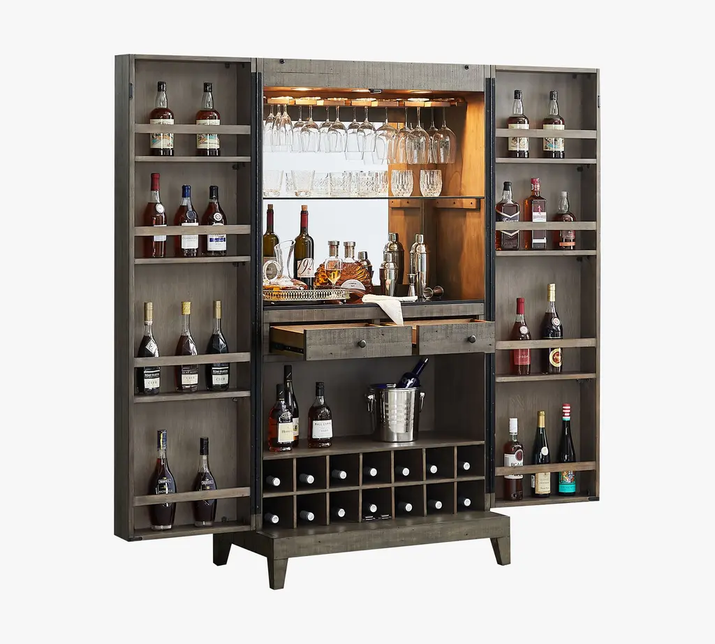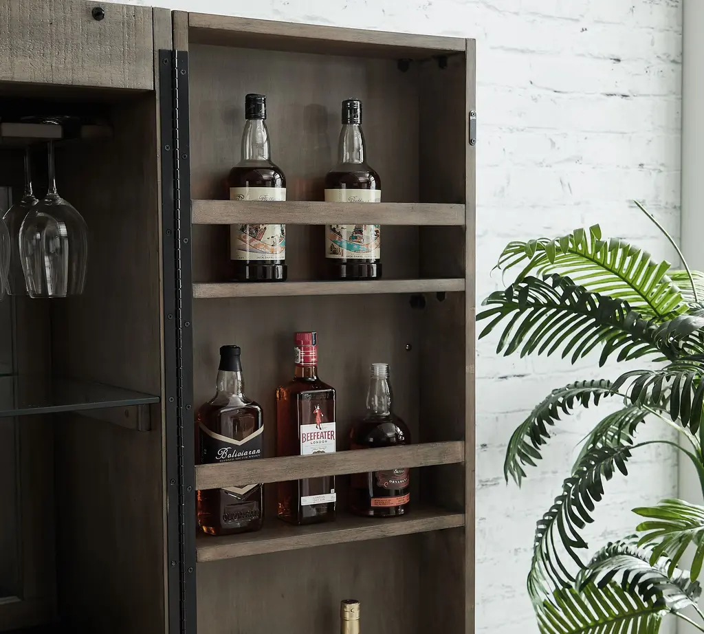Raise the bar with this statement liquor cabinet – the perfect piece for wine lovers and cocktail connoisseurs. Crafted of pine, it’s designed with piano-hinged doors that open to reveal stem holders, a gridded wine rack, and ambient lighting that shuts off when the doors are closed.