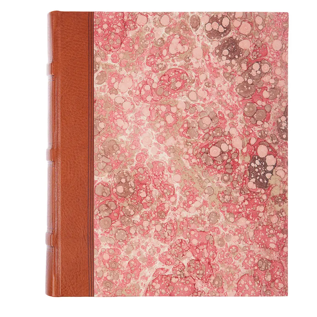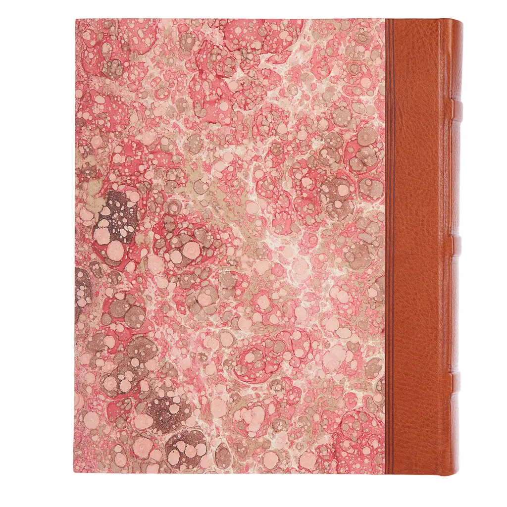 Handmade photo album by Florentine bookbinder Giannini with a naturally-tanned leather spine and gorgeous pink marbled paper cover. The book contains 30 ivory card sheets to fix photos and is entirely hand-executed at each phase to achieve impeccable aesthetic and functionality.