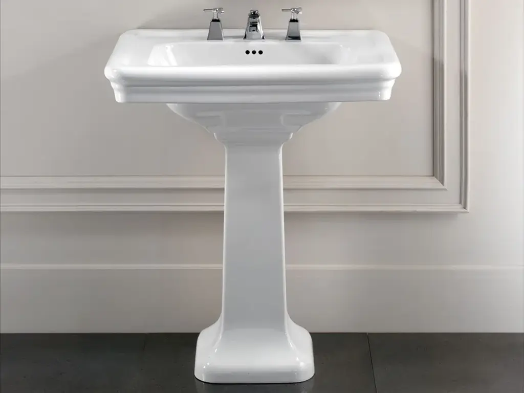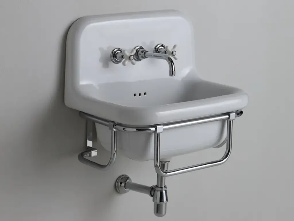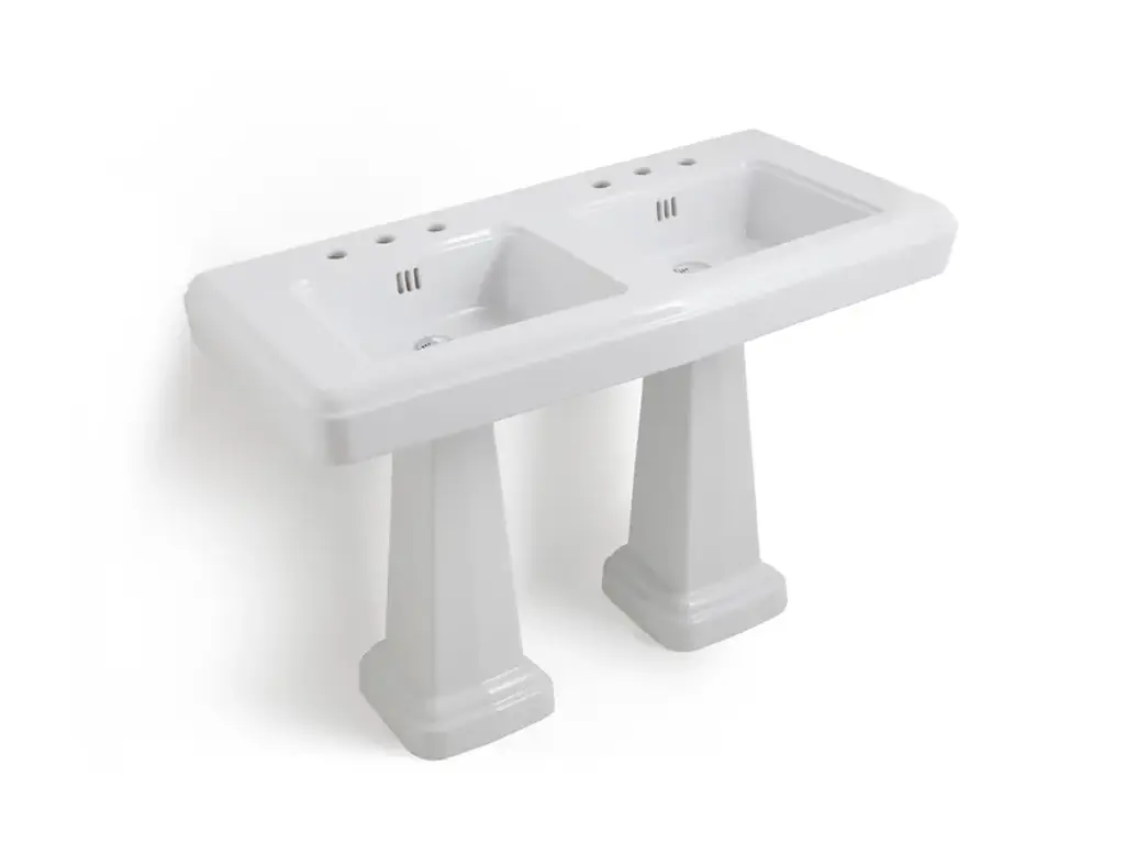 This eclectic console combines the harmonic classic inspiration with the sophisticated atmospheres of the best design from the Fifties. The aluminum bearing structure, with turned brass elements, is available in different finishes. It is completed with the porcelain basin of the same name, characterized by the large countertop surface, and with four handy towel bars. Please, contact the Concierge service for further information. Faucets are not included.