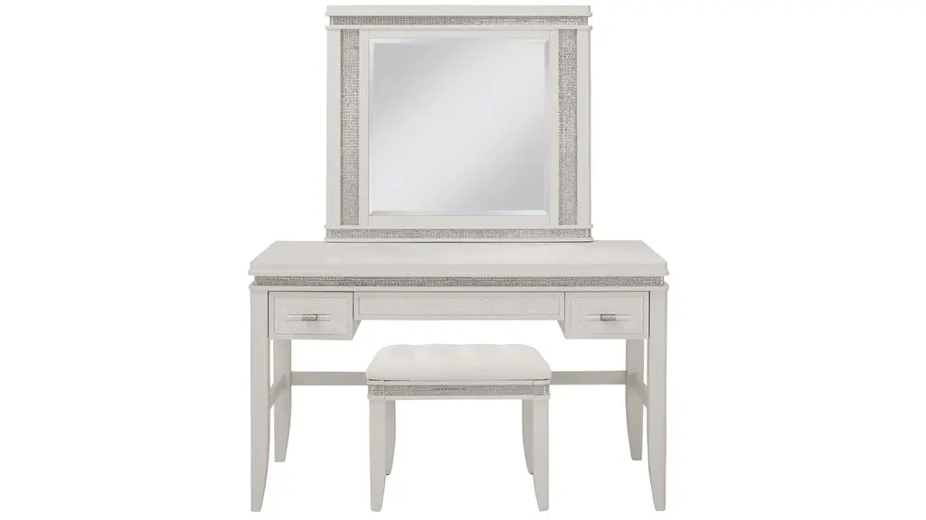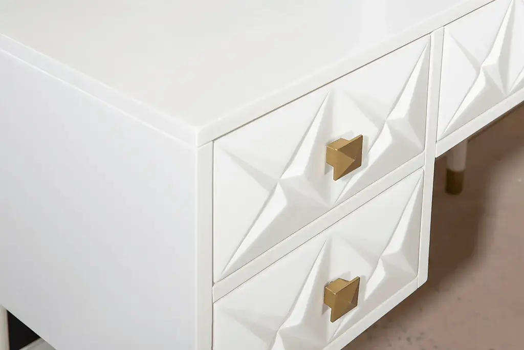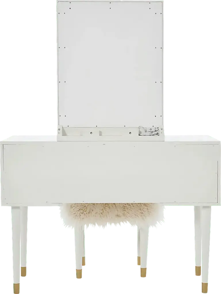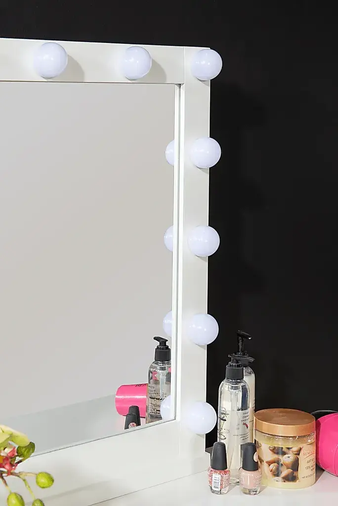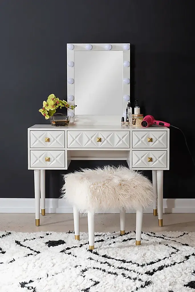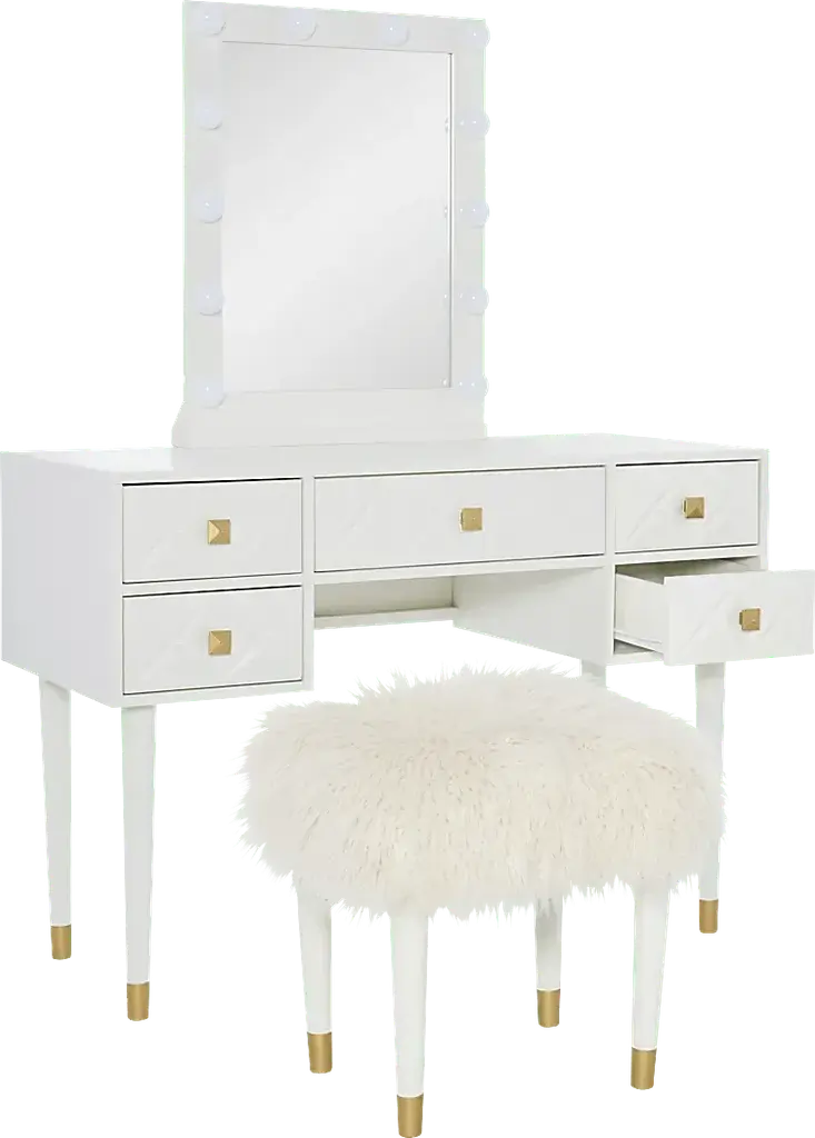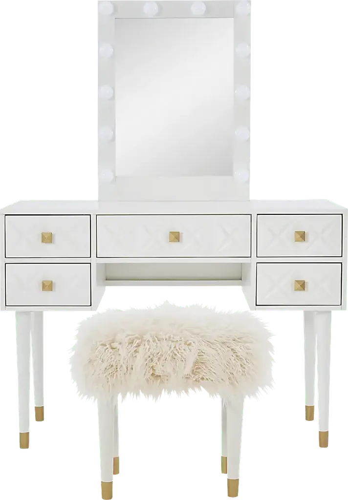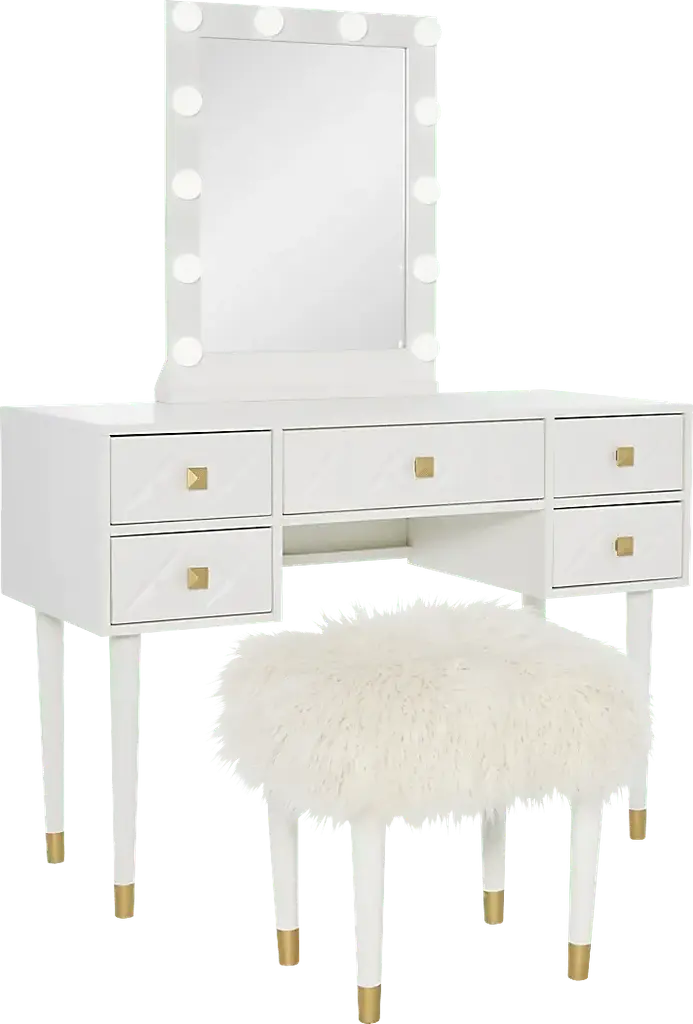 You're a star, and the Roselem vanity set is built to remind you every morning when you look in the mirror. A frame of regal bulbs provides the perfect lighting for doing your hair and makeup before you leave the house. 5 Deep drawers keep things organized yet chic with beveled geometric drawer fronts and gold knobs that match the tips of both pieces' legs. For the cherry on top, unbelievably fluffy upholstery is fitted over the padded stool to keep things light and fun. Customer assembly required.