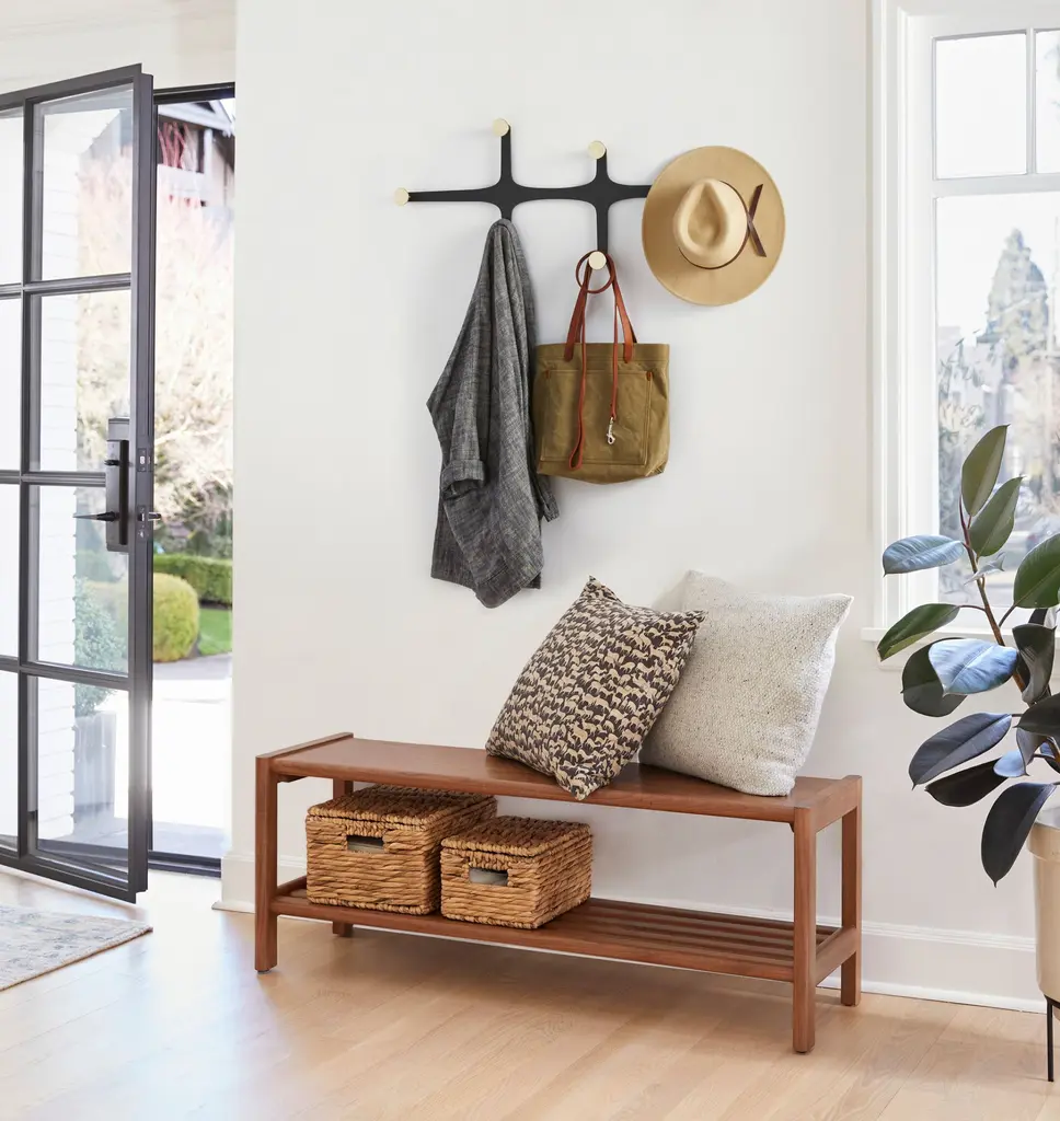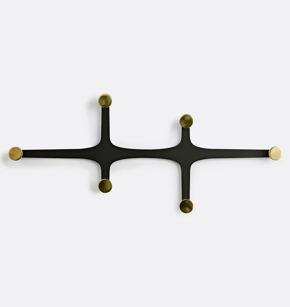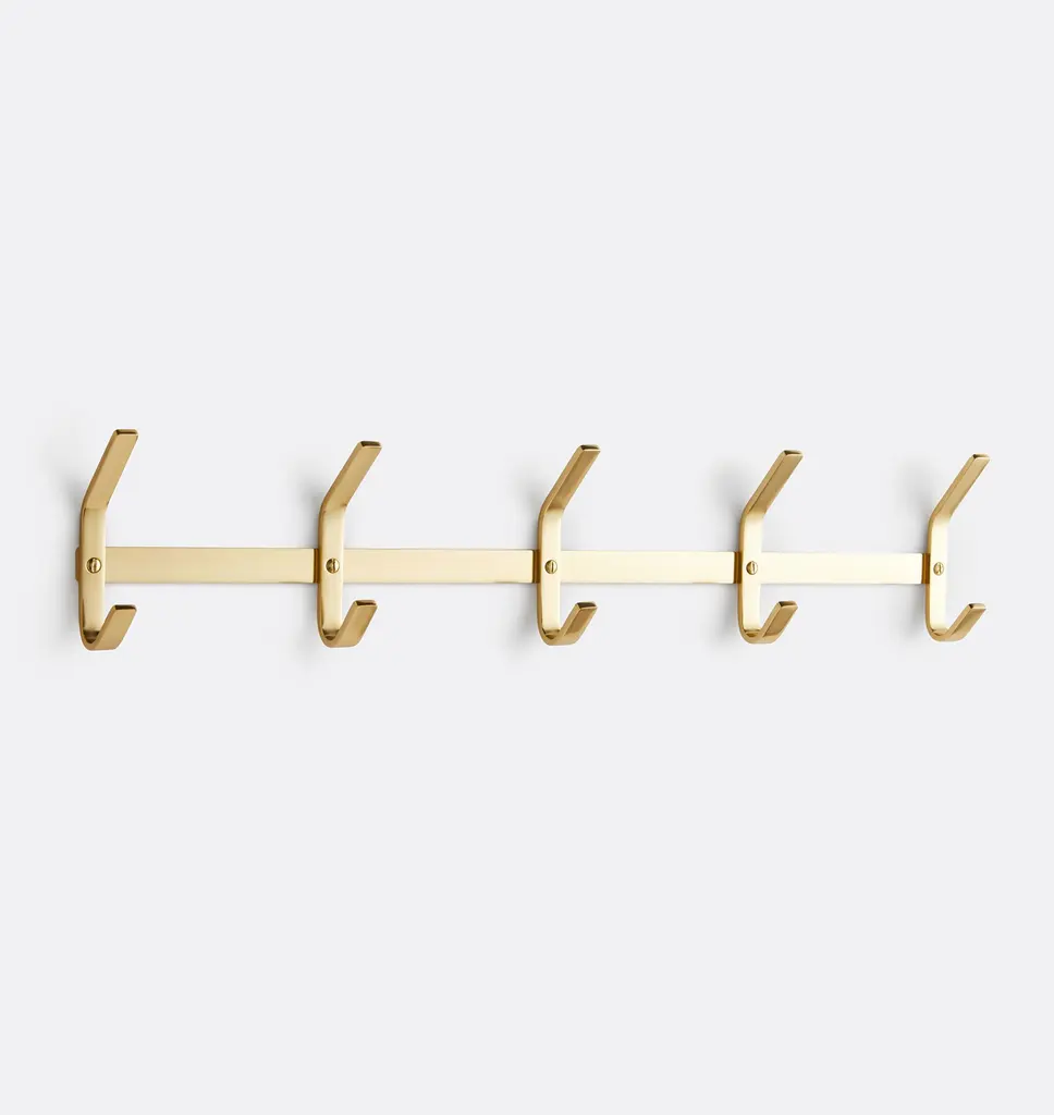 Inspired by Mid-Century motifs and crafted from solid brass, our Rosemont Hook Rack is a statement piece that will add style and function to your entryway, coat closet, or bedroom. Available in two finish combinations, this versatile hook rack can be hung vertically or horizontally.