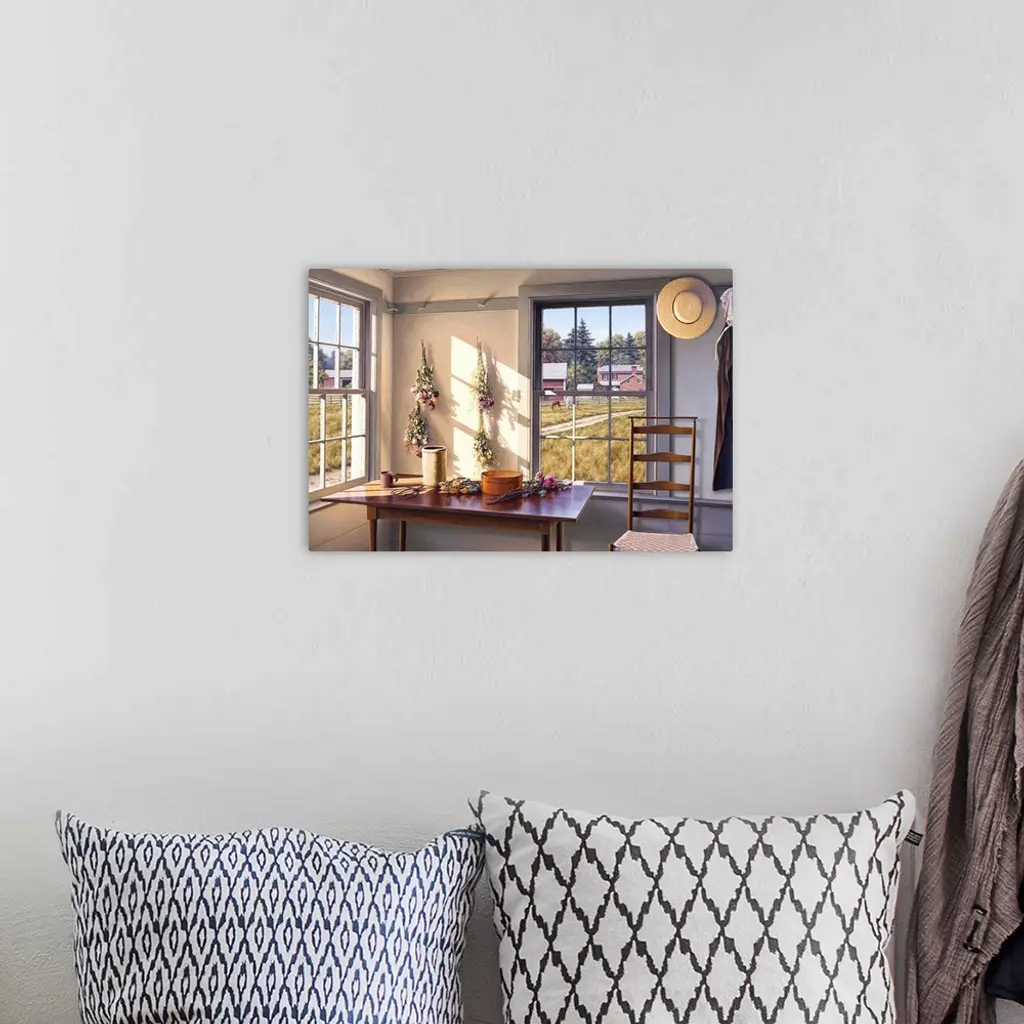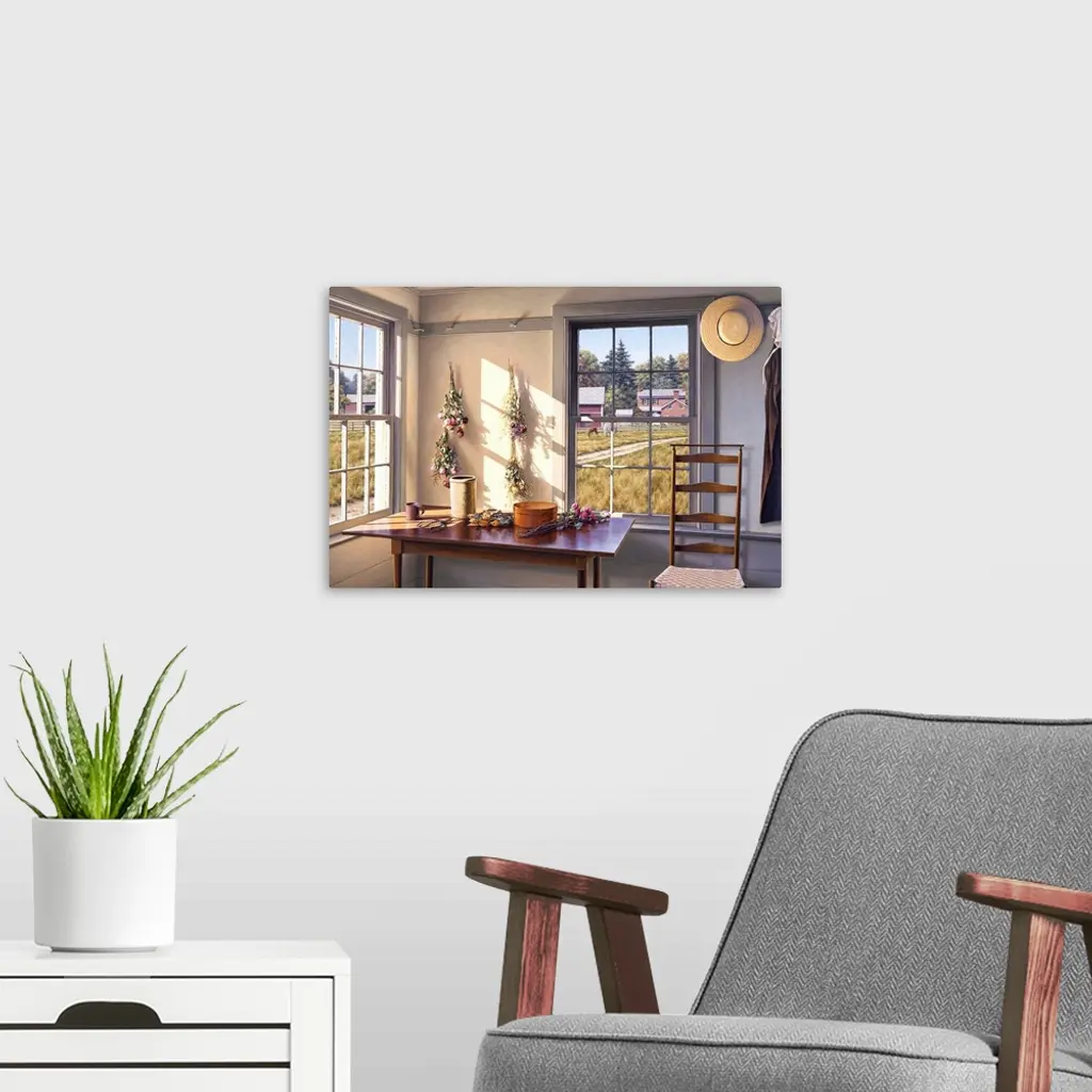 Sun filled room with bouquets of roses drying on the wall and table, can see farm and horse out window.