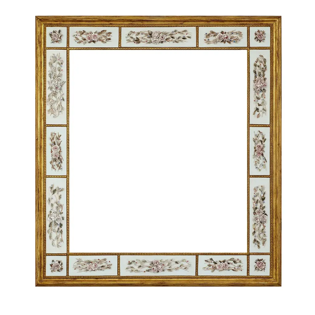 The original and precious white lacquered wooden frame is decorated with roses and buds in pocellana biscuit. The frame is designed by Studio Caiafa and is part of the new "Le Classiche di Capodimonte" collection handcrafted by expert ceramic masters. Please, contact the Concierge service for further information.