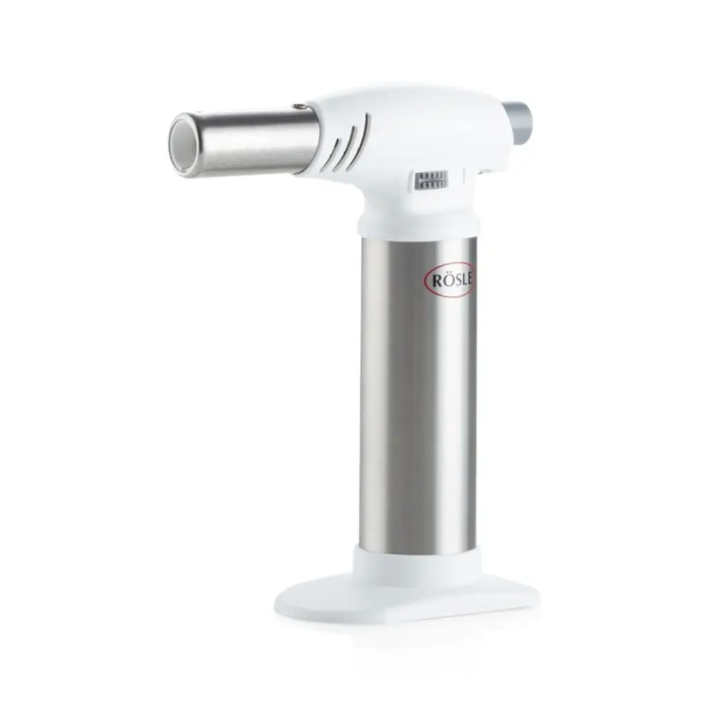 Ideal for caramelizing crème brulee or quick roasting peppers, this kitchen torch regulates flame size with an adjustable gas dial. With a stainless steel construction, 2372°F maximum temperature and child-resistant safety switch, the torch is powerful yet safe. The refillable fuel reservoir holds enough lighter gas for an hour of burn time.
