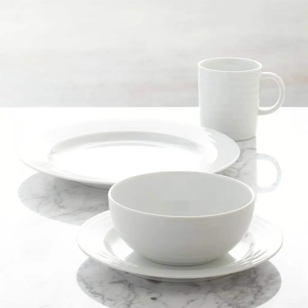 Designed by Martin Hunt of Queensberry Hunt, Roulette dinnerware has been a top-selling Crate and Barrel favorite since the pattern was introduced in 1992. Crafted of durable, pure white porcelain, Roulette features subtle concentric circles that create an eye-catching rippled effect. Mix and match with our Roulette Blue Band dinnerware.