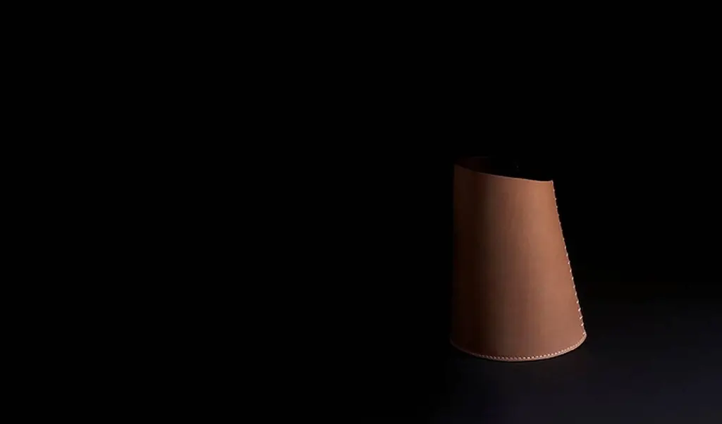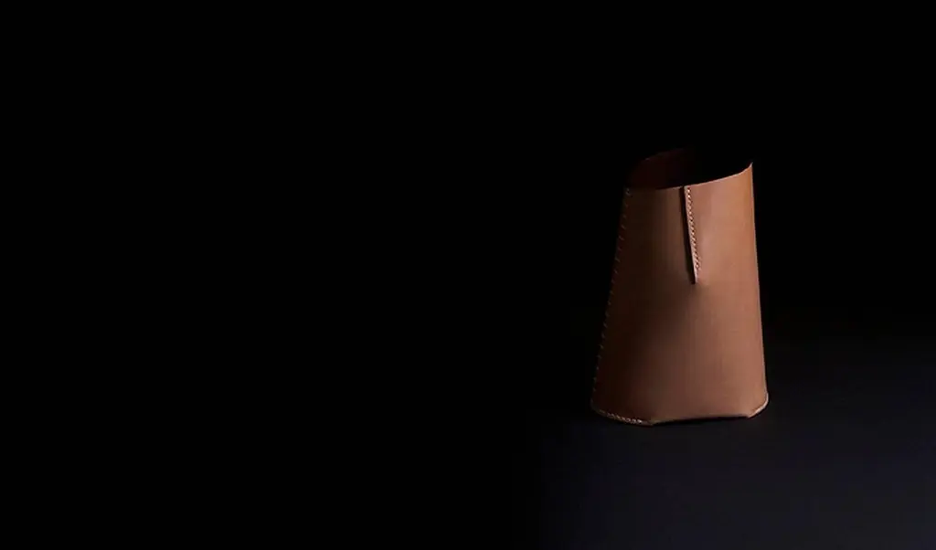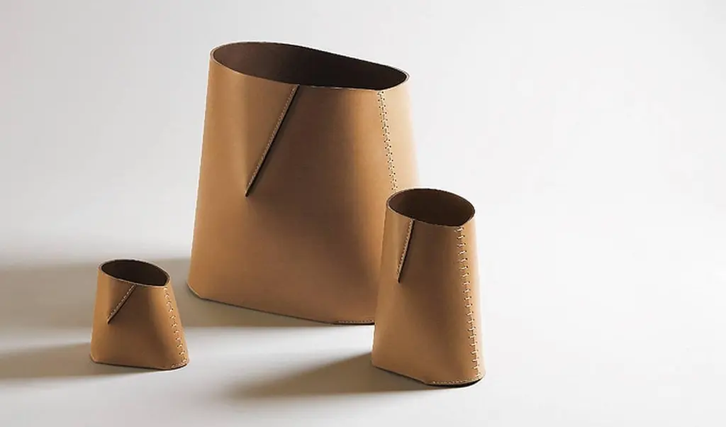 "Roum roum" is a leather container, designed by Claude Bouchard and manufactured by Oscar Maschera, and is part of Foglia Couture collection. Genuine Italian leather vegetable tanned. Colors combination to be chosen from the available range: tan, sienna, orange, red, red-purple, dark brown, khaki, blue and black.DIMENSIONS:Ø 4.1", H. 8.6"Two hides together, one single layer of leather. Two different colors, one for the inside and the other for the outside. Few precise cuts on a whole surface, a few pleats held together by hand stitching: the object has taken shape. Strong thickness, raw edges, dyed edges, contrasting stitching: the details of craftsmanship. Leather, robust and soft, which maturates over time like wood, wine, brandy and cheese, is a material suitable for a living relationship with people and things it has to do with: it absorbs their scent and gives its own. It protects, gathers and changes shape, as it retains something of the life it once had.Past experiences in working with leather, with objects of common use transformed into their own form by the material of which they were made (baskets, boxes, trays, writing-desk items, small pieces of furniture, in addition to bags and cases, of course) have led Oscar Maschera to today’s production which has exceeded even the limits of explicit reality to get the pure form of the objects, reaching beyond the risky limit of mere functionality.CLAUDE BOUCHARD, interior architect and designer by training, is well known for his pieces of design in ceramics, porcelain, glass, metal and wood for firms such as Hermès, Puiforcat, Porcelaines Bernardaud, Faïenceries de Gien and the Musée des Arts décoratifs de Paris in France, Triangolo in Italy, Anthologie Quartett in Germany and Vista Alegre in Portugal.He has been artistic director of Puiforcat, the silversmith subsidiary of the Hermès group (2007 – 2009). Claude Bouchard’s work is focused on the physical, emotional and esthetic relationship between the object or space created and people who use or experience it. He has always questioned the simplicistic principle of “purity” and “functionalism”.During all his work Bouchard has been trying to bring a profoundly contemporary form of expression to traditional techniques and materials and thus to help the conservation and renewal of those endangered techniques. Claude Bouchard lectures both for the architecture Department of Columbia University and at the Camondo School of design and interior architecture.Claude Bouchard’s work has been shown at the Galleria Blanchaert in Milan, at the Biennale di Faenza, at Max Alto and the Square de Vergennes Gallery in Paris, at the Biennale de St. Etienne, and at the craft in several retrospective exhibits in France, Belgium and Japan and several of his works are now in museum collections (Musée des Arts décoratifs Paris, Musée des Arts décoratifs et des Textiles de Lyon, etc).