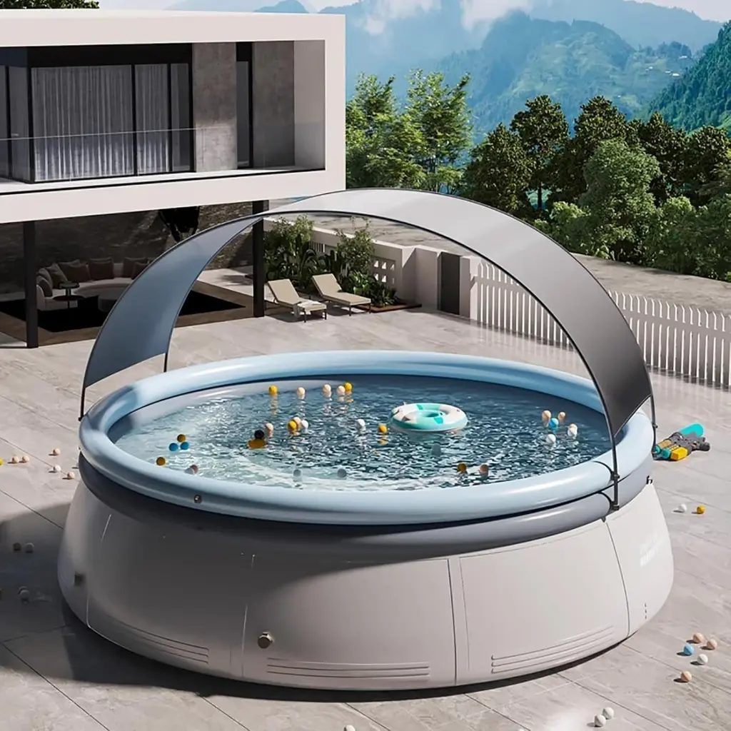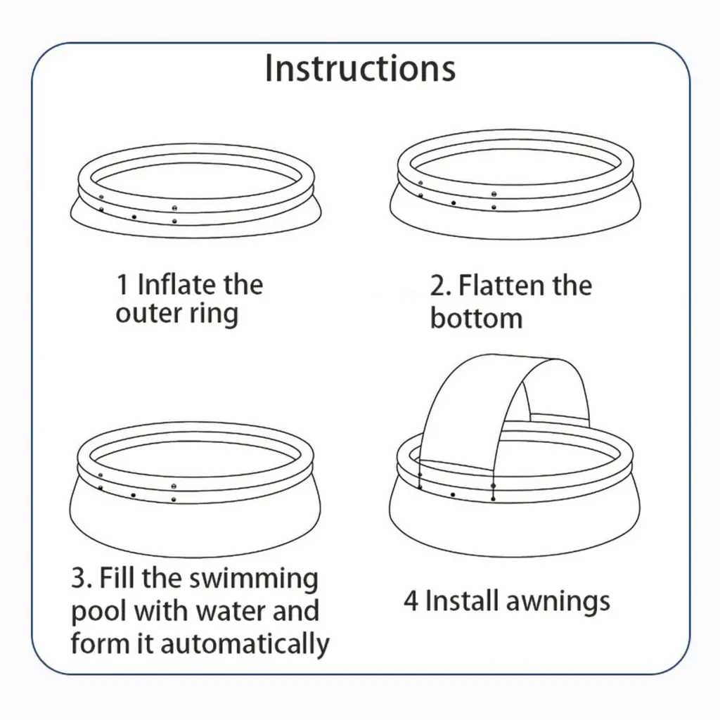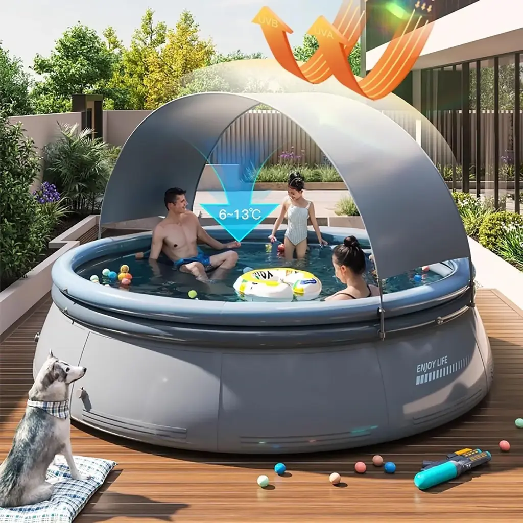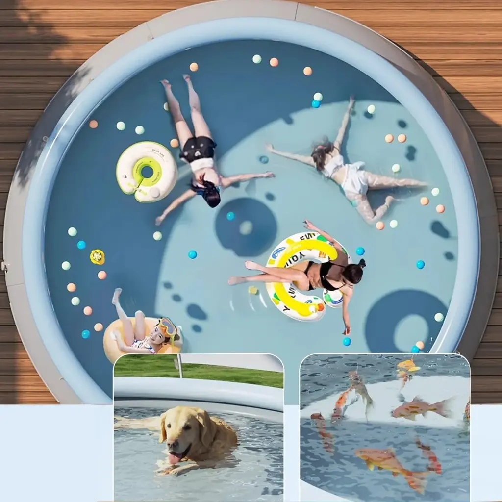Product DescriptionEnjoy summer fun with our spacious and durable inflatable pool! This sturdy and durable pool is perfect for family and friends, allowing you to enjoy refreshing leisure time right in your backyard. Quick to install and maintain, it is your preferred solution for endless outdoor fun.Product Features【Spacious Design】- Our pool has a diameter of 94.49 inches and a depth of 25.98 inches, which can accommodate up to 5 people, a diameter of 118.11 inches and a depth of 25.98 inches, which can accommodate up to 7 people, and a diameter of 141.73 inches and a depth of 29.92 inches, which can accommodate up to 9 people, making it an ideal choice for family gatherings and social events.【Large Capacity】- With a capacity of up to 2000 gallons, it ensures sufficient water for playing and swimming, and 80% water filling is recommended to ensure safety and stability.【Durable Structure】- Our pool is made of 0.6mm triple-layer reinforced PVC, which is durable and provides you with a reliable and long-lasting outdoor experience.【Easy Installation】- Simply inflate the top ring, fill with water, and you can use the pool. No complicated installation or tools required.【Convenient】- Lightweight and easy to deflate, this pool is easy to store or transport, allowing you to enjoy water fun anytime, anywhere.Product InformationPlace of Origin:ChinaMain Color:Aqua GreyMain Material:PVCUse Case:Garden & OutdoorProduct DimensionsAssembled Length (in.):141.73Assembled Width (in.):141.73Assembled Height (in.):29.92Product Weight (lbs.):30.86Package SizeLength (in.):24.21Width (in.):18.11Height (in.):11.81Weight (lbs.):32.56