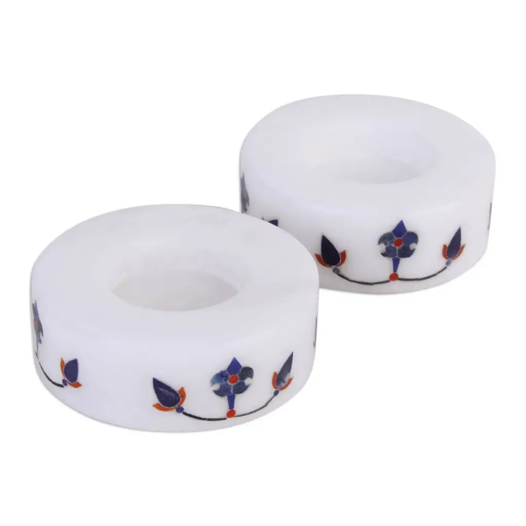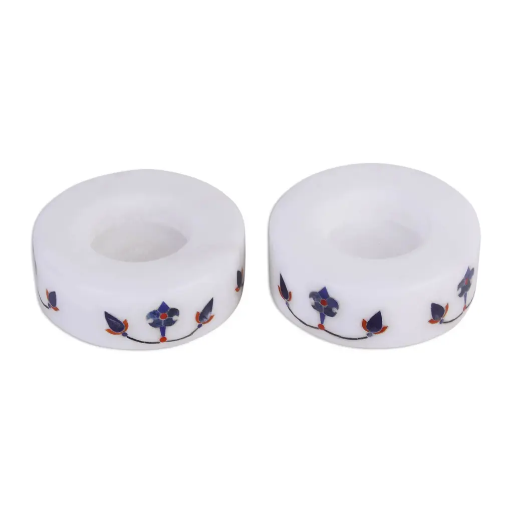 Elegantly crafted from white marble, this pair of round tealight holders from Raj Kumari and Raja Ram of India provides functional and stylish decor for your home. The two tealight holders feature a vibrant floral design that portrays the progression of a flower's growth. The design features a pattern with a blue flower displayed at the center, surrounded by two smaller buds. Deep orange and red accents add contrast against the white background.