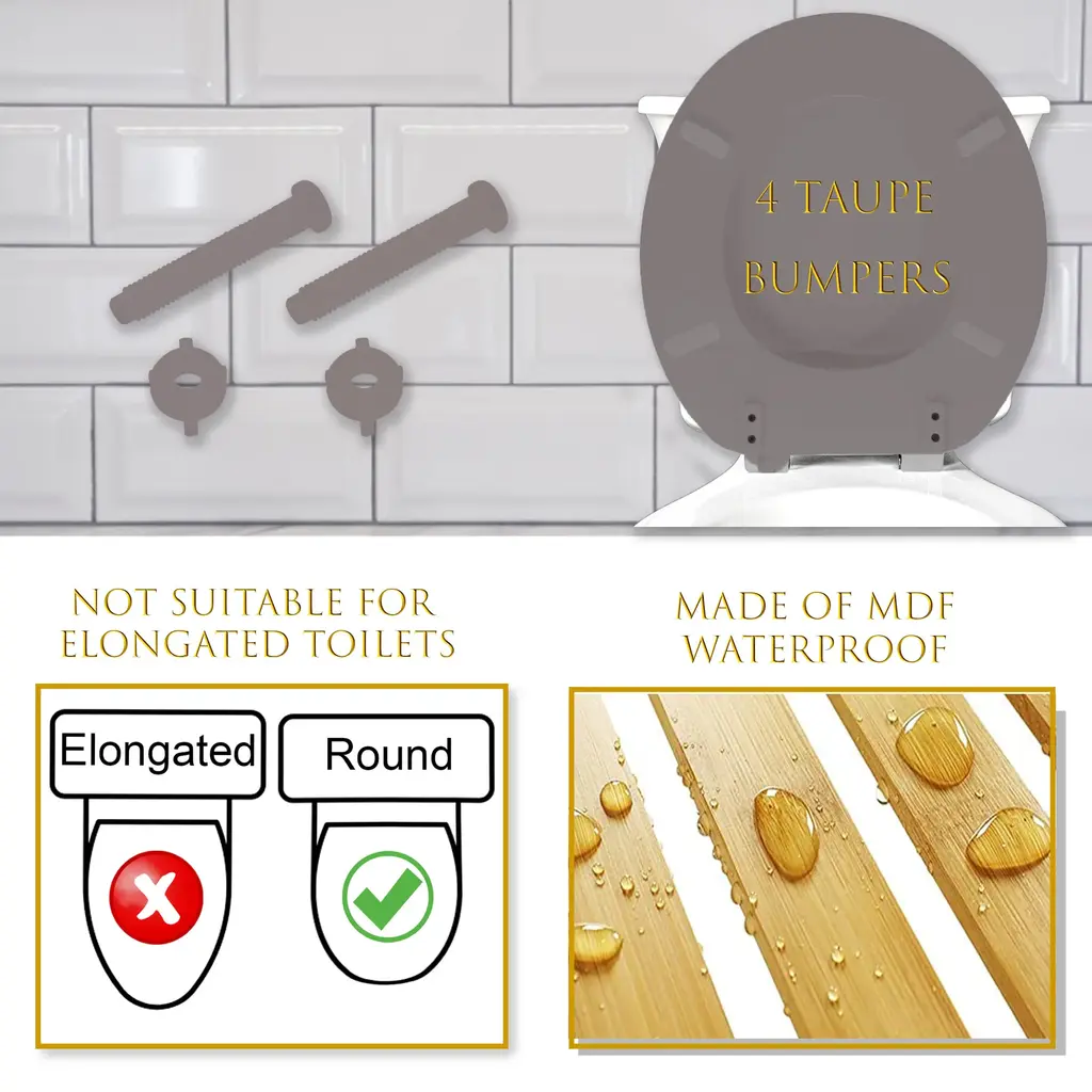 While we may not give a lot of importance to the toilet, it tends to be where many people spend a lot of time during the day. This Round Molded Wood Toilet Seat brings the quality and design you were looking for! Toilet bowls generally come in two standard shapes: elongated and round. To find out which toilet seat you need, measure the length of the bowl. Find the center between the seat bolts and measure to the outside edge of the front of the bowl. A round bowl will be about 16.5 inches, an elongated bowl between 17.5 and 18.5 inches. We offer both elongated and round sizes, in various colors and styles. It's never been so easy to pair your toilet seat with your current bathroom design! Moreover, all our toilet seats features four bumpers on the bottom of the seat. It hold it in place during use and prevent unwanted shifting that could damage the hinges. Our wooden toilet seats are easy to clean and to install. Simply clean with mild soapy water to keep your seats looking great for years to come. This Round Molded Wood Toilet Seat features a water-resistant coating to help prevent the wood from absorbing moisture over time."