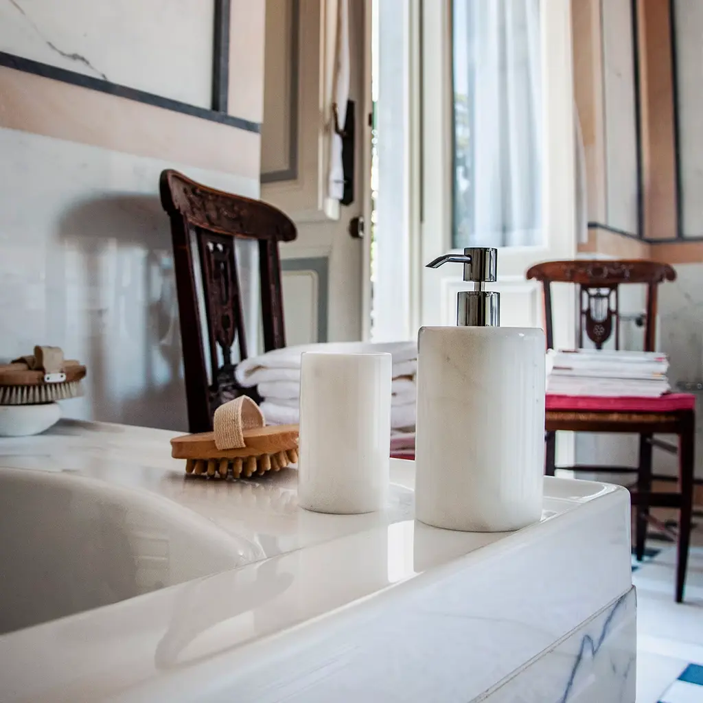 Offering a distinct and elegant look to your bathroom, spa or hotel, this magnificent Round White Carrara Marble Bathroom Set includes a round pump soap dispenser, one toothbrush holder and a rectangular shaped spa tray to place them on. The set will beautifully compliment any contemporary or more classic decor.