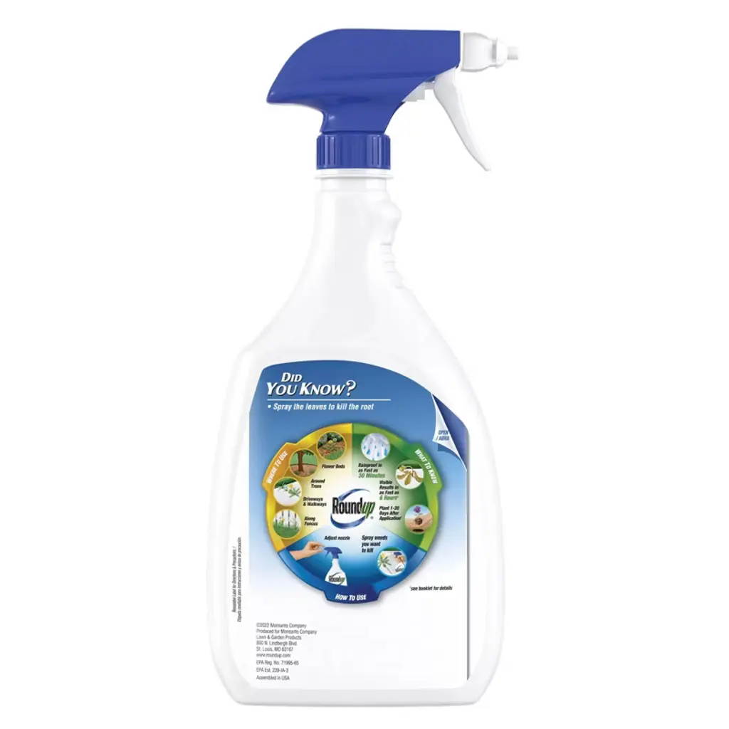 Take control of your outdoor space with Roundup® Weed & Grass Killer₄. It kills tough weeds and grasses to the root, including dandelion, crabgrass, poison ivy, clover (red & white), spotted spurge, and other broadleaf weeds. It is rainproof in as fast as 30 minutes, produces visible results in hours, and allows you to plant 1 to 30 days after application (see booklet for details). Use Roundup® Weed & Grass Killer₄ in flower beds and perennial landscape plants, around trees and shrubs, on patios, walkways, and driveways, gravel, or mulch beds, along fences and foundations, and edging around foundations and retaining walls. Applying this weed and grass killer couldn't be easier–just squeeze the handle to spray and treat weeds. Do not allow people or pets to enter the treated area or touch treated plants until spray has dried. One 24 fl. oz. bottle of Roundup® Weed & Grass Killer₄ with Trigger Sprayer covers up to 56 sq. ft.