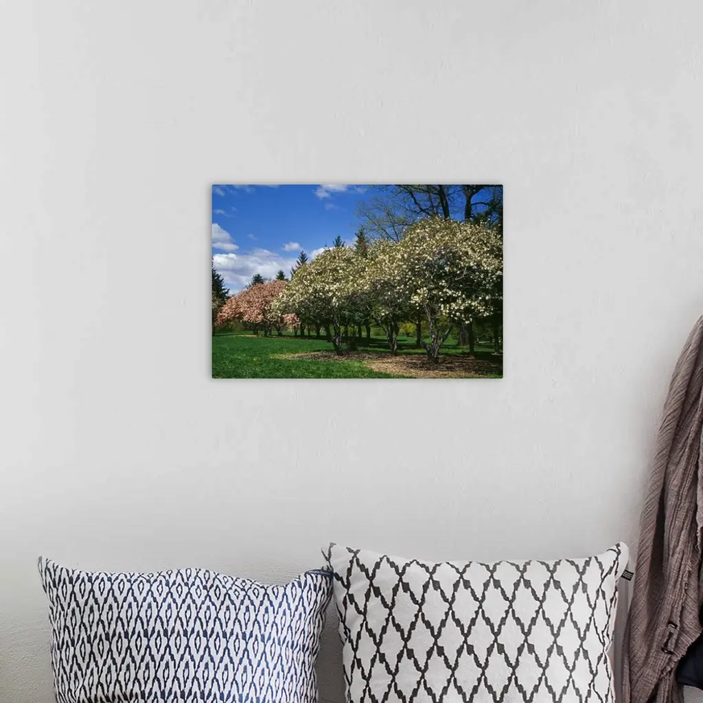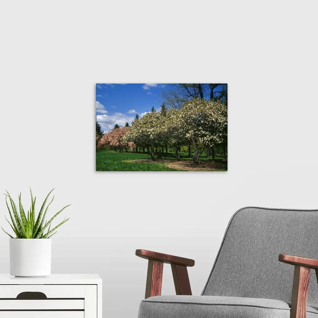Row of magnolia trees blooming in spring, New York wall art for home and office decor. Discover canvas art prints, photos, mural, big canvas art and framed wall art in GreatBigCanvas.com's varied collections.