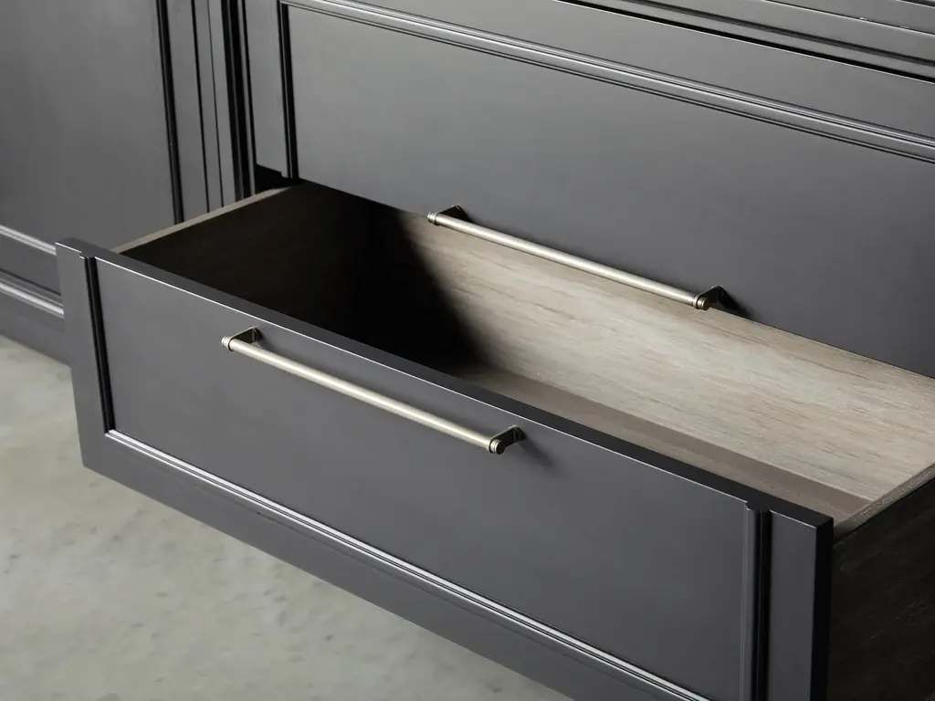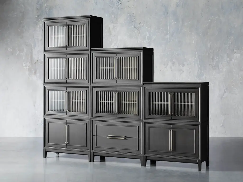 Featuring an artfully crafted modular design built for function as well as fashion, our Rowan Collection can be arranged to fit any space. Pieces crafted by Indonesian artisans are hand-painted and hand-stained, resulting in a clean, modern aesthetic accented by iron hardware—finished in pewter or brass tones. Glass-door cabinets are adorned with reeded glass, which draws the eye upward, adding unique texture and subtly obscuring what’s inside.