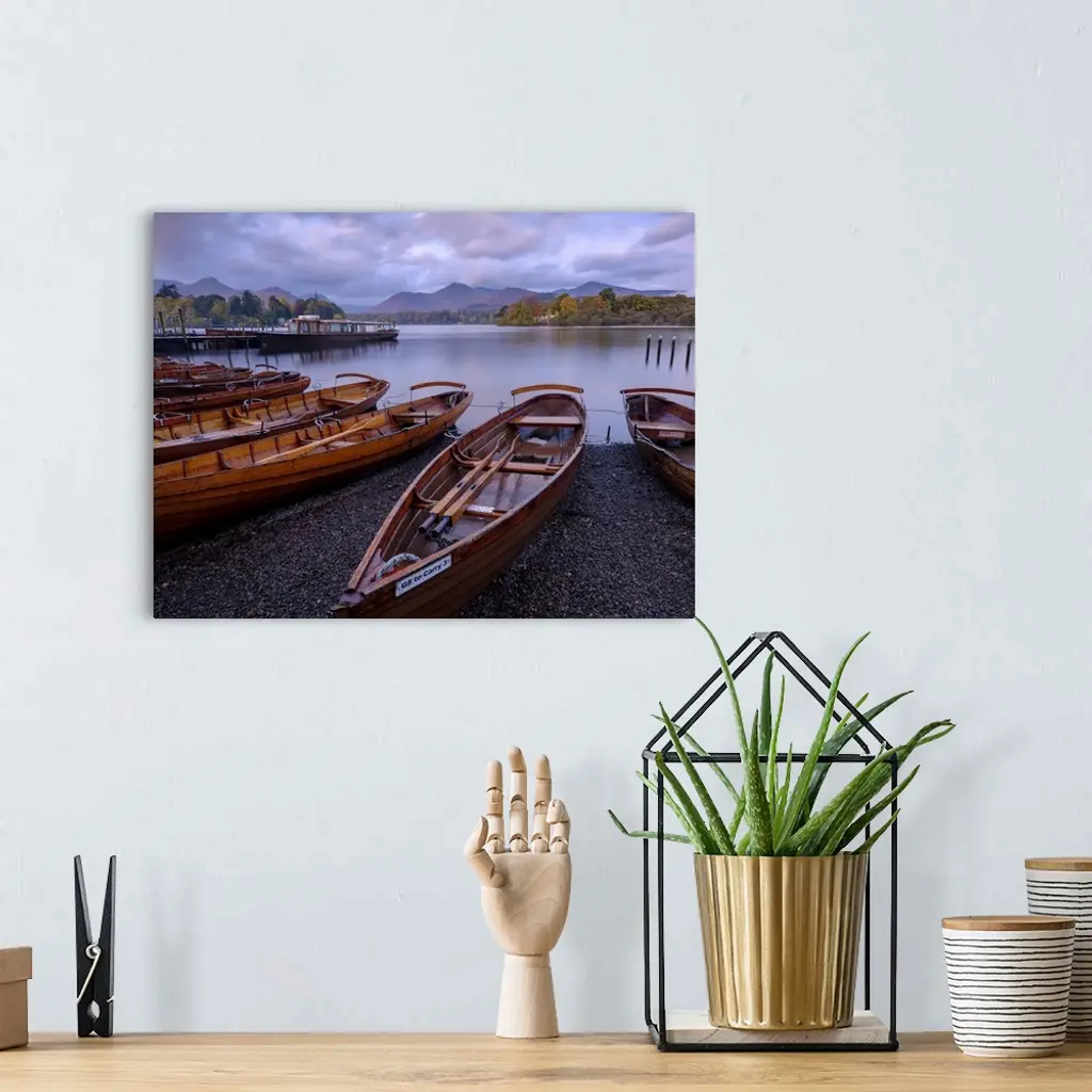 Rowing boats on the shore of Derwent Water at Keswick in the English Lake District.