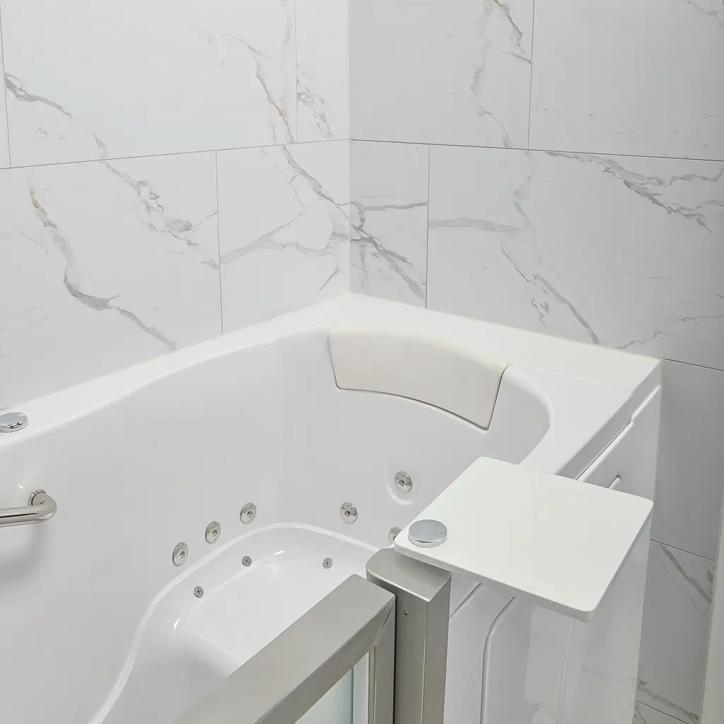 Ella's larger sized model, Royal, is 2" wider than the Elite offering a 24" wide seat to accommodate larger body types or bathers who require a roomier bathtub interior. The Royal features a beautifully designed brushed stainless steel and frosted tempered glass inward swing door and a white glossy acrylic shell. Built with comfort, ease of use, and luxury in mind, this amazing in-home spa is sure to leave you feeling like royalty. Attached to the deck is our patented 360° swivel tray. The 5-Piece fast-fill (18GPM based on plumbing conditions) faucet has: 2 temperature levers, a diverter lever, a mounted faucet and a pull out multi-functional hand shower. It comes with Ella's Dual Drain Technology- the fastest gravity driven drain in the industry. It consists of 2- 2" gravity driven drains with 4- 2" outlets, 2 overflows and 2 openers. The Hydro Massage System includes: 16 hydro jets, an in-line water heater, ozone sterilization, intensity dial, and strategically placed hydro jets. The Air Jet Massage System includes 16 air jets, an air pump with a 3-speed variable, strategically positioned air jets, and an auto-purge maintenance system. Additionally, Chromatherapy features multicolor LED lights. Stream one color, or allow it to cycle through all 8. The Carrara Marble Design Grout-Free Interlocking Wall Tile Surround is the easiest install solution to your alcove. This premium vinyl tile features a Carrara Marble finish at an affordable price.