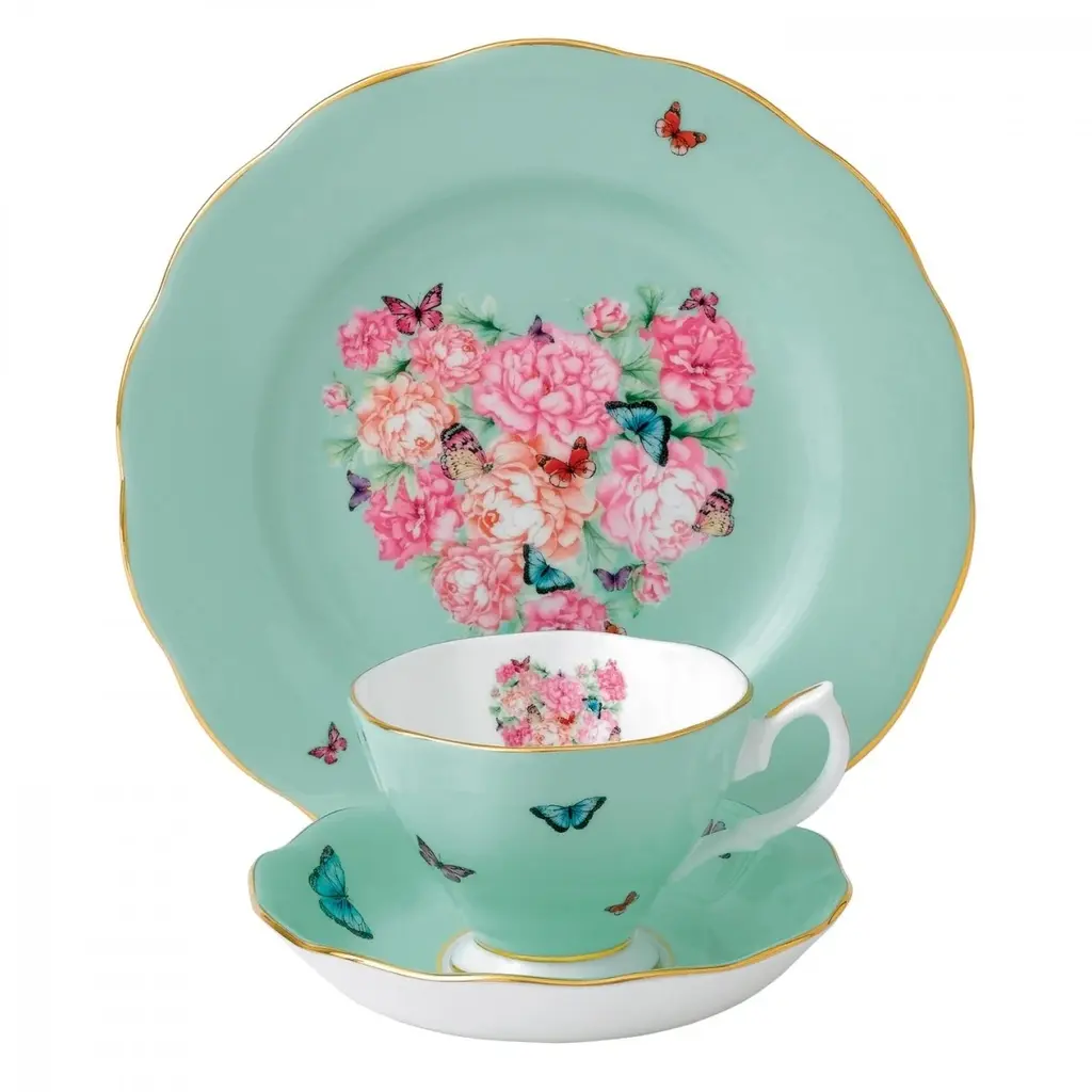 The Miranda Kerr for Royal Albert collection is delicate, delightful and totally Miranda. The blessings pattern is a green design decorated in Miranda's signature peonies and butterfly combination that forms a heart shaped posy. Features: Set include: One (1) teacup, (1) saucer and (1) plate Materials: Ceramic - bone china Finish: Multi Covered under advertising policy: No Lead: No Care instructions: Hand wash recommended Microwave safe: No Capacity: 6.5 oz. Dimensions: Overall dimensions: 3.5 inches high x 7.9 inches wide x 7.9 inches deep This product will ship to you in one (1) box.