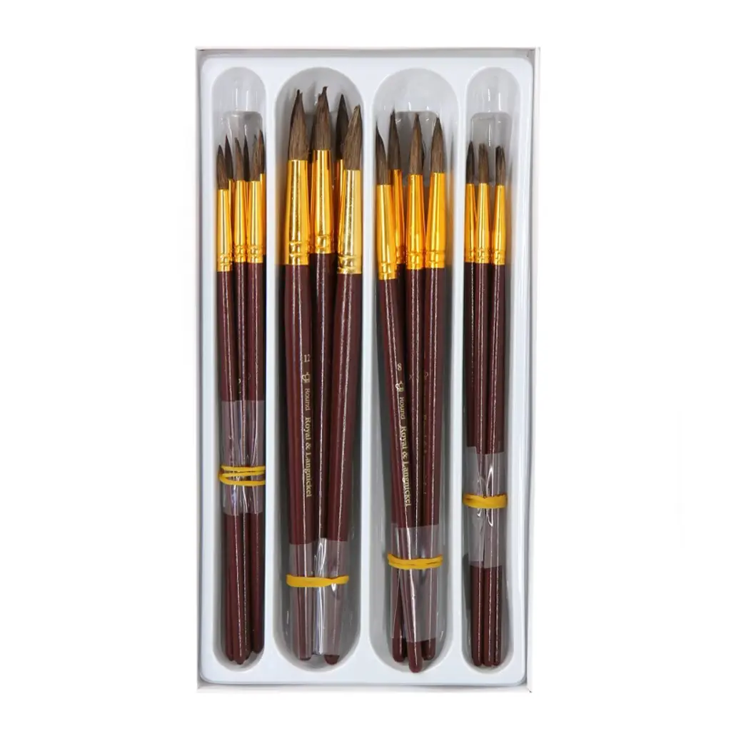 This value pack includes 24 camel hair brushes. Finest quality interlocked bristle with natural tapered ends. Extra long seamless nickel ferrules, polished ivory hardwood handles. Pack includes 6 of each size - Rounds 3, 5, 8, 12