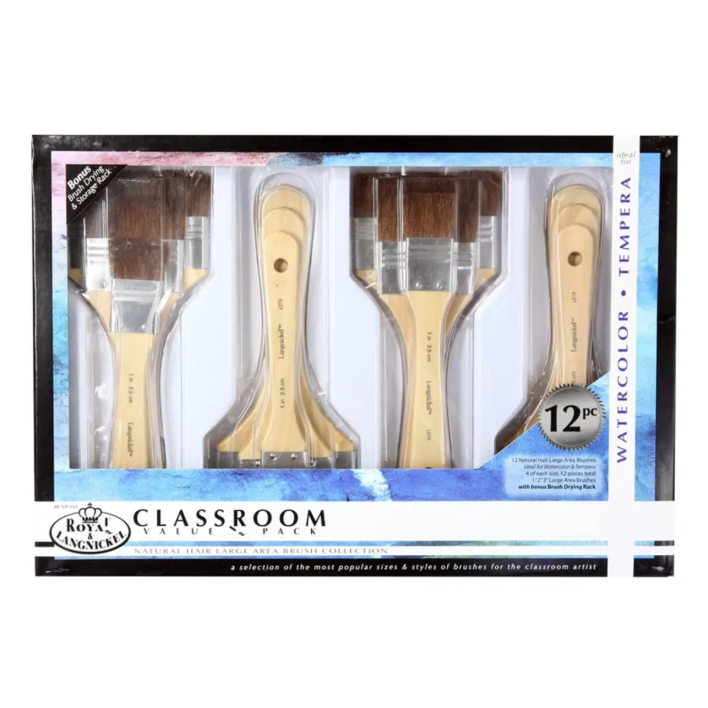 Royal Brush Soft Grip Brush Classroom Pack includes 72 brushes with 12 each of round size 3, 6 and 10, shaper size 8, 12 and 3/4 in wash brushes. Sold as 72 per pack. With so many sizes and styles to choose from, every artist will be able to find the perfect brush for their project.