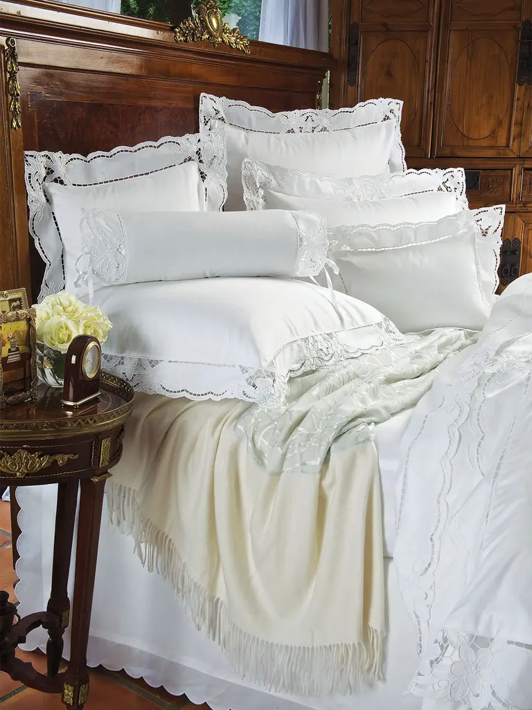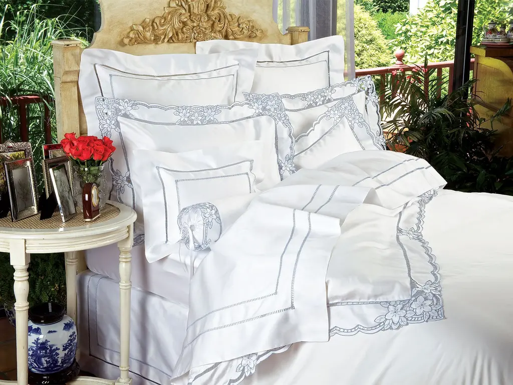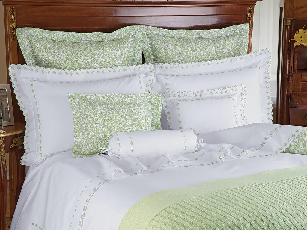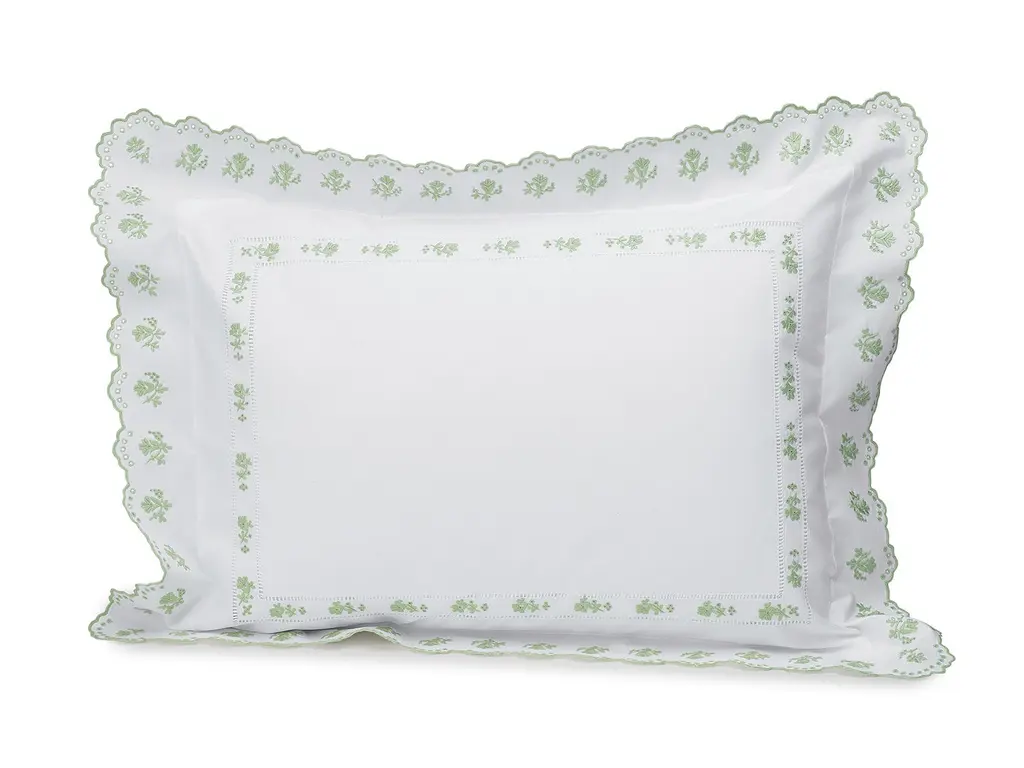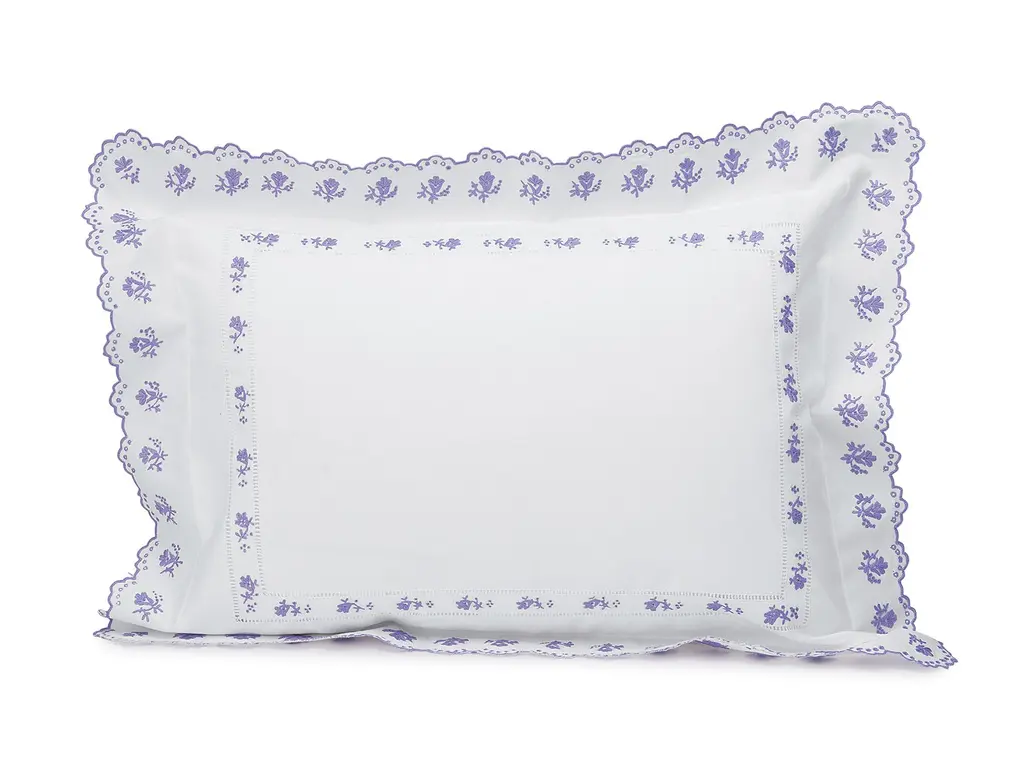 With its distinctive petals and graceful charisma our tulips in full bloom are sure to bring a smile to your face. Such delicacy as this can only be achieved by hand to create tiny flowers in Lavender or Green which symbolize royalty. Gracefully finished with an eyelet scallop flange on fine Italian 600 thread count, White Egyptian cotton percale, and infused with thoughtful meaning. Imported.