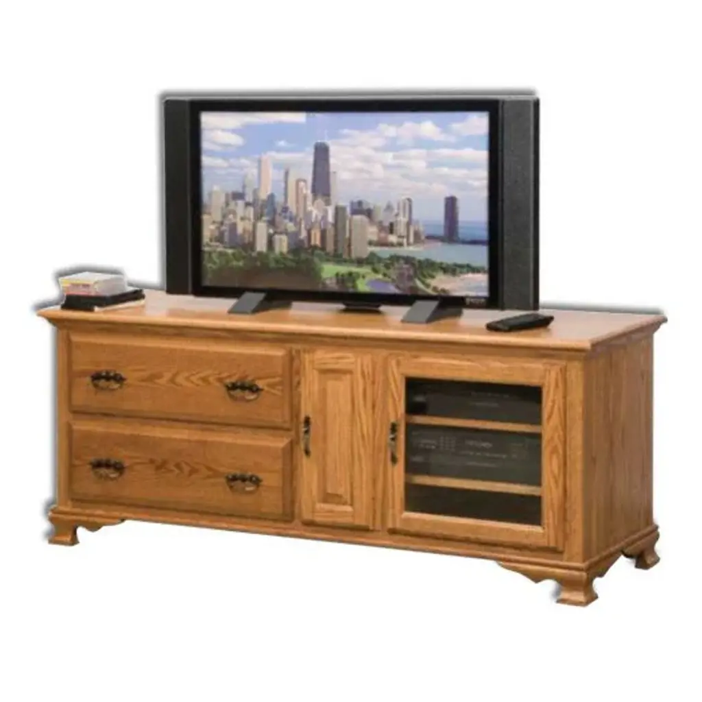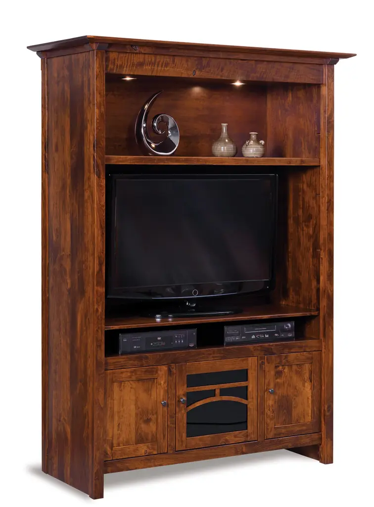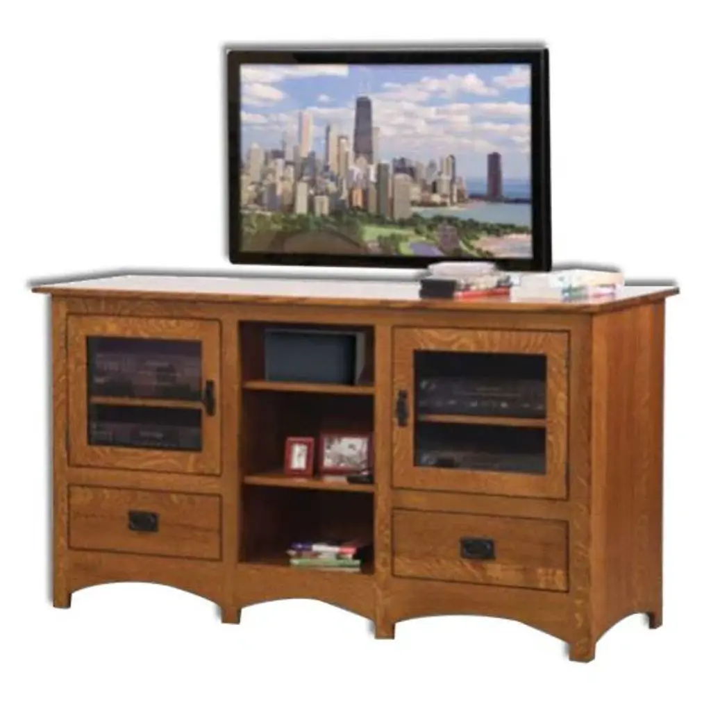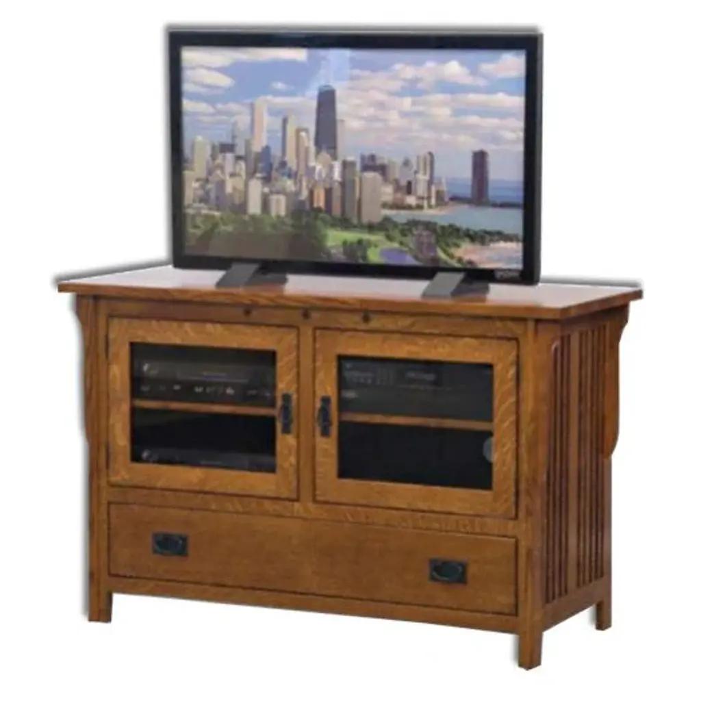 The Amish 60" Royal Mission Plasma LCD stand is a traditional Mission style featuring diamond inlays for the "Royal Touch". Standard features of the Royal Mission line are 1" thick tops, slatted sides, Mission Corbels, a grouping of 3 walnut inlays and full extension slides. Shown with standard black Mission hardware.
