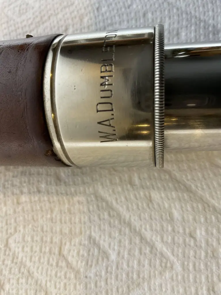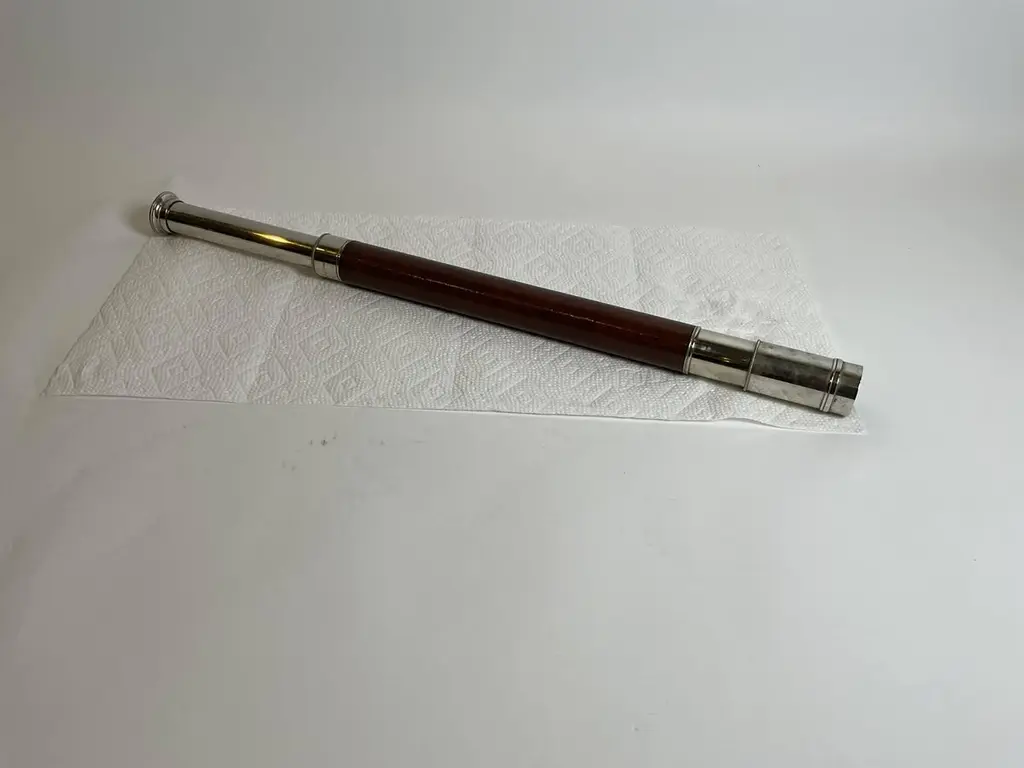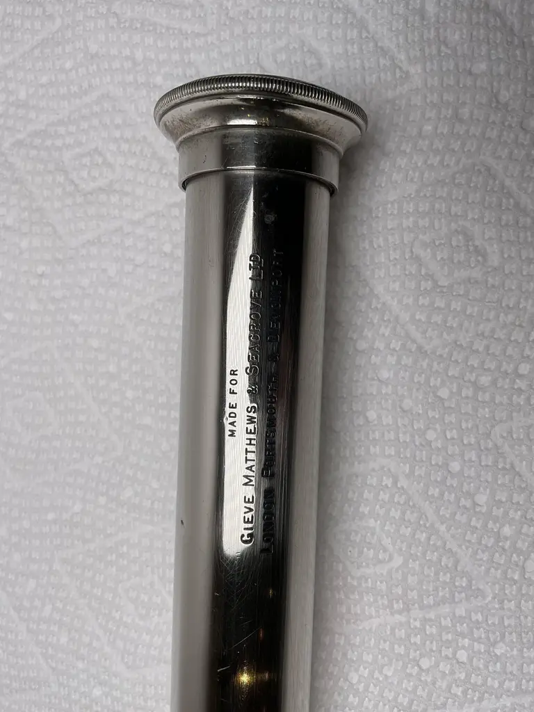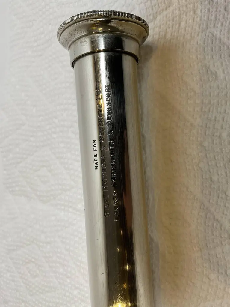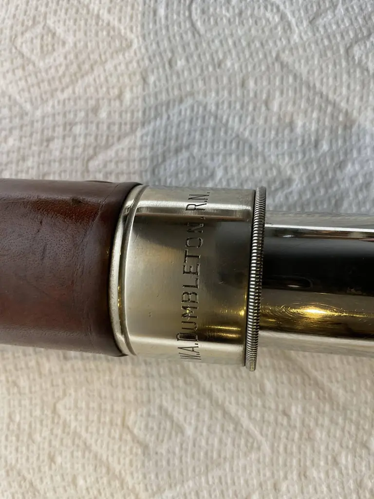 Leather bound British royal navy officers spyglass by Ross London for Gieve Matthews & Seagrove limited. High quality in great condition and exceptional optics. Barrel color is engraved on the outside W.A. Dumbleton R.N.(Royal Navy) HMS Gibraltar, Cossack, Afridi, Myngs, and as a captain of P37, A royal navy u class submarine. Fabulous Relic Circa 1930 23"L - open 1 1/2 diameter 2lbs.
