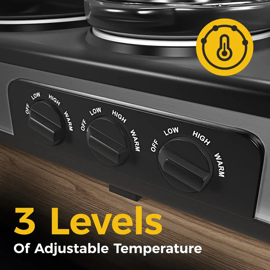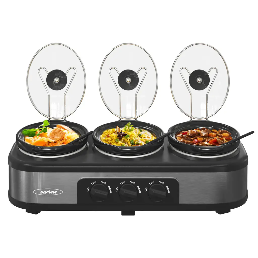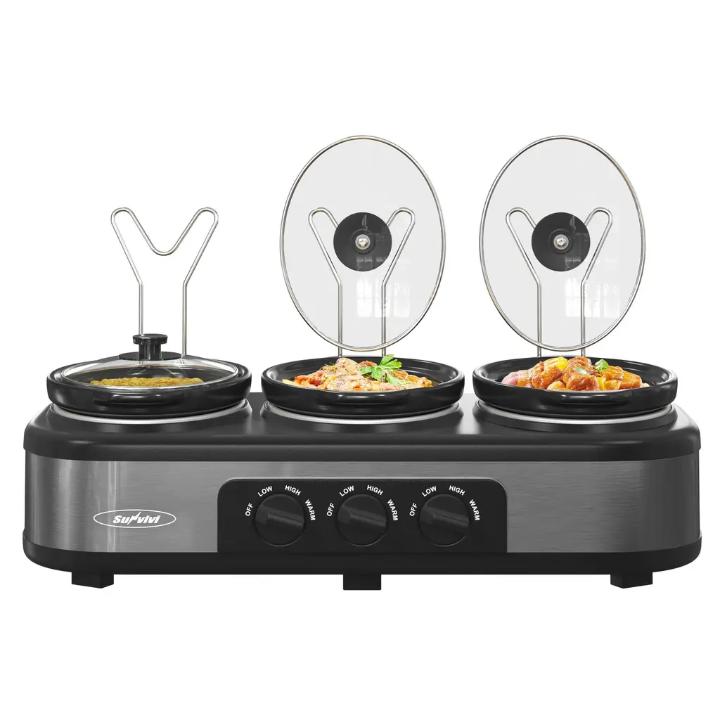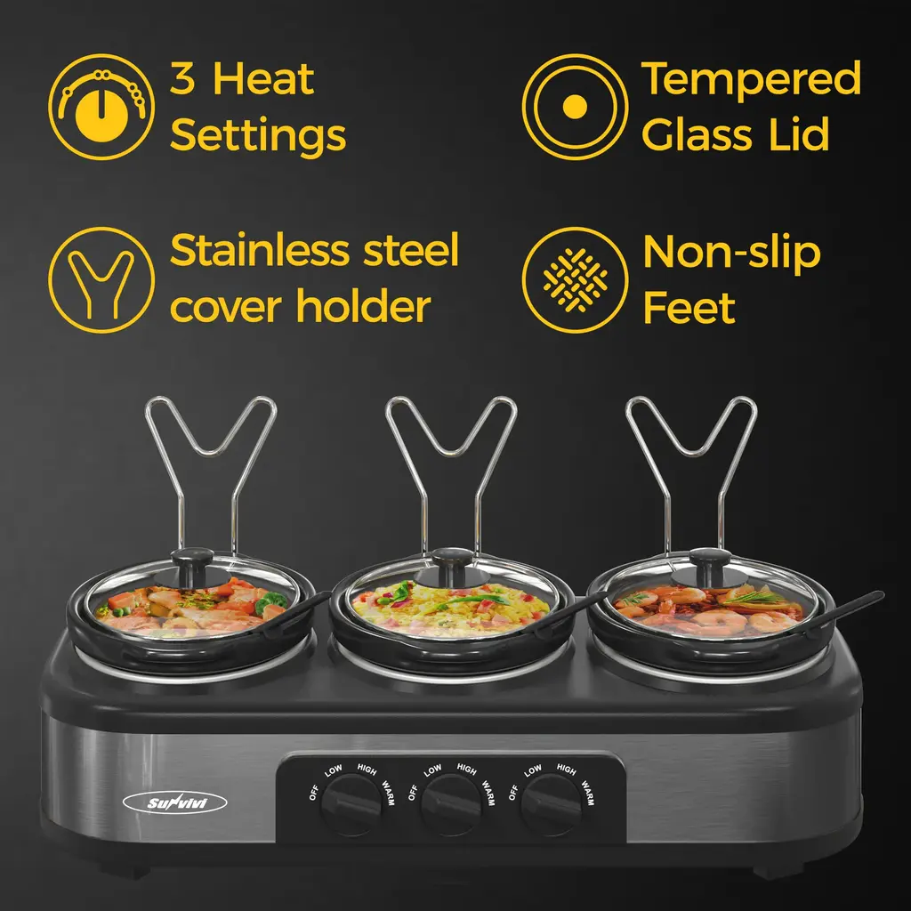 Entertain large groups with ease using the Royalcraft Triple Slow Cooker Stainless Steel. Warm multiple dishes at once with its three 1.5-quart removable ceramic pots, freeing up oven space for your busy lifestyle. Each pot includes a clear lid with a spoon slot for mess-free serving. The adjustable temperature control dial on each pot (LOW, HIGH, WARM) allows for a wide range of recipes with varying temperature requirements. Made of durable, stylish stainless steel, this buffet server adds elegance to any kitchen.Features:
