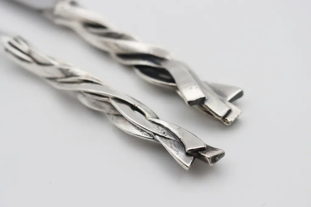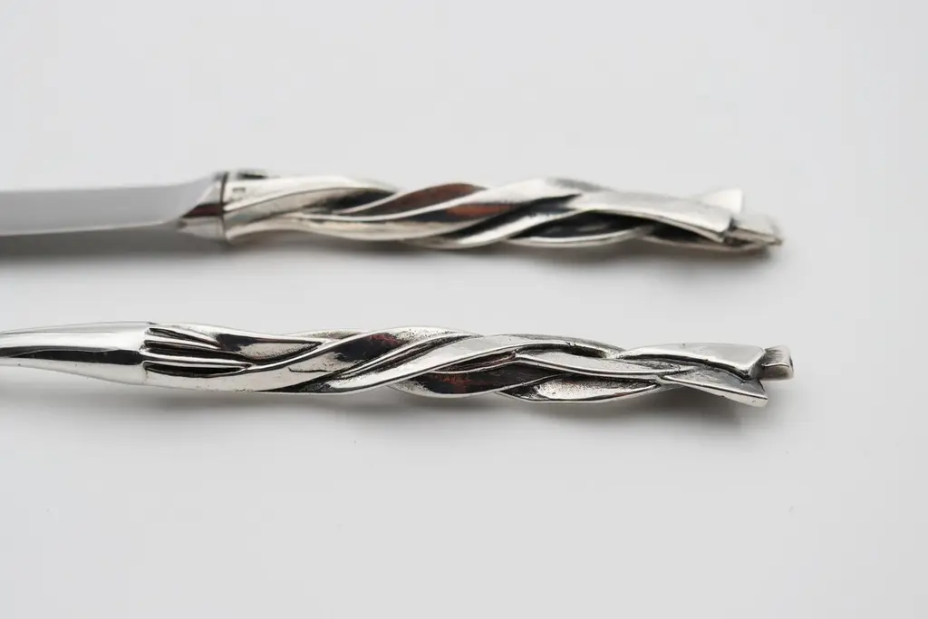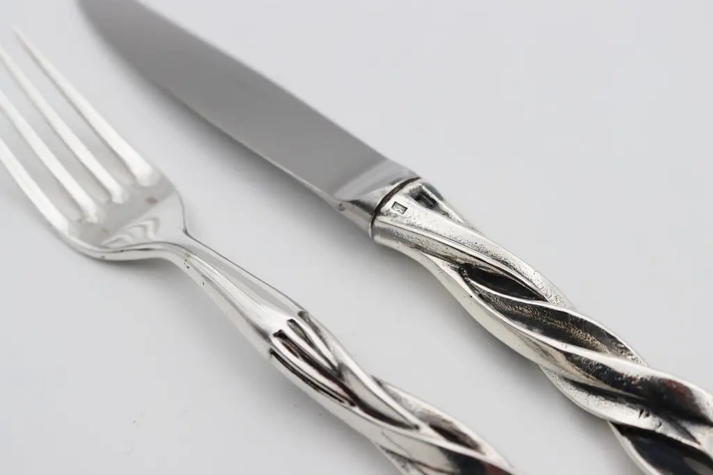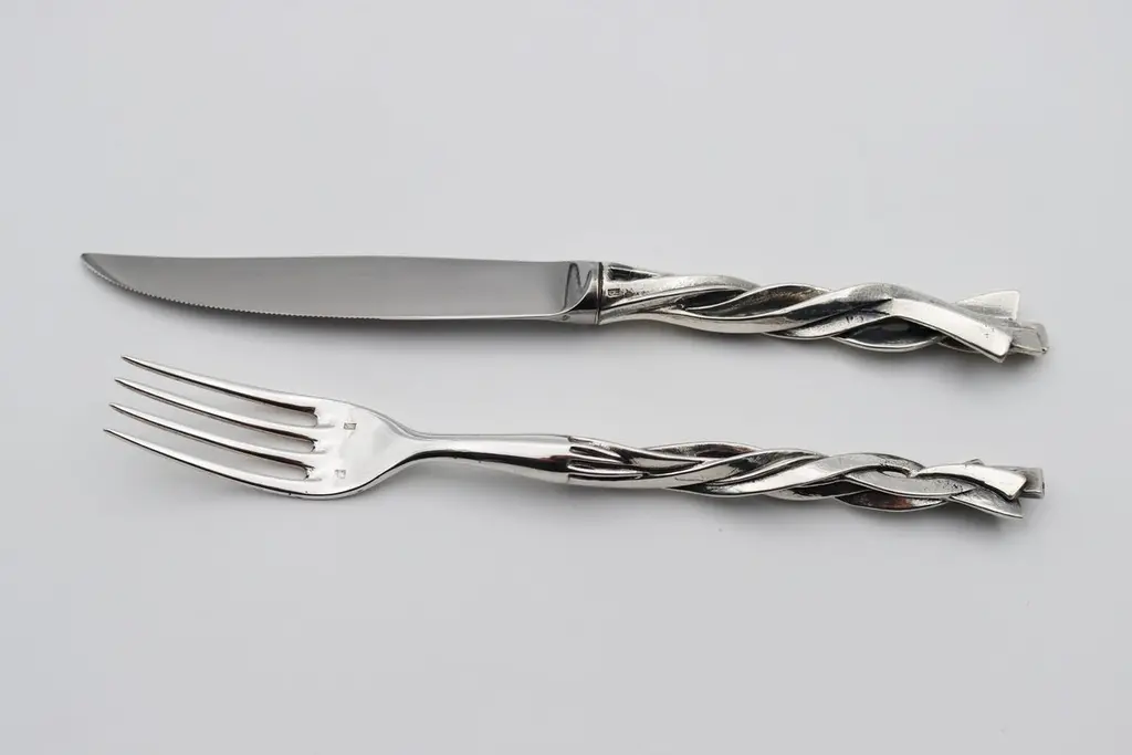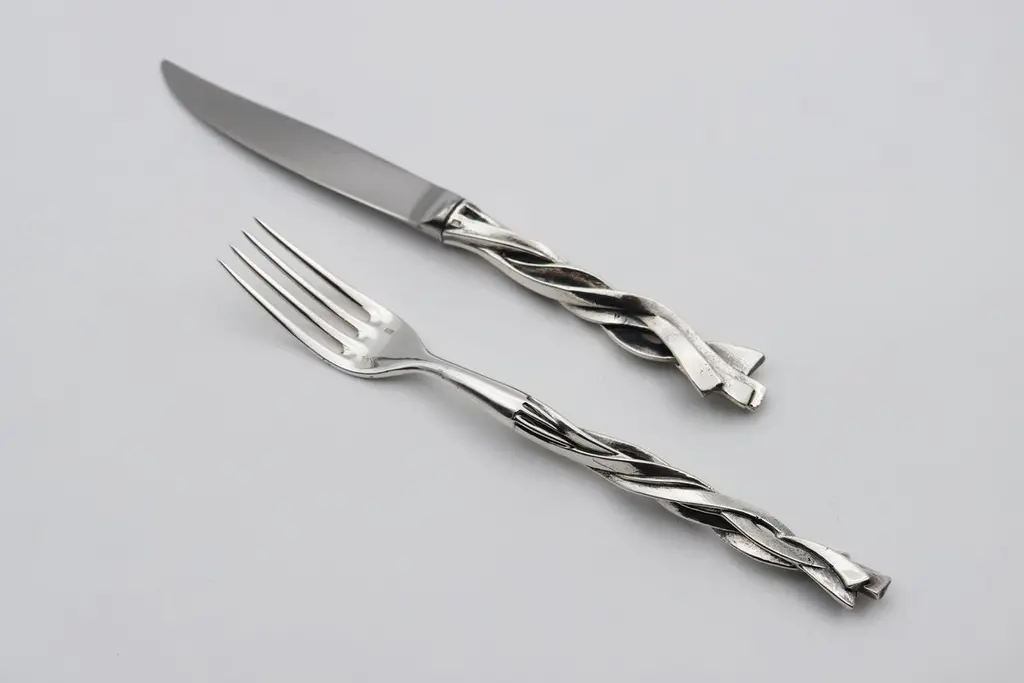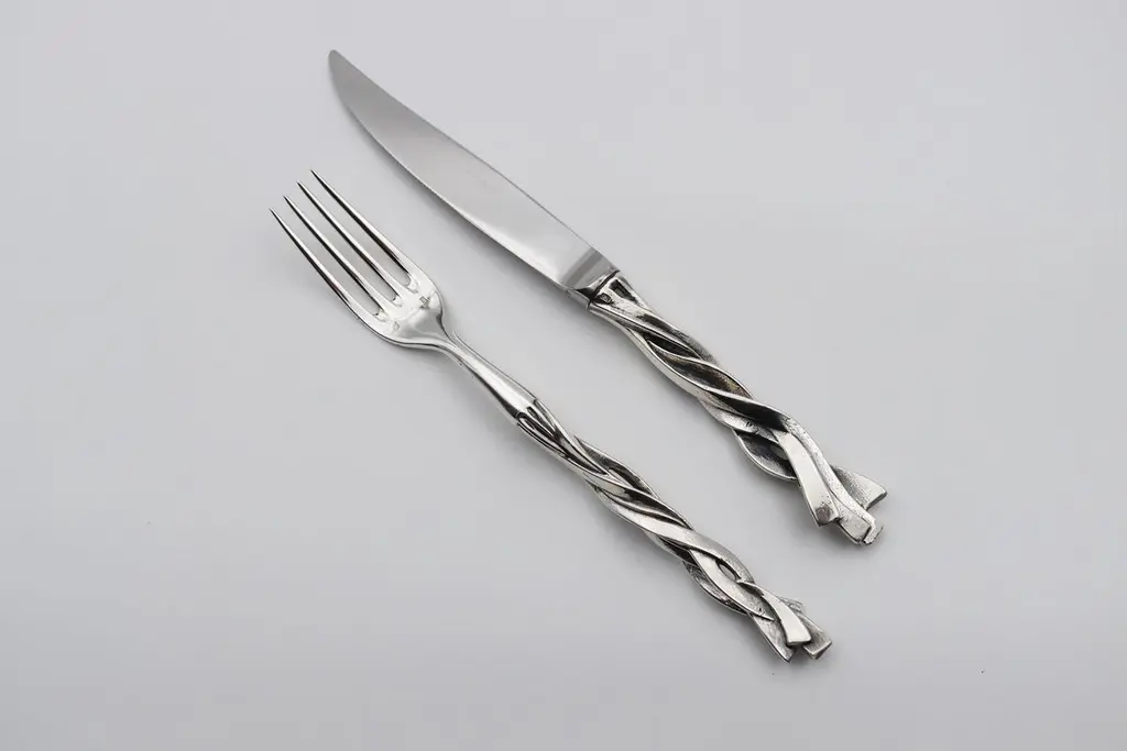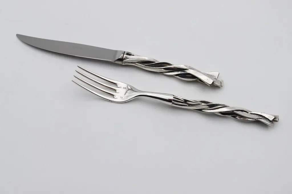 RUBAN Set of 2 pieces in silver bronze or gold bronzeSet of 2 pieces (table forks/fish, table knife or meat/fish knife) in silver bronze 35/42 micronsIt is possible to order all products separately or set of 4 pieceTable spoonTable forkTable knife/meat knife Fish knifeFish fork Dessert/cake/juice/tea-coffee spoonDessert fork Dessert knifeThese pieces are the handmade work of French designer Richard Lauret.These pieces are unique OR made to order.The products can be personalised with customised engraving (price on quotation).In the same collection are presented SERVICE PIECES, TABLE ACCESSORIES, INDIVIDUAL COVERS.