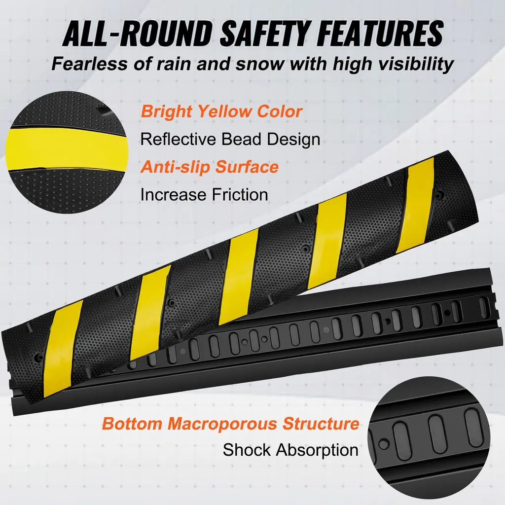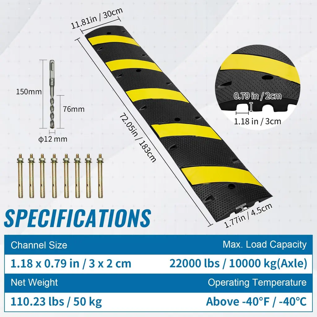 Well Designed 1/2 Pack 2 Channel: Our speed bump is designed to slow down the driving speed to create a more secure environment for pedestrians and cyclists. You will receive 2 pack of one-piece design rubber speed humps measuring 72.05 x 11.81 x 1.77 in, which can be used in one lane and pass through one car. The dual 1.18 x 0.79 in channel groove design provides protection for your cables. Rubber that Does More: Constructed from industrial-grade rubber! Our speed bump is waterproof, wear-proof, and low-temperature-resistant, with less odor and good flexibility for long-lasting use. Operating Temperature: Above -40℉. Get ready for materials and quality that do what they say! Security You Can Trust: This speed bump hump boasts 22,000 lbs/axle maximum load capacity for vehicles to pass by easily. The yellow stripes and reflective bead structure are eye-catching and highly reflective, warning vehicles to slow down in advance and enhancing passers-by's security. The anti-slip texture also enhances friction. Installation Made Easy: You can easily connect multiple speed humps to reach any desired length required for various road widths. The mounting holes allow you to use four complimentary expansion screws and a square shank drill to secure the rubber speed bump to the ground. Note: 1. After routing the cables through the slot, make sure to fill the remaining gaps with debris or other materials. 2. Ensure the installation surface is flat. Uneven surfaces may affect the product's load-bearing capacity. Peace of Mind for Every Occasion: Savor your journey and stop thinking about what could go wrong. The heavy-duty speed bumps are perfect for asphalt and are designed to slow down your vehicle, ensuring road and pedestrian security while securing cables. A must-have for public spaces with large traffic flows, such as parking lots, residential areas, schools, highways, roads, etc. Package Content 2 x Rubber Speed Bump Humps 8 x Expansion Screws 1 x Square Shank Drill (1 x Speed Bump 4 x Expansion Screws(M8*100 mm) 1 x Square Shank Drill(φ10 mm)) for 1Pack option