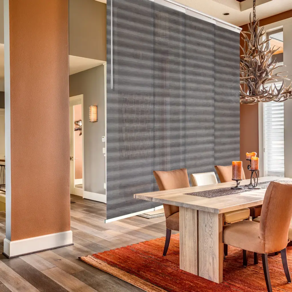 Central Design Products is pleased to introduce a new innovative panel track that offers easy 2-way installation, adding an alluring style and refined touch to your home decor. The single rail design of the track is sleek, compact, and reduces the overall footprint and weight of the installation, eliminating bulky, intrusive window treatments. Adjusting the panel height is a breeze � simply trim the panel, re-attach the liner, and install the panel weight. Detailed instructions are included.The panel track also features a patented slider design, made with aluminum and fitted with bearings that allow for durable and smooth operation. The sliders are stacked closer together than conventional panel tracks, reducing light bleed coming from the gaps between panels. This track has endless uses from dividing rooms, garages, offices, and closets to decorating windows and patios. Available in larger sizes including 8, 10, and 12 panels. Extends from 48-88� wide. Each panel measures 23.5" wide and 116" tall, with a total installation height of 118.5" (includes the 2.5" rail track). The track can be wall or ceiling mounted. The panels can stack on the left or the right. The clearance from the wall is extendable from 1.25� to 3.25� and projection from the wall is extendable from 3� to 4.25�. Rubi panel is made from 100% Polyester, with a light filtering shade that blocks 50% of the light.