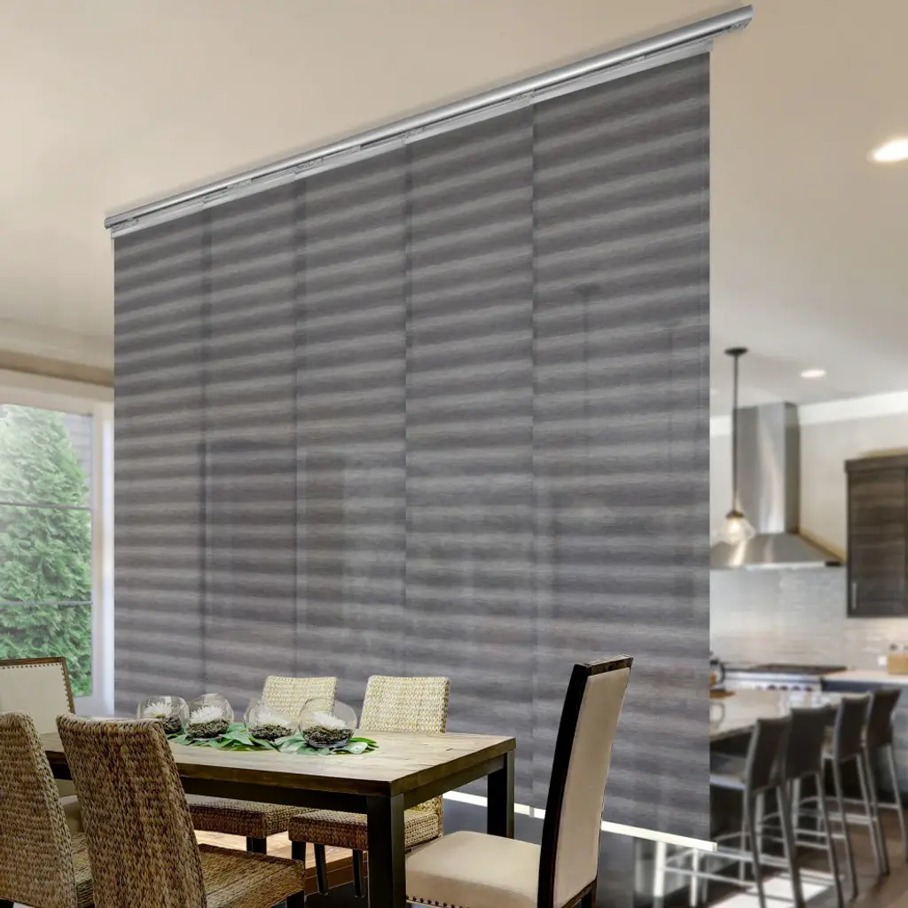 Central Design Products is pleased to introduce a new innovative panel track that offers easy 2-way installation, adding an alluring style and refined touch to your home decor. The single rail design of the track is sleek, compact, and reduces the overall footprint and weight of the installation, eliminating bulky, intrusive window treatments. Adjusting the panel height is a breeze � simply trim the panel, re-attach the liner, and install the panel weight. Detailed instructions are included.The panel track also features a patented slider design, made with aluminum and fitted with bearings that allow for durable and smooth operation. The sliders are stacked closer together than conventional panel tracks, reducing light bleed coming from the gaps between panels. This track has endless uses from dividing rooms, garages, offices, and closets to decorating windows and patios. Available in larger sizes including 8, 10, and 12 panels. Extends from 58-110� wide. Each panel measures 23.5" wide and 91.5" tall, with a total installation height of 94" (includes the 2.5" rail track). The track can be wall or ceiling mounted. The panels can stack on the left or the right. The clearance from the wall is extendable from 1.25� to 3.25� and projection from the wall is extendable from 3� to 4.25�. Rubi panel is made from 100% Polyester, with a light filtering shade that blocks 50% of the light.