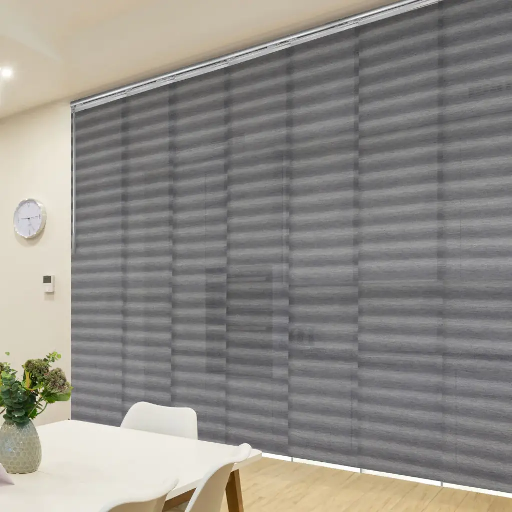 Central Design Products is pleased to introduce a new innovative panel track that offers easy 2-way installation, adding an alluring style and refined touch to your home decor. The single rail design of the track is sleek, compact, and reduces the overall footprint and weight of the installation, eliminating bulky, intrusive window treatments. Adjusting the panel height is a breeze � simply trim the panel, re-attach the liner, and install the panel weight. Detailed instructions are included.The panel track also features a patented slider design, made with aluminum and fitted with bearings that allow for durable and smooth operation. The sliders are stacked closer together than conventional panel tracks, reducing light bleed coming from the gaps between panels. This track has endless uses from dividing rooms, garages, offices, and closets to decorating windows and patios. Available in larger sizes including 8, 10, and 12 panels. Extends from 110-153� wide. Each panel measures 23.5" wide and 116" tall, with a total installation height of 118.5" (includes the 2.5" rail track). The track can be wall or ceiling mounted. The panels can stack on the left or the right. The clearance from the wall is extendable from 1.25� to 3.25� and projection from the wall is extendable from 3� to 4.25�. Rubi panel is made from 100% Polyester, with a light filtering shade that blocks 50% of the light.