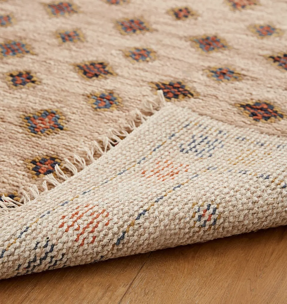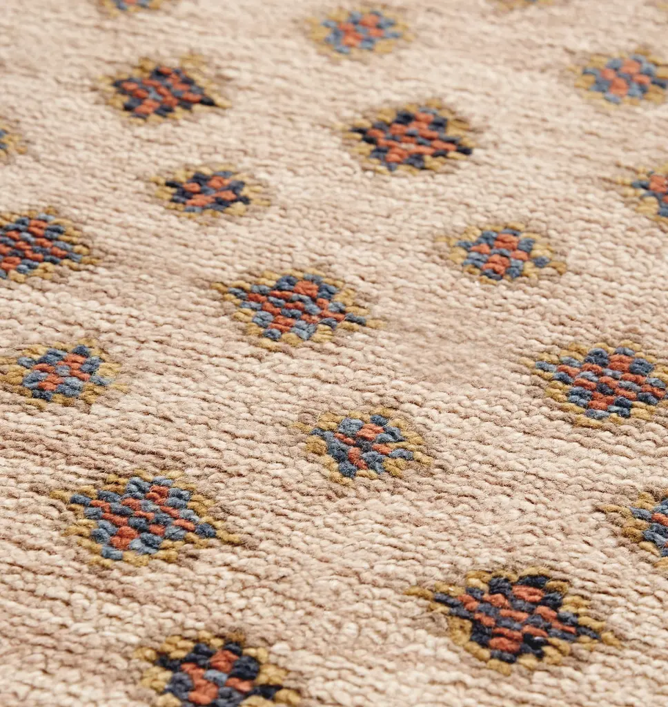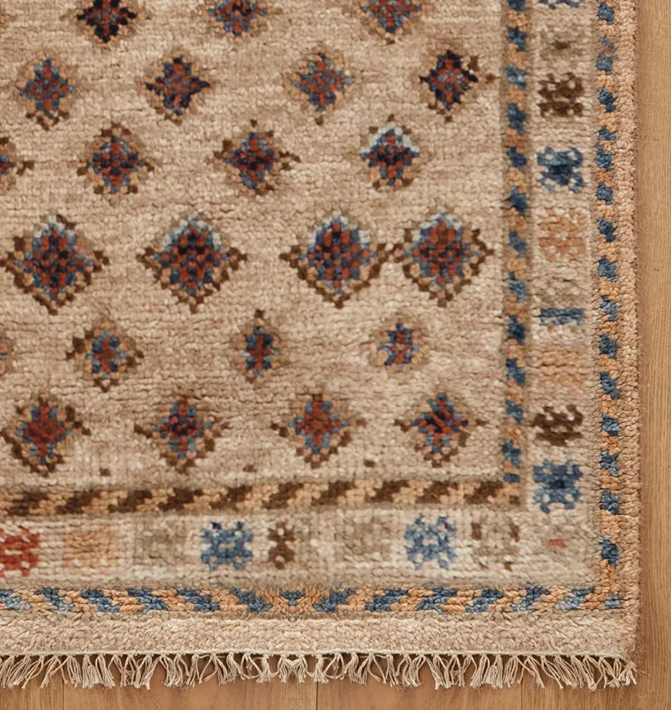 Inspired by a rug from our Rejuvenation Vintage archive, our Ruby Hand-Knotted Rug showcases a charming all-over diamond pattern in a beautiful muted, neutral colorway with accents of blue and gold. Handcrafted by expert artisans using 100% wool, Ruby will add enduring style to your living room, bedroom, or dining room. Details You'll Appreciate Vintage-inspired diamond design Neutral palette Available in several sizes Crafted 100% by hand using a hand-knotting technique Product Specifications 100% Wool Density: 30 knots per square inch Pile height: 3/4" Scale of motifs, pattern, and borders will adapt according to rug size Corner swatch represents 8' x 10' motif Use of a rug pad is recommended For indoor use only