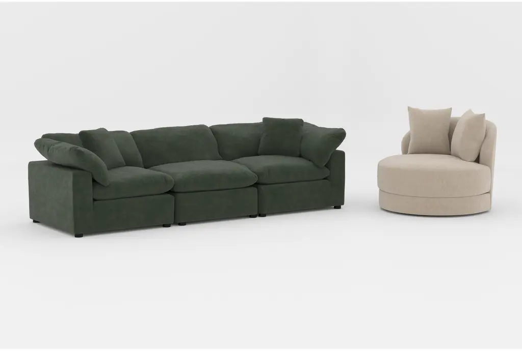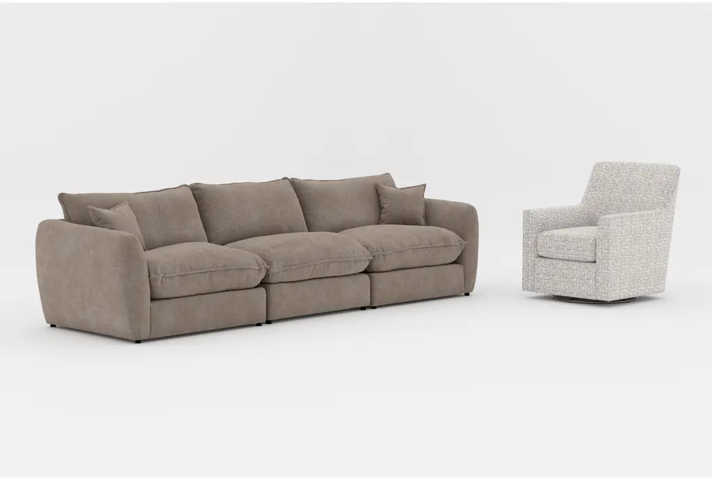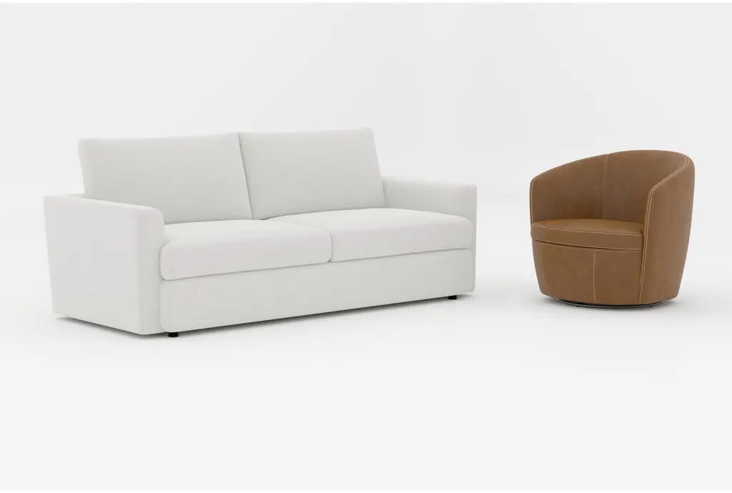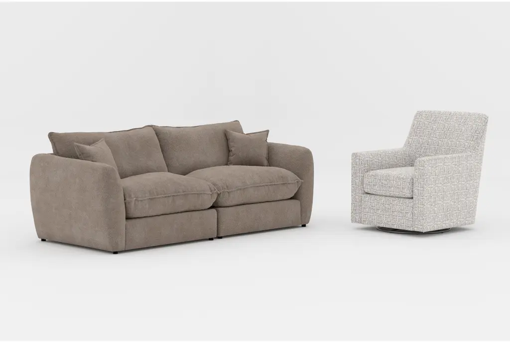 Combining three trends in one irresistible design, our Ruby boucle modular sofa will be the toast of your living room. Made for you exclusively by Living Spaces, these pieces offer the flexibility of modularity, allowing you to switch, change and rearrange the configuration to your liking. Wide and deep, plush cloud-like seats with interior foam cores encased in down alternative fiber-filled bags are sink-in soft yet supportive. Loose, reversible cushions ensure even wear and longevity, plus easy cleanability, while boucle fabric in multiple colors lends a fresh, stylish look and feel. The Guiliana swivel barrel egg chair pairs perfectly.