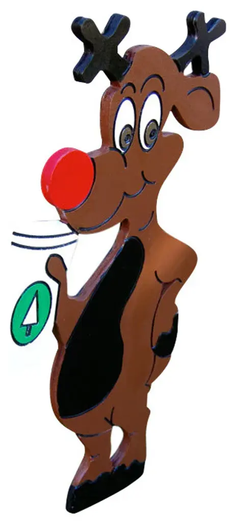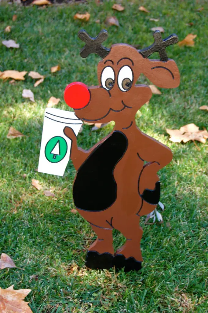 I love coffee so I had to make this sign. Rudolph holding a cup of Christmas cheer to ready himself for his duties ahead.This sign measures 23 inches tall by 11 inches wide cut out of half inch outdoor sign wood.The signs details are engraved into the wood painted with 2-3 coats of exterior paint and then sealed for protection. The back of the sign is painted black and comes with a steel stake for ground placement.