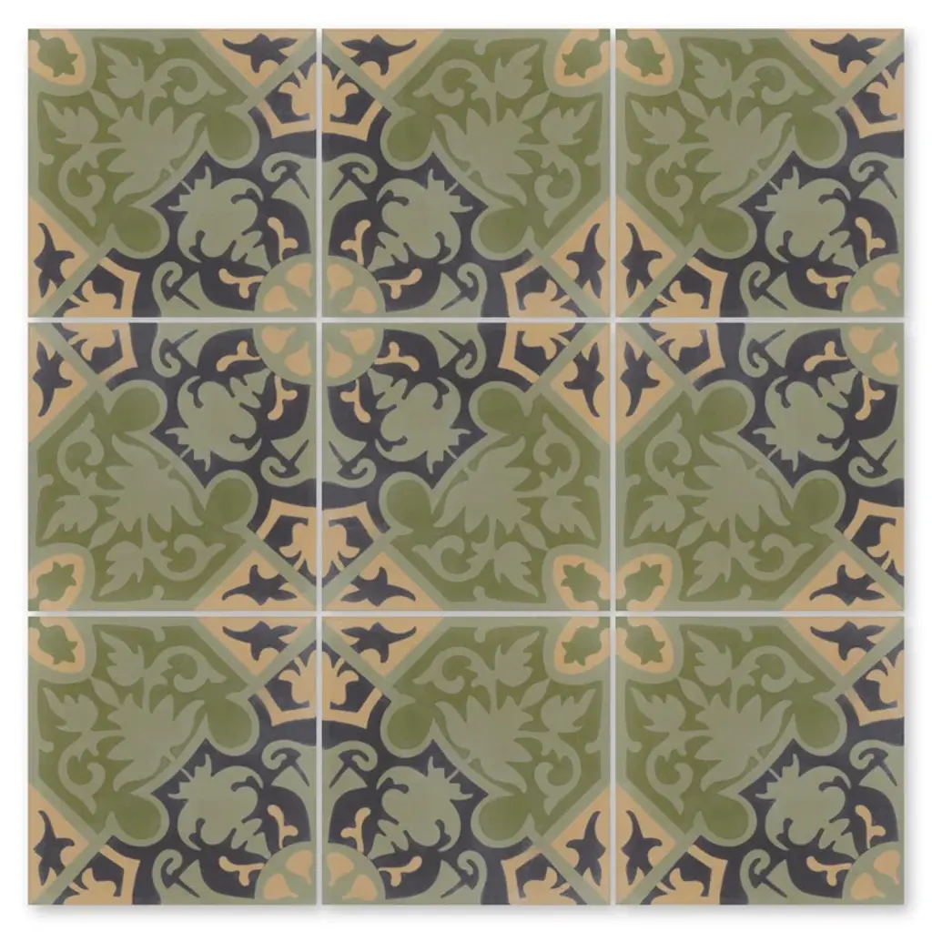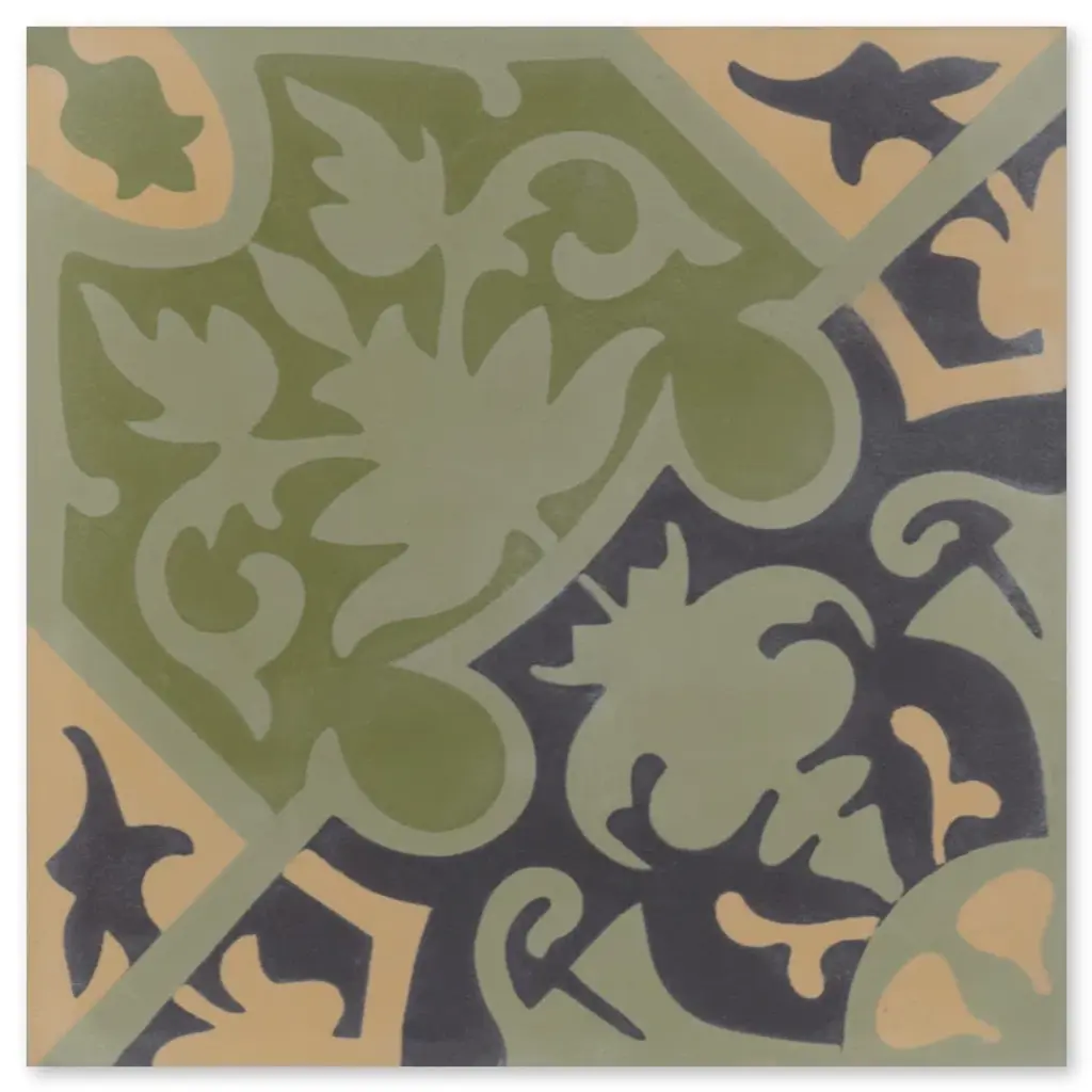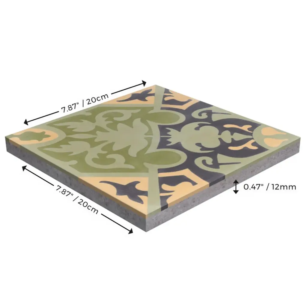 This cement tile is hand-crafted by master artisans using a process over 150 years old. Low-energy non-fired decorative tile is produced from cement, mineral pigments, ground marble dust, and sand, then pressed and cured to produce one of the most beautiful surfaces on the market. The hand-made nature of cement tile means that no two tiles are alike, with color and pattern variations that give it a beauty similar to natural stone and hardwood surfaces. With proper sealant and care, cement tile makes a great durable surface for residential or commercial floors, walls, and creative uses indoors and outdoors. Note: Cement tiles need to be sealed once or twice, before grouting and general usage.