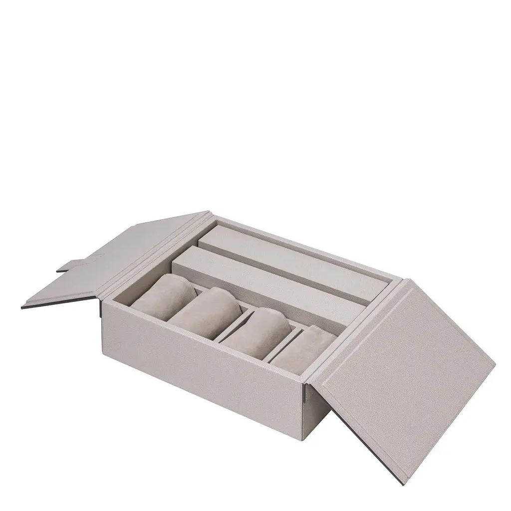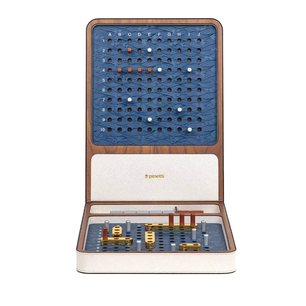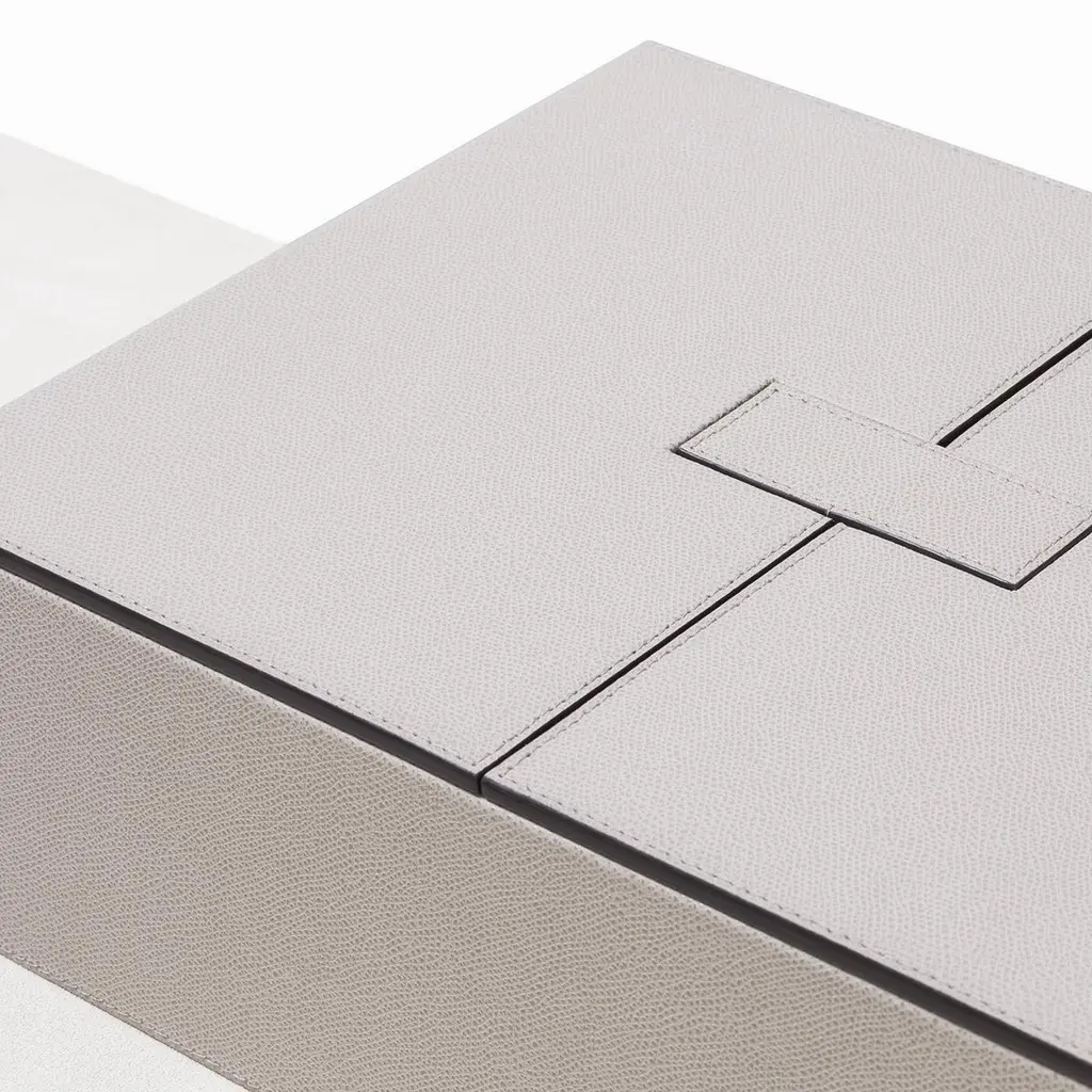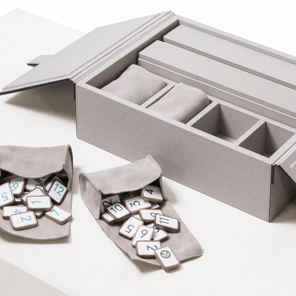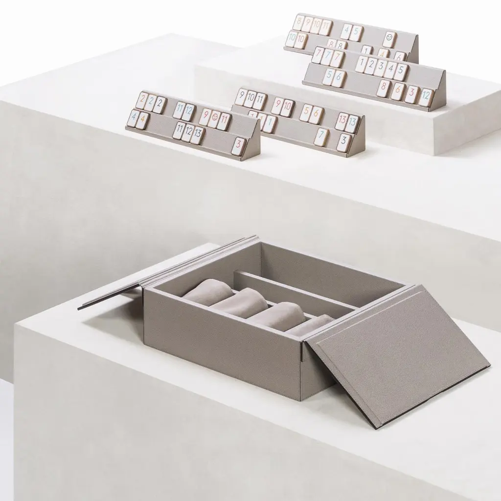 Presented in a compact and elegant wooden box wrapped in dove gray leather, this extraordinary game set is a truly unique item of great quality and style. This set includes four Rummikub racks and walnut tiles with white nappa leather inserts and bold-printed numbers stored by color in four soft suede pouches. Customization in other colors is available on request.