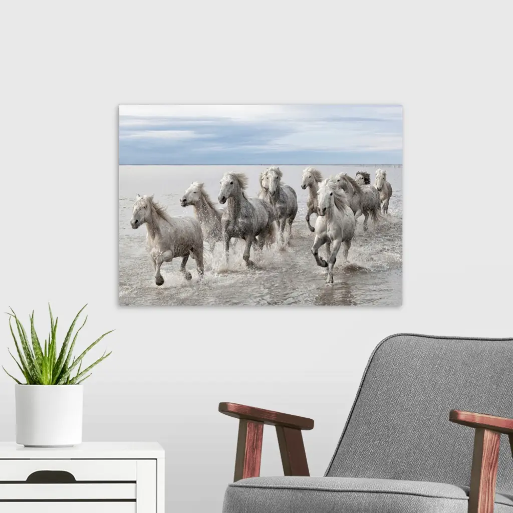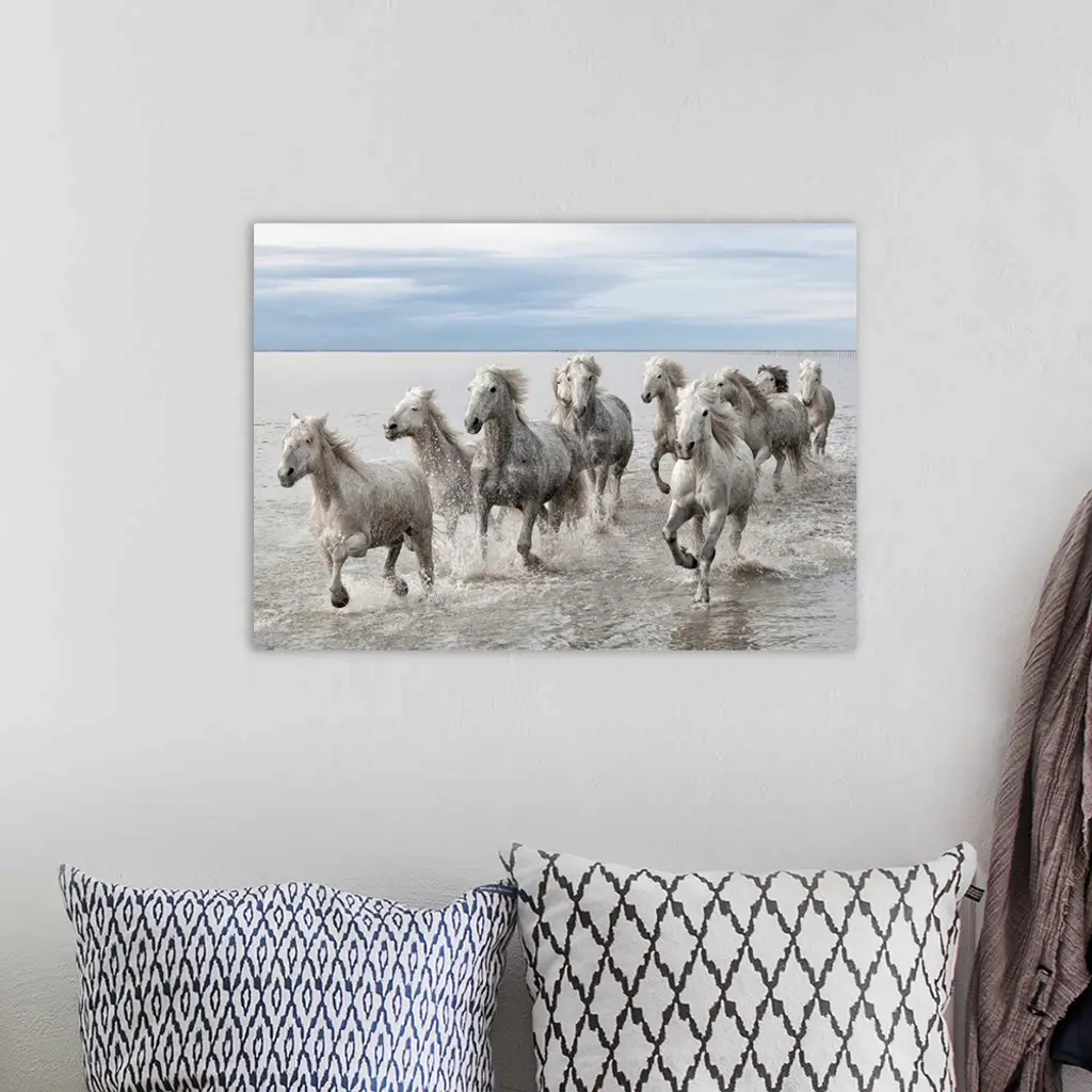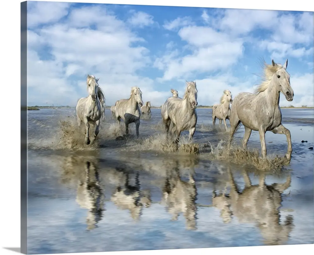Wildlife photograph of a herd of wild horses galloping across the water.
