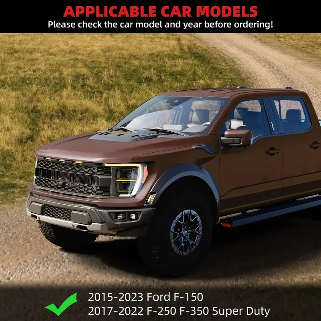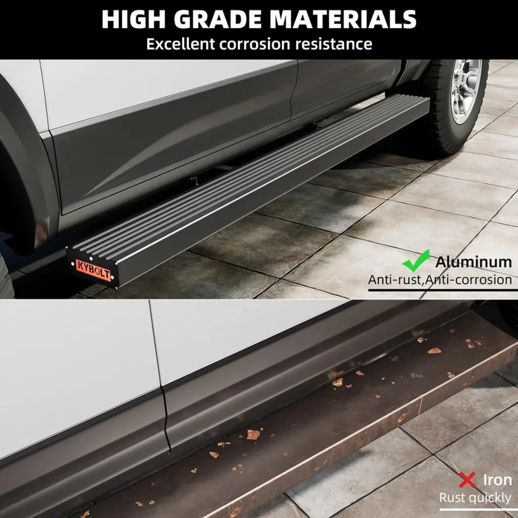 Heavy-Duty 6.5" Aluminum Running Boards for Ford F150 & Super Duty Crew Cab (2015-2024)Exclusive Ford Truck CompatibilityPrecision-engineered for 2015-2024 Ford F150 SuperCrew 4-Door and 2017-2024 Ford F250/F350 Super Duty Crew Cab models. Features vehicle-specific mounting points for a seamless OEM-style fit and rugged aesthetic integration.High-Strength Aluminum Alloy BuildConstructed from aerospace-grade aluminum alloy with a reinforced steel core for maximum impact resistance and a 400 lb weight capacity per step. Rust-proof and suitable for all climates and road conditions.Extra-Wide Anti-Slip Step SurfaceBoasts a 6.5-inch width with textured ABS plastic stepping panels for superior traction. Deep grooves channel water, mud, and snow away, ensuring safe entry and exit even in slippery environments.Quick Solo InstallationIncludes all pre-assembled brackets, hardware, and detailed instructions. Designed for tool-free or minimal-tool installation¡ªmost users can complete the setup in under 20 minutes without professional help.Sleek Black Finish & Low-Profile DesignCombines rugged functionality with a streamlined appearance. The matte black finish resists scratches and corrosion while complementing the factory styling of modern Ford trucks.Product Specifications:Material: Aluminum Alloy + Reinforced Steel BracketsFinish: Matte BlackStep Width: 6.5 inchesLoad Capacity: 400 lbs per sideDimensions: 79.5"L x 8.7"W x 8.7"HCompatibility: 2015-2024 F150 SuperCrew; 2017-2024 F250/F350 Super Duty Crew CabIncluded: Mounting Hardware, Installation Guide
