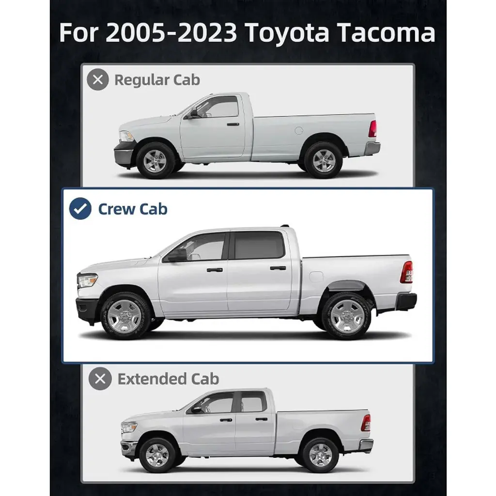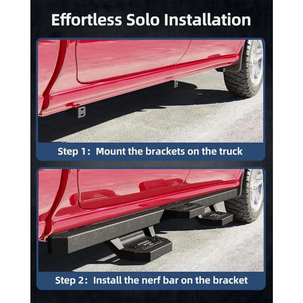 Built specifically for the 2005–2023 Toyota Tacoma Double Cab, these running boards look factory and fit like it, aligning to OEM mounting points for a clean, integrated finish. The wide, stable step with a textured, non-slip tread gives you confident footing in rain or snow, making school drop-offs, grocery runs, and weekend trail days easier for kids, pets, and anyone who prefers a lower step. High-strength steel and a corrosion-resistant coating stand up to road salt and year-round weather, while closed end caps help keep out dirt and grime. Beyond access, the boards help guard rocker panels and door edges from gravel and small scuffs kicked up by the tires. Installation is straightforward: vehicle-specific brackets and all hardware are included for a quick, bolt-on setup with no drilling on most model years. Not compatible with Regular Cab.