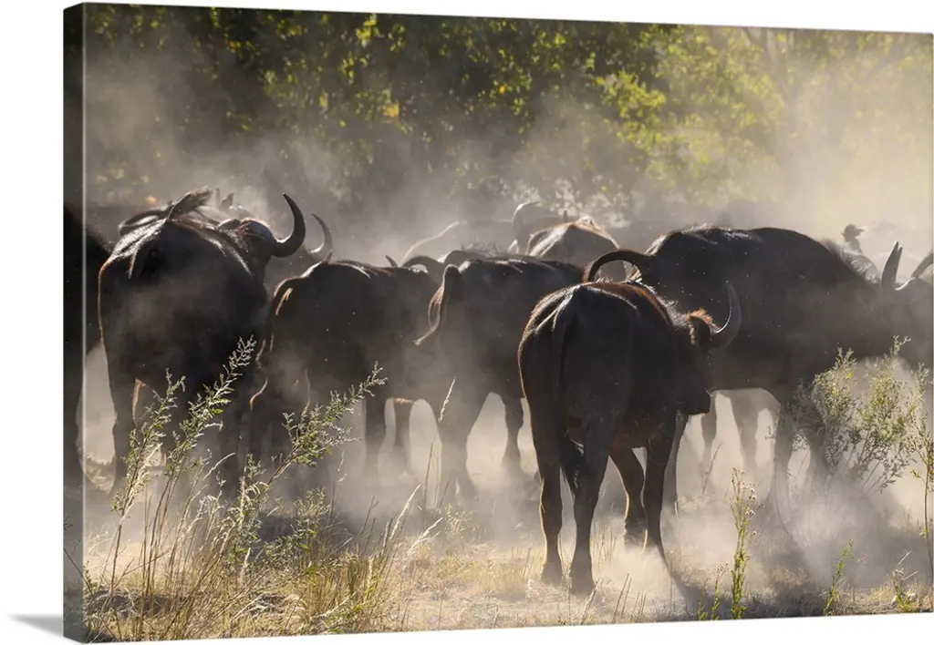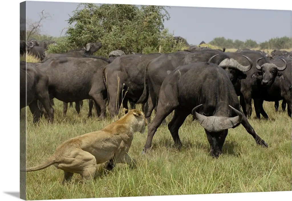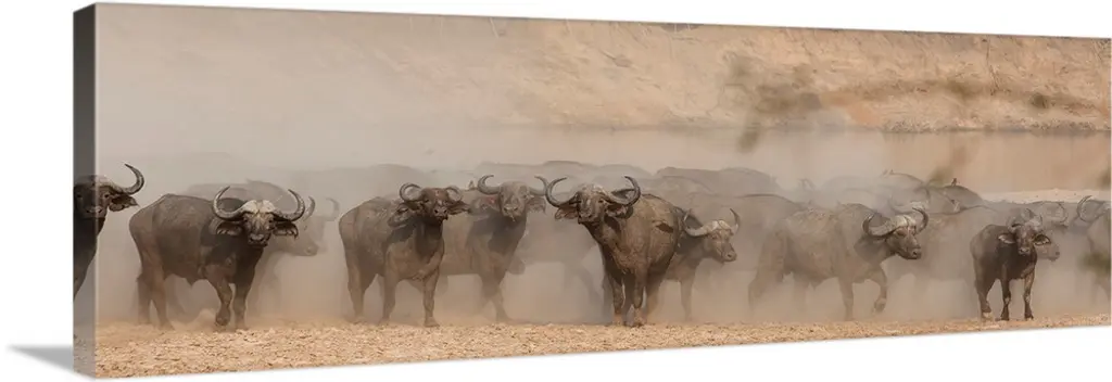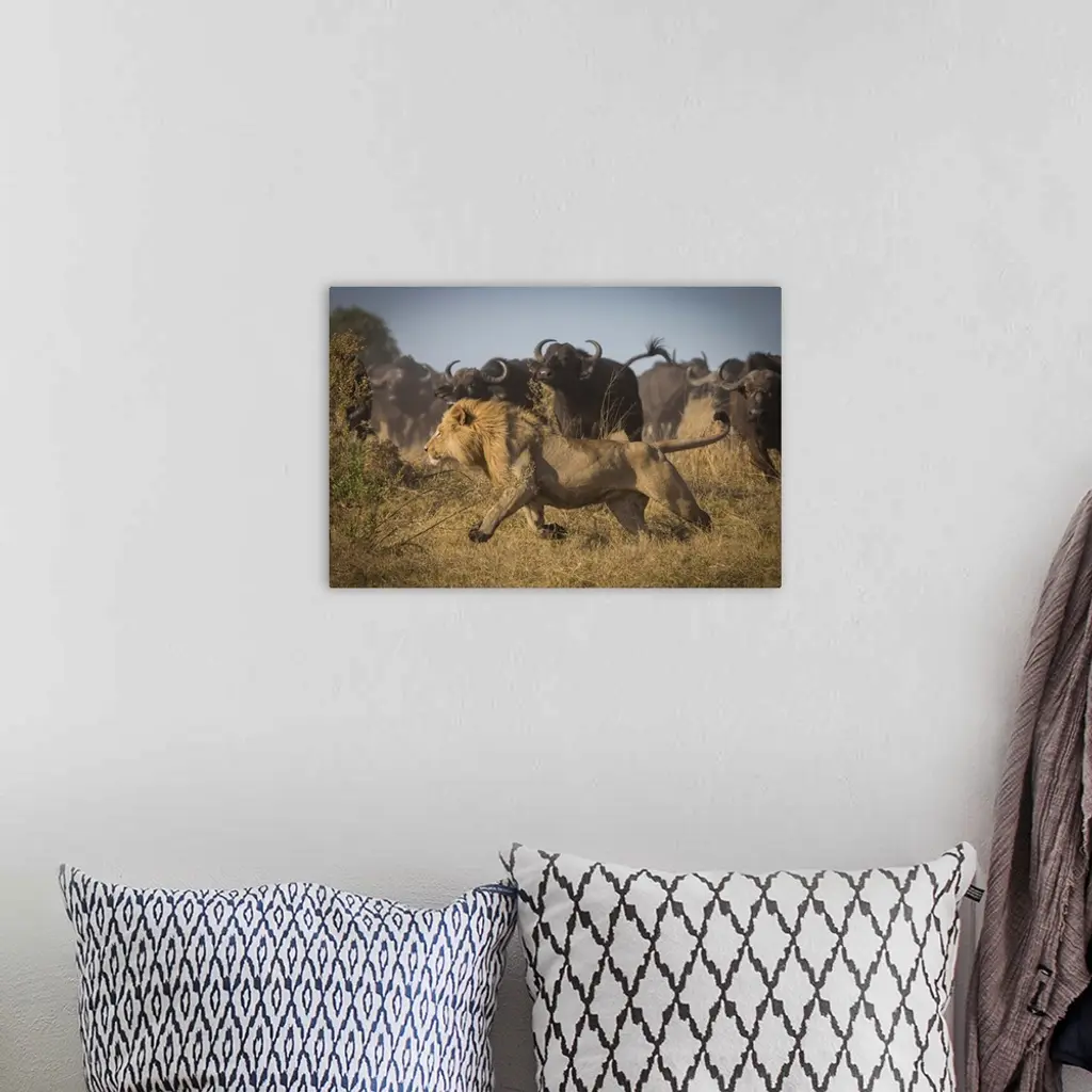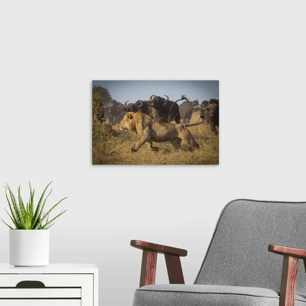 A male lion running with large stampeding cape buffalo barreling in from the distance.
