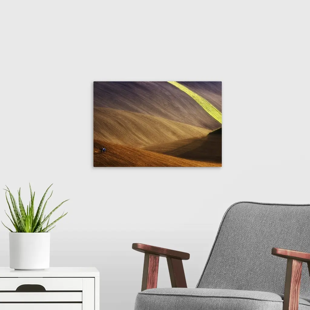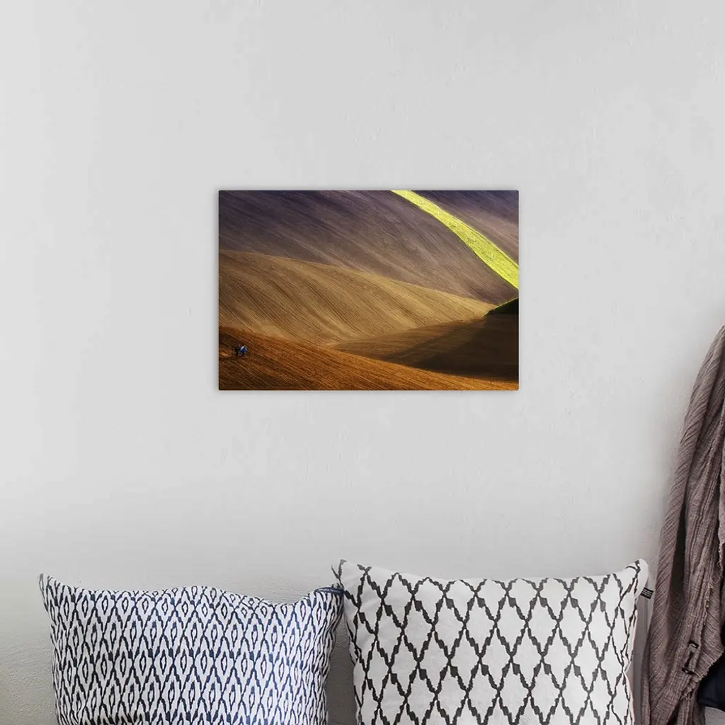 Three people run across dusty hills, with a streak of grass and power lines in the distance.
