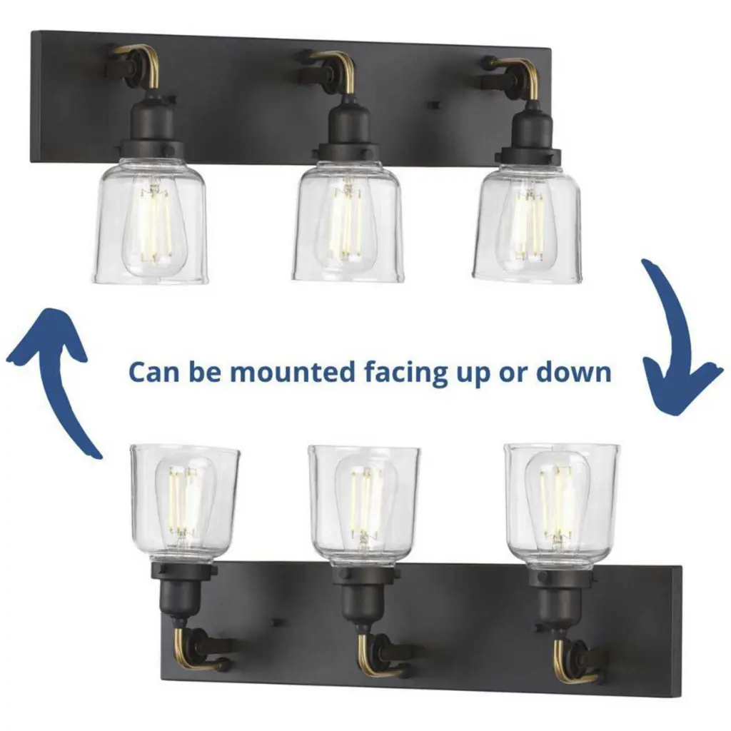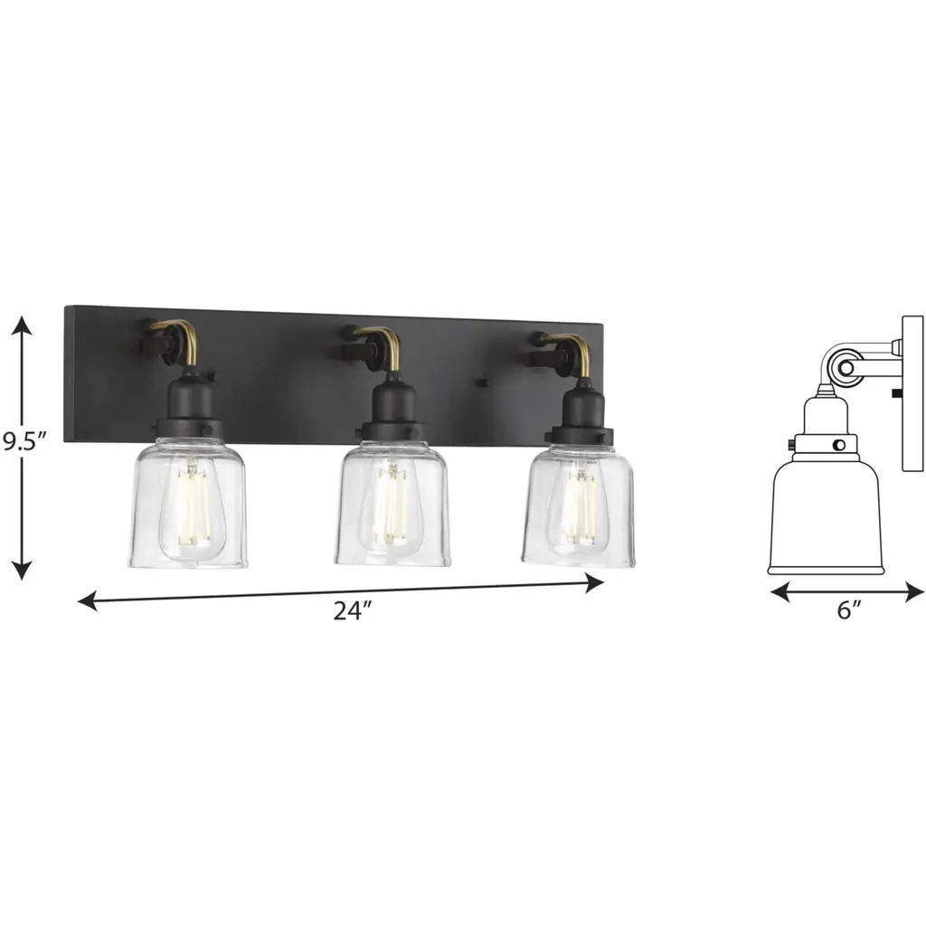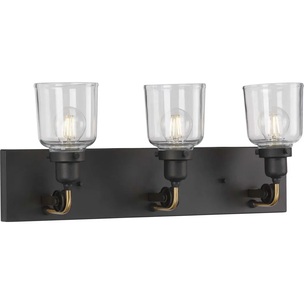 Give a nod to days of old with the Rushton three-light bath. A timeless trilogy of exposed bulbs enveloped in clear glass shades dangle from antique-style sockets. Antique Brass tube arms wind around mechanical pulley wheels as they anchor the bulbs to the Graphite-finished backplate. This ensemble of historical elegance is a must-have as a bath vanity or wall sconce in industrial and farmhouse settings.
