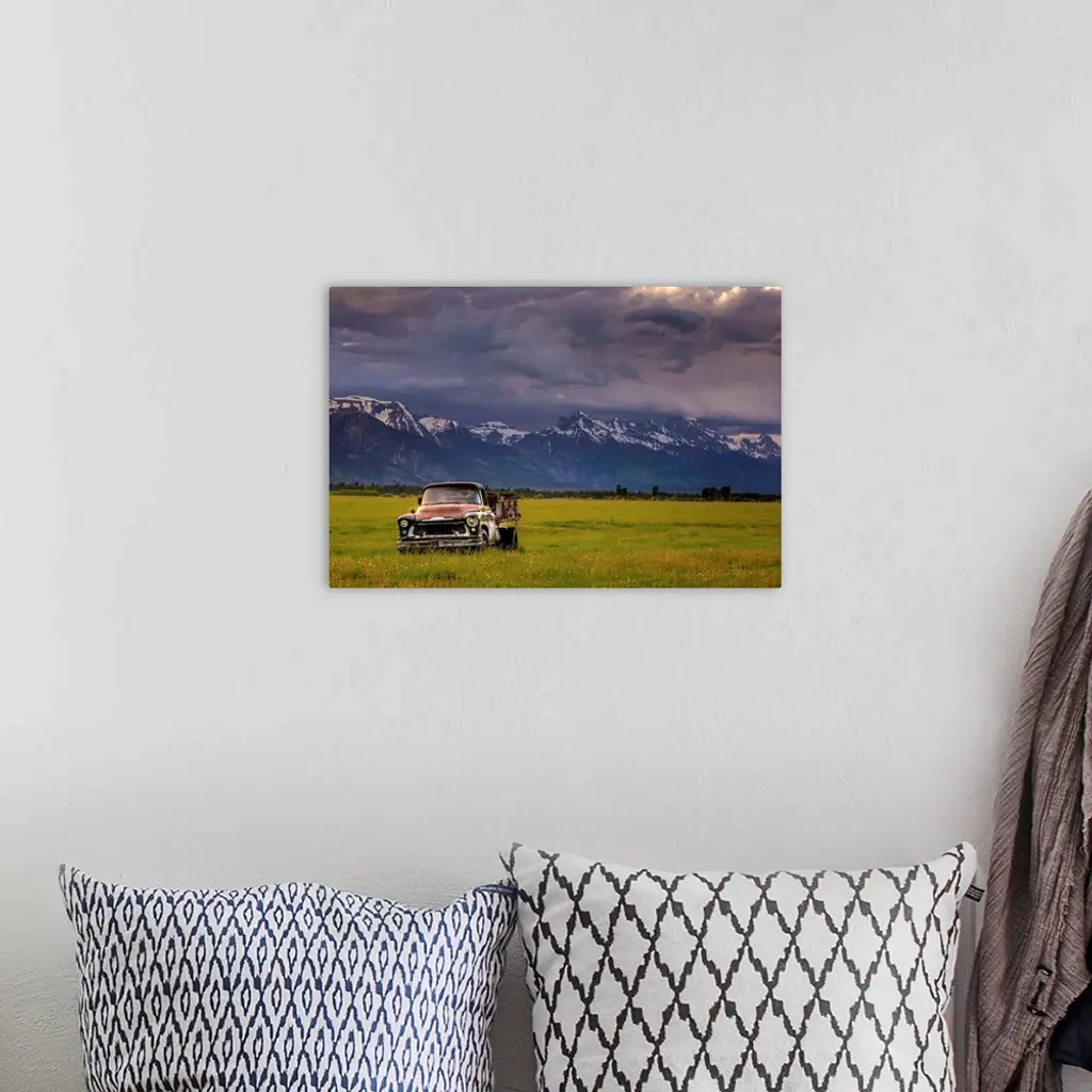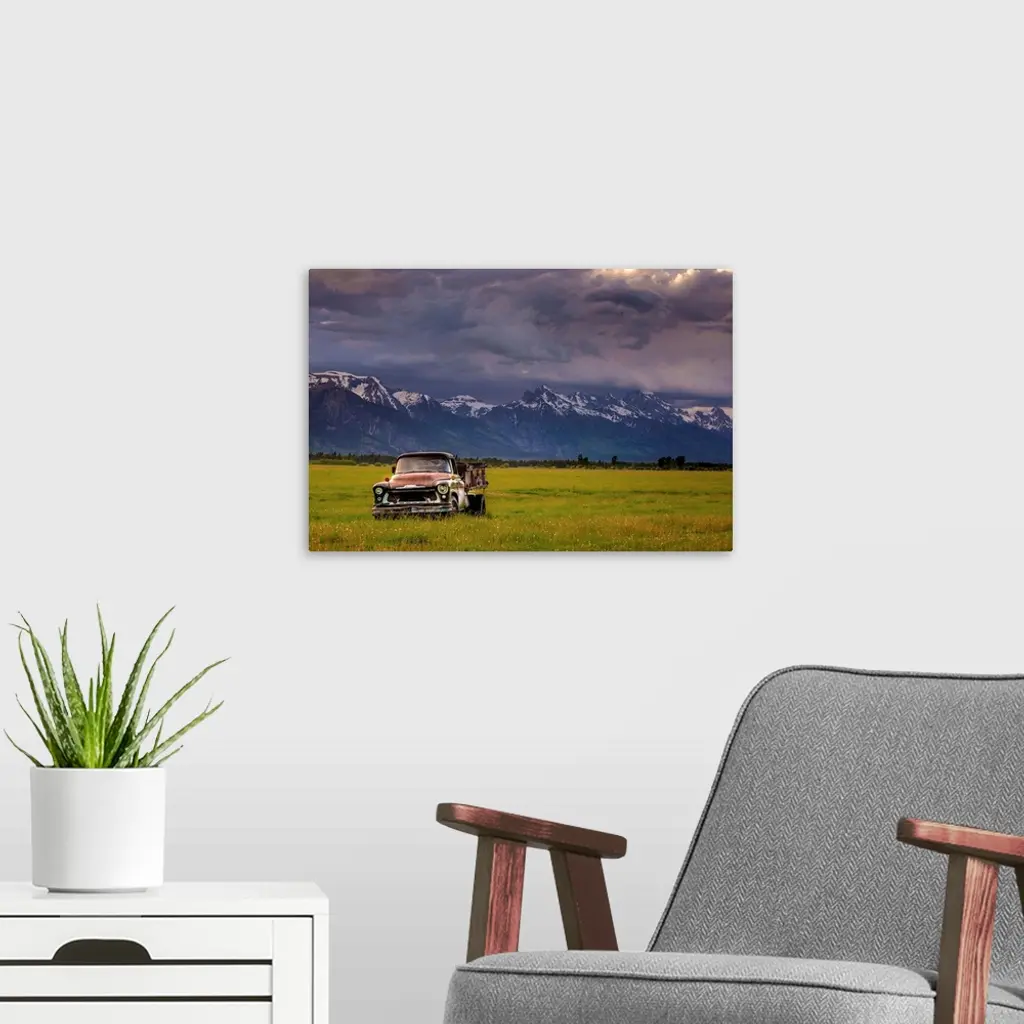 Landscape photograph of a yellow-green field with an old rusted truck and snow capped mountains in the background.
